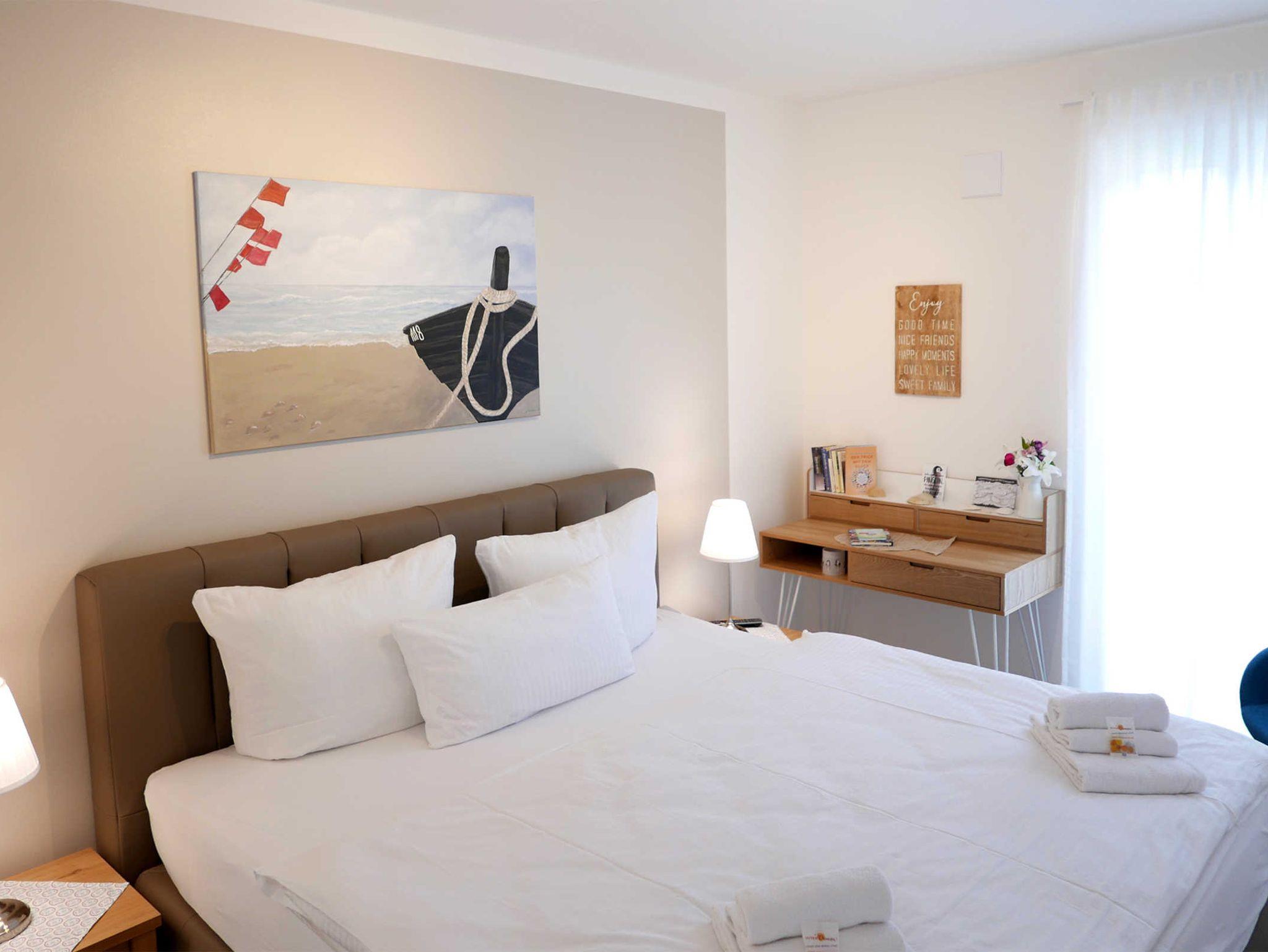 Das Schlafzimmer verfügt über ein Boxspringbett mit den Maßen 180 x 200 cm, sowie einen weiteren Fernseher und ausreichend Stauraum.