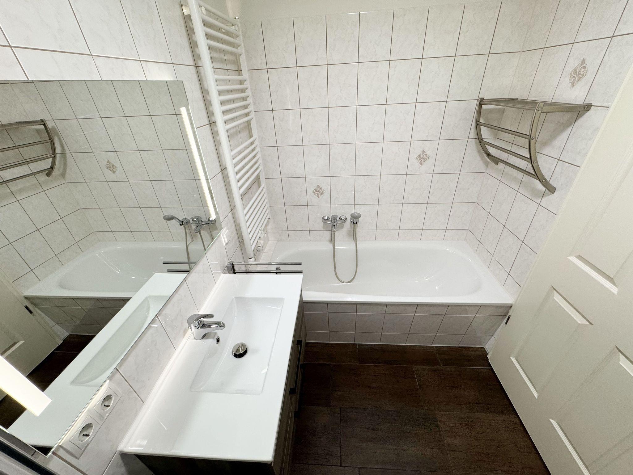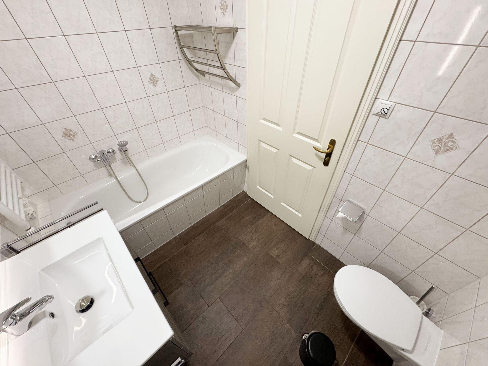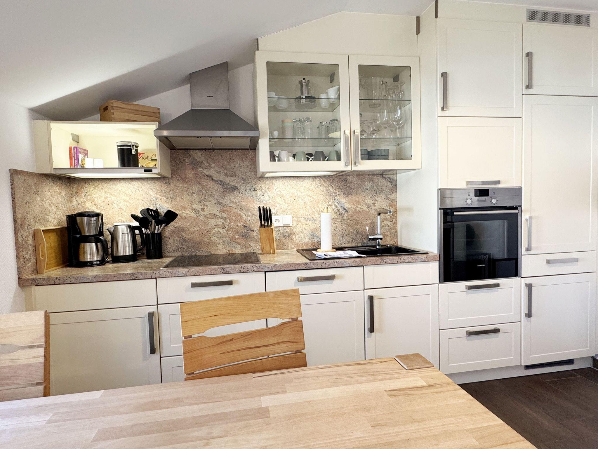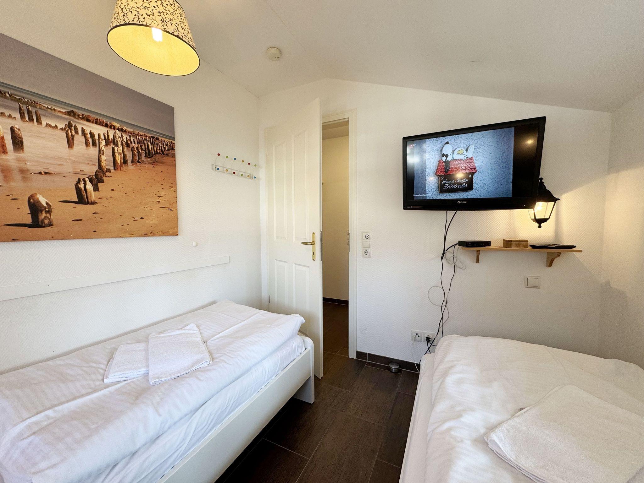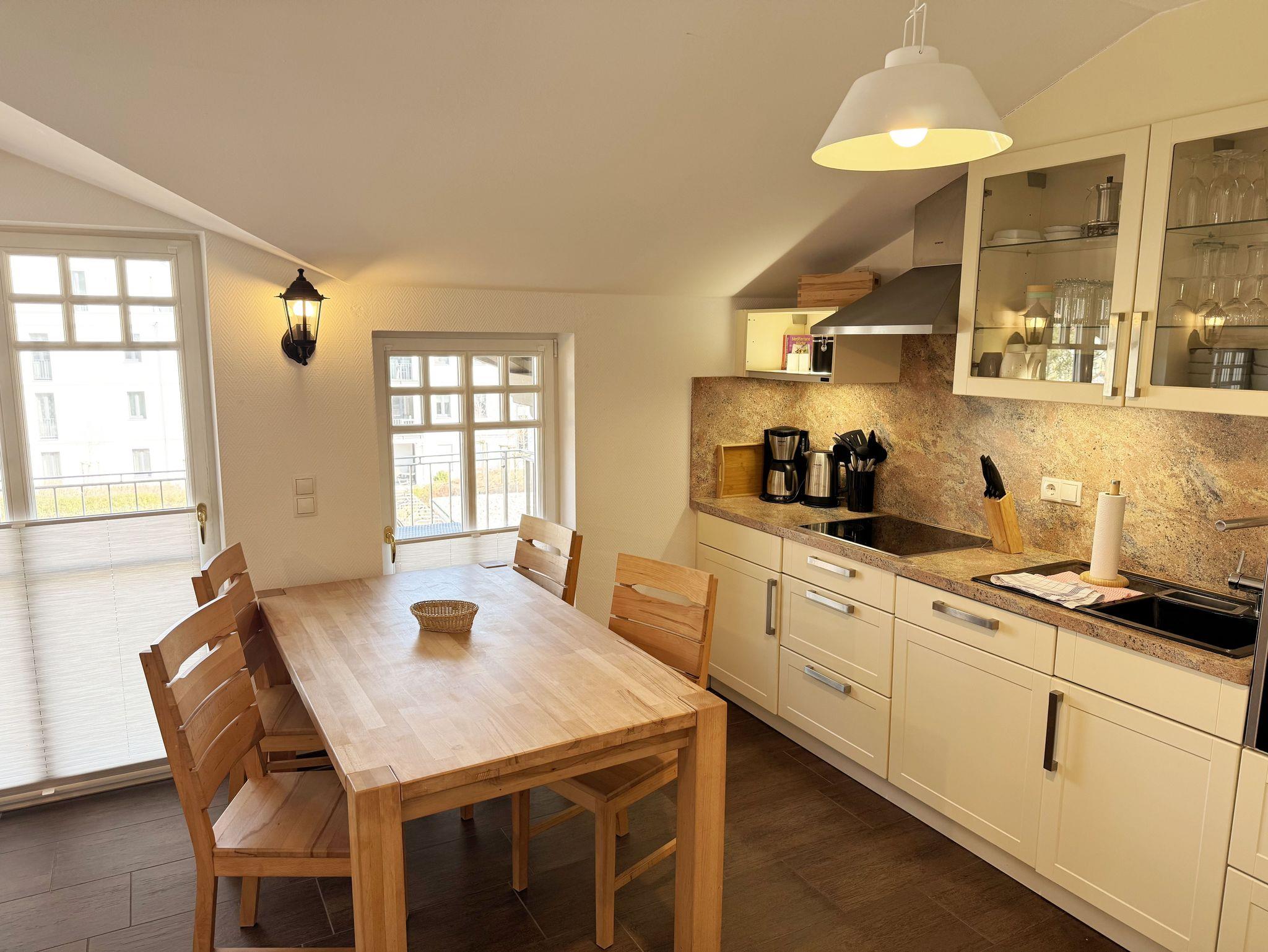 Die modern eingerichtete Nichtraucherferienwohnung 03 im Haus Strandkiefer befindet sich in der 1. Etage. Sie bietet Ihnen mit ca. 56 m² ausreichend Platz für 2 bis 4 Personen + 1 Kleinkind bis 3 Jahre im Kinderreisebett. Vom Flur mit Garderobe gelangen sie in alle Räumlichkeiten. Der helle Wohn-/Essbereich besticht mit seinen bodentiefen Holzfenstern und den Blick auf die Ostsee. Der Wohnbereich wurde mit einer Couch, einem Couchtisch, einem Sessel, einem TV-Board mit einem Smart-TV, einem WLAN-Zugang und einem Blu-Ray-Player ausgestattet. Abgerundet wird der Raum durch einen Kamin, der Ihnen gerade in der kälteren Jahreszeit, zusätzlich zur Fußbodenheizung, eine wohlige Wärme beschert. Die angrenzende Küchenzeile lässt keine Wünsche offen, so dass Sie mit einem Geschirrspüler, einem Backofen (selbstreinigend), einem Kühlschrank mit Gefrierfach, einem Cerankochfeld, einer Mikrowelle, einer Kaffeemaschine, einem Toaster, einem Wasserkocher, einem Mixer sowie diversen Küchenutensilien jede Mahlzeit zubereiten können. Zusätzlich finden Sie hier auch eine Waschmaschine mit Trocknerfunktion. Durch den Essplatz am Fenster wird der Bereich komplettiert. Ihr bestuhlter Balkon (Ost) erreichen Sie vom Wohnbereich, von wo Sie auch den Blick auf das Meer genießen können. Das große Schlafzimmer verfügt über ein Doppelbett (1,80m x 2,00m), verstellbare Lattenroste, Nachttischablagen mit Beleuchtung, einem großen Kleiderschrank und Verdunklungsplissees. Zusätzlich haben Sie auch von hier eine Möglichkeit auf einen weiteren Balkon (Nord) zu kommen. Das kleine Schlafzimmer verfügt über 2 Einzelbetten (0,90m x 2,00m), Nachttischablagen mit Beleuchtung, einem Flachbild-TV und Verdunklungsplissees. Das innenliegende Badezimmer ist mit einer Dusche (flacher Einstieg), einem WC, einem Waschtisch, einem Kosmetikspiegel, einem Fön und einer Badewanne ausgestattet. Ein Wäscheständer sowie Reinigungsutensilien runden die Ausstattung ab. Ihre mitgebrachten oder geliehenen Fahrräder können Sie im kleinen abschließbaren Fahrradschuppen neben dem Hauseingang unterbringen. Ihr PKW-Stellplatz (Nr.03) befindet sich direkt am Haus. 2 Haustiere sind gegen eine Gebühr gern gesehene Gäste. Die Erstausstattung eines Wäschepaketes (komplette Bettwäsche, 1 Duschhandtuch, 1 kleines Handtuch) können Sie bis 14 Tage vor Anreise gegen einen Aufpreis dazu buchen oder durch eigenes Ergänzen. Ab 2 gebuchten Paketen erhalten Sie einmalig 1 Geschirrhandtuch und 1 Duschvorleger hinzu.