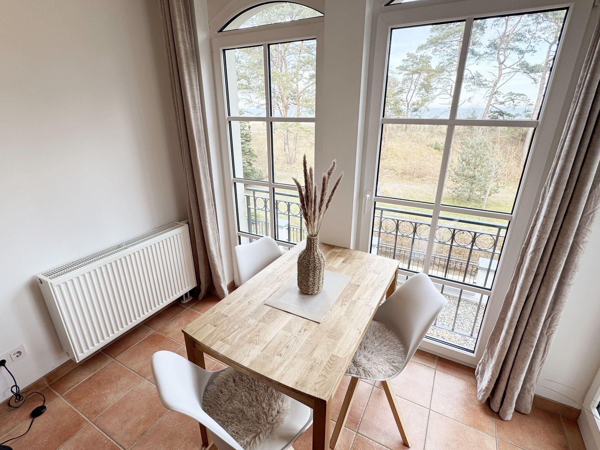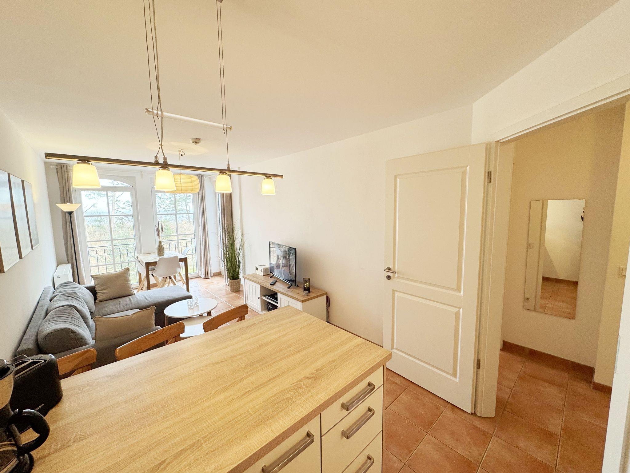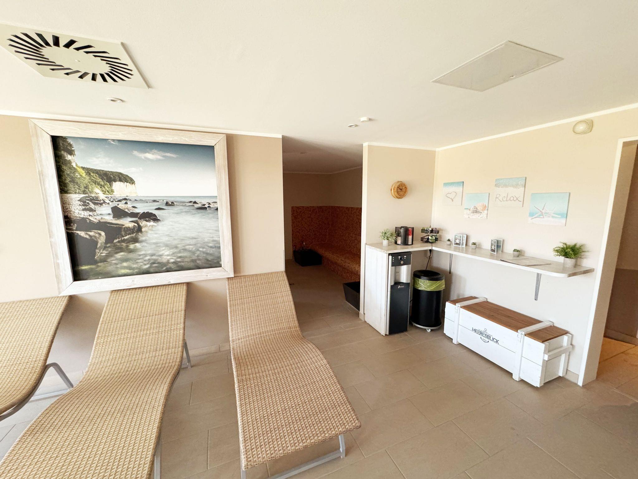 Die Appartementanlage Meeresblick im Ostseebad Baabe befindet sich ca. 80 m vom feinsandigen Ostseestrand entfernt. Ein idealer Ausgangspunkt um die Badesaison zu beginnen oder in der kälteren Jahreszeit die Ruhe durch ausgedehnte Spaziergänge am Strand zu genießen. Aber auch der Wellnessbereich im Haupthaus der Meeresblickanlage lädt zum Entspannen ein. Zwei große Saunabereiche mit Ruheraum, eine Wellnessdusche sowie ein beheizbarer Pool stehen Ihnen inklusive zur Verfügung. Die Wohnung (A 1.18) Ostseewelle befindet sich in der 1. Etage und kann bequem durch den Fahrstuhl erreicht werden. In ca. 3 Gehminuten erreichen Sie das Zentrum wo Sie verschiedene Restaurant und Cafés besuchen können. Von Ihrem Balkon haben Sie durch die Baumkronen der Kiefern teilweise Blick auf das Meer.