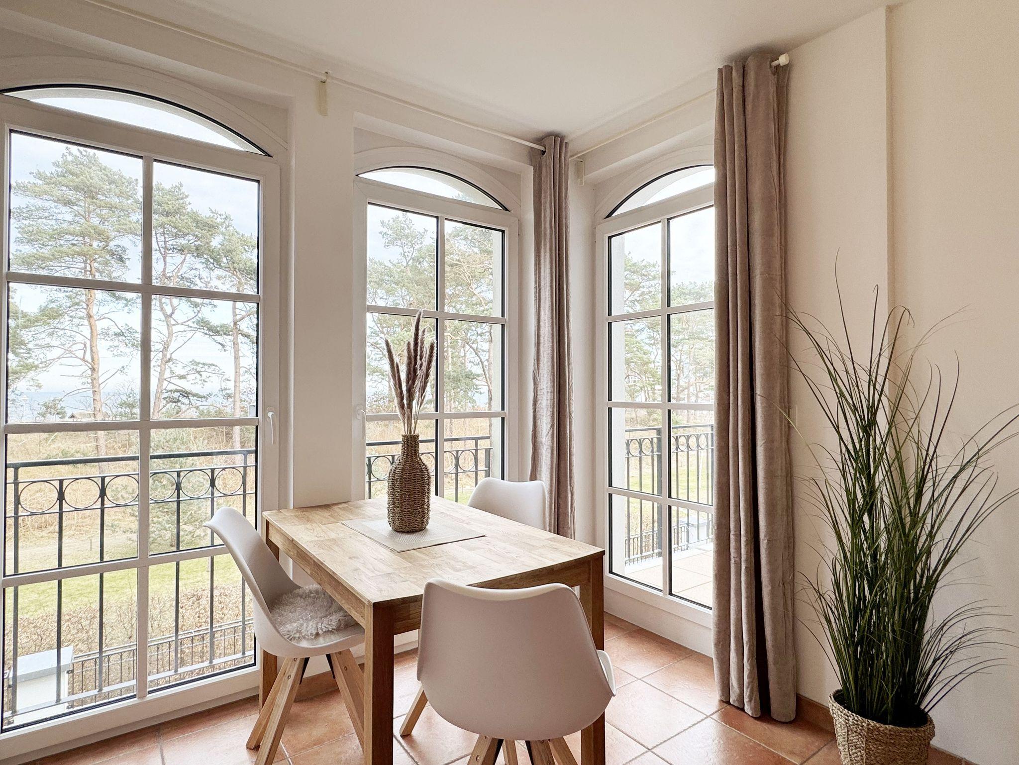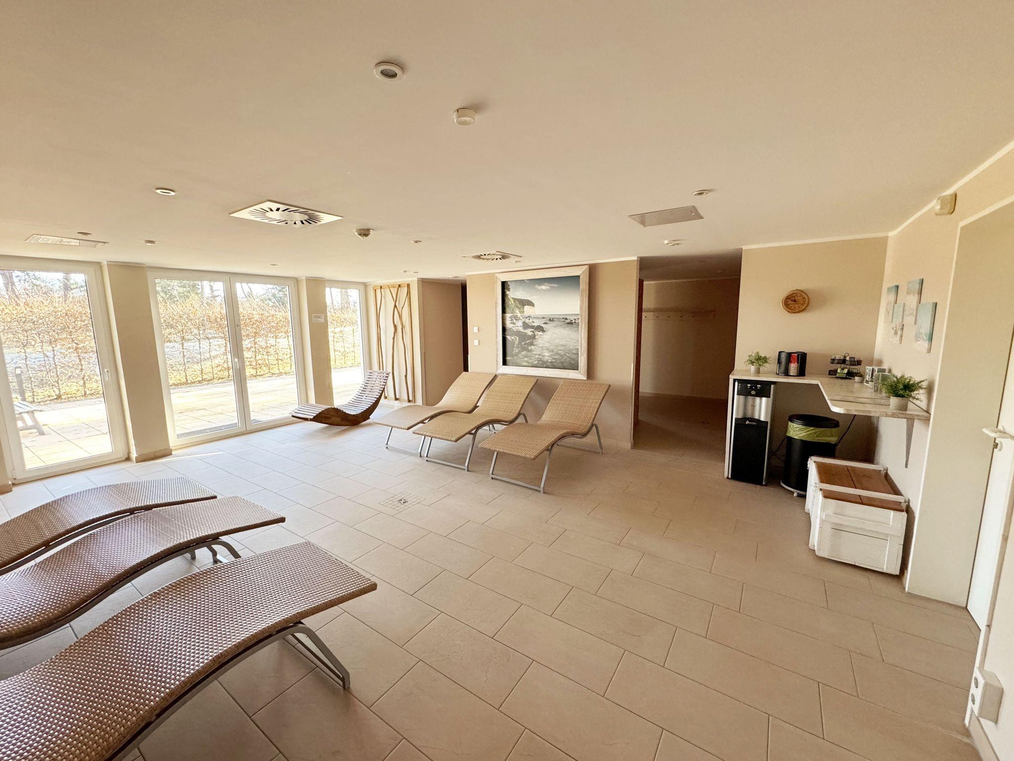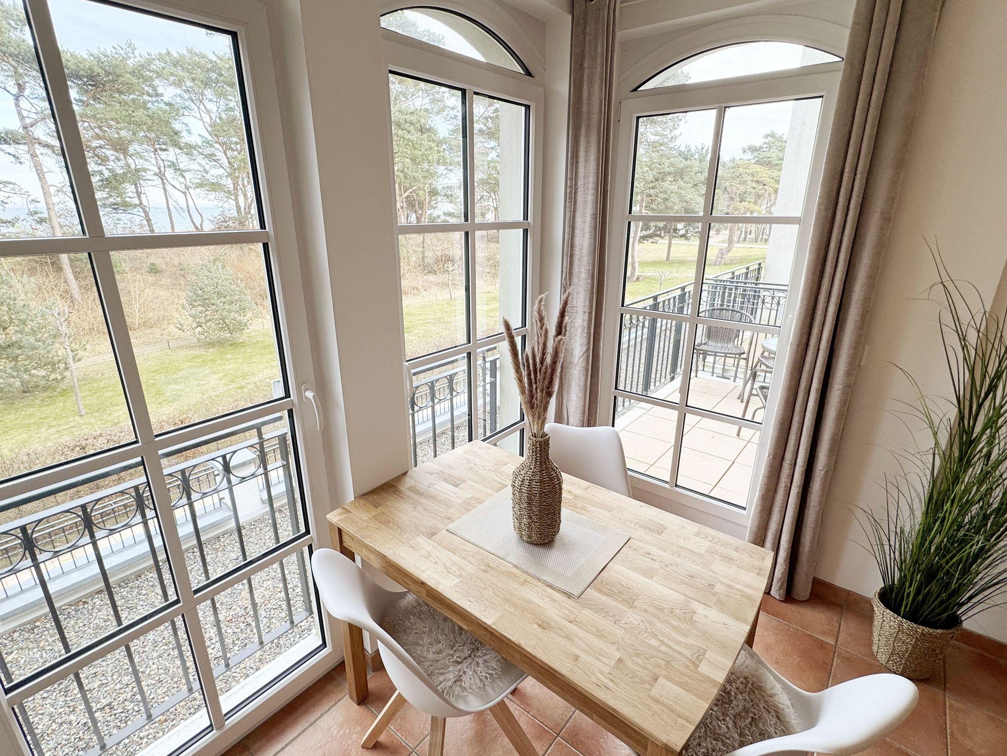 Die Appartementanlage Meeresblick im Ostseebad Baabe befindet sich ca. 80 m vom feinsandigen Ostseestrand entfernt. Ein idealer Ausgangspunkt um die Badesaison zu beginnen oder in der kälteren Jahreszeit die Ruhe durch ausgedehnte Spaziergänge am Strand zu genießen. Aber auch der Wellnessbereich im Haupthaus der Meeresblickanlage lädt zum Entspannen ein. Zwei große Saunabereiche mit Ruheraum, eine Wellnessdusche sowie ein beheizbarer Pool stehen Ihnen inklusive zur Verfügung. Die Wohnung (A 1.18) Ostseewelle befindet sich in der 1. Etage und kann bequem durch den Fahrstuhl erreicht werden. In ca. 3 Gehminuten erreichen Sie das Zentrum wo Sie verschiedene Restaurant und Cafés besuchen können. Von Ihrem Balkon haben Sie durch die Baumkronen der Kiefern teilweise Blick auf das Meer.