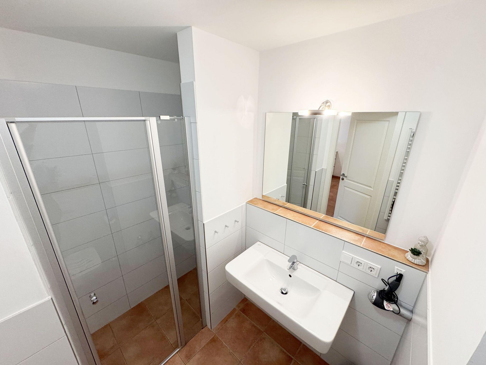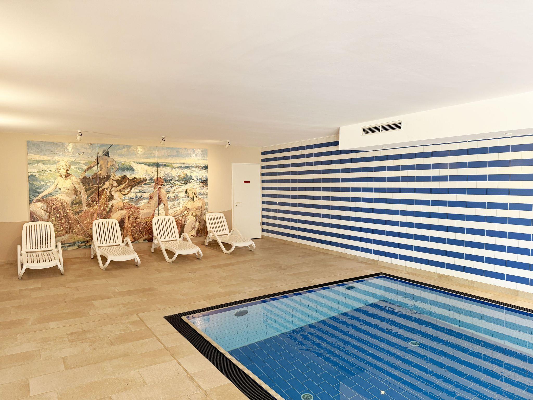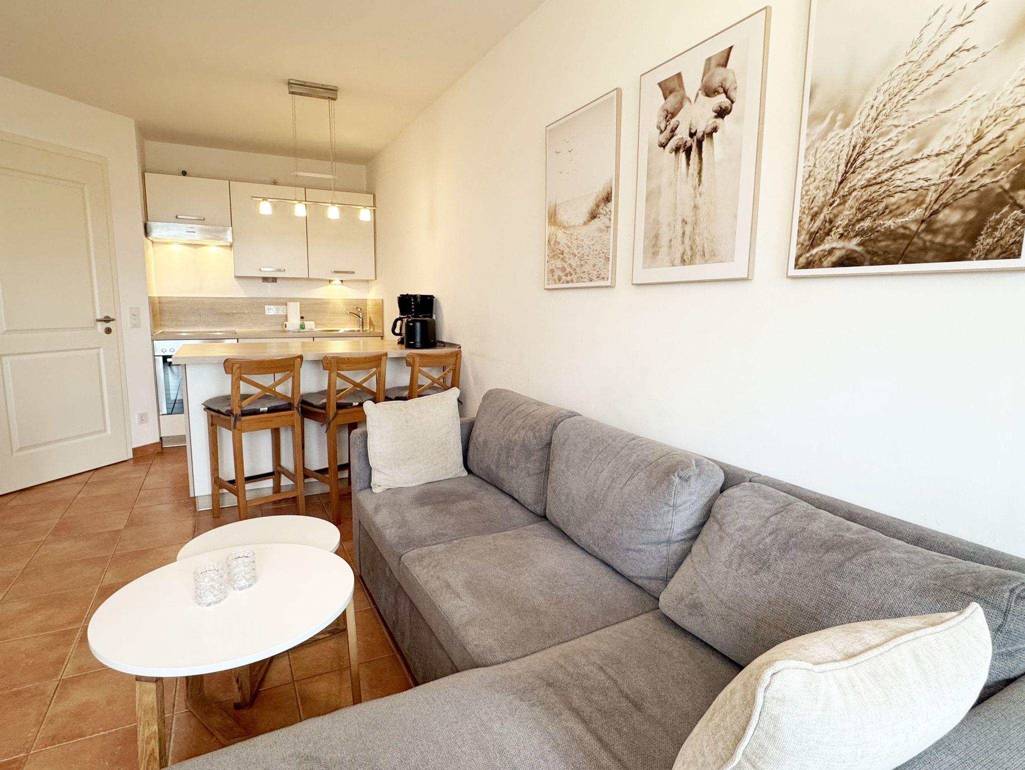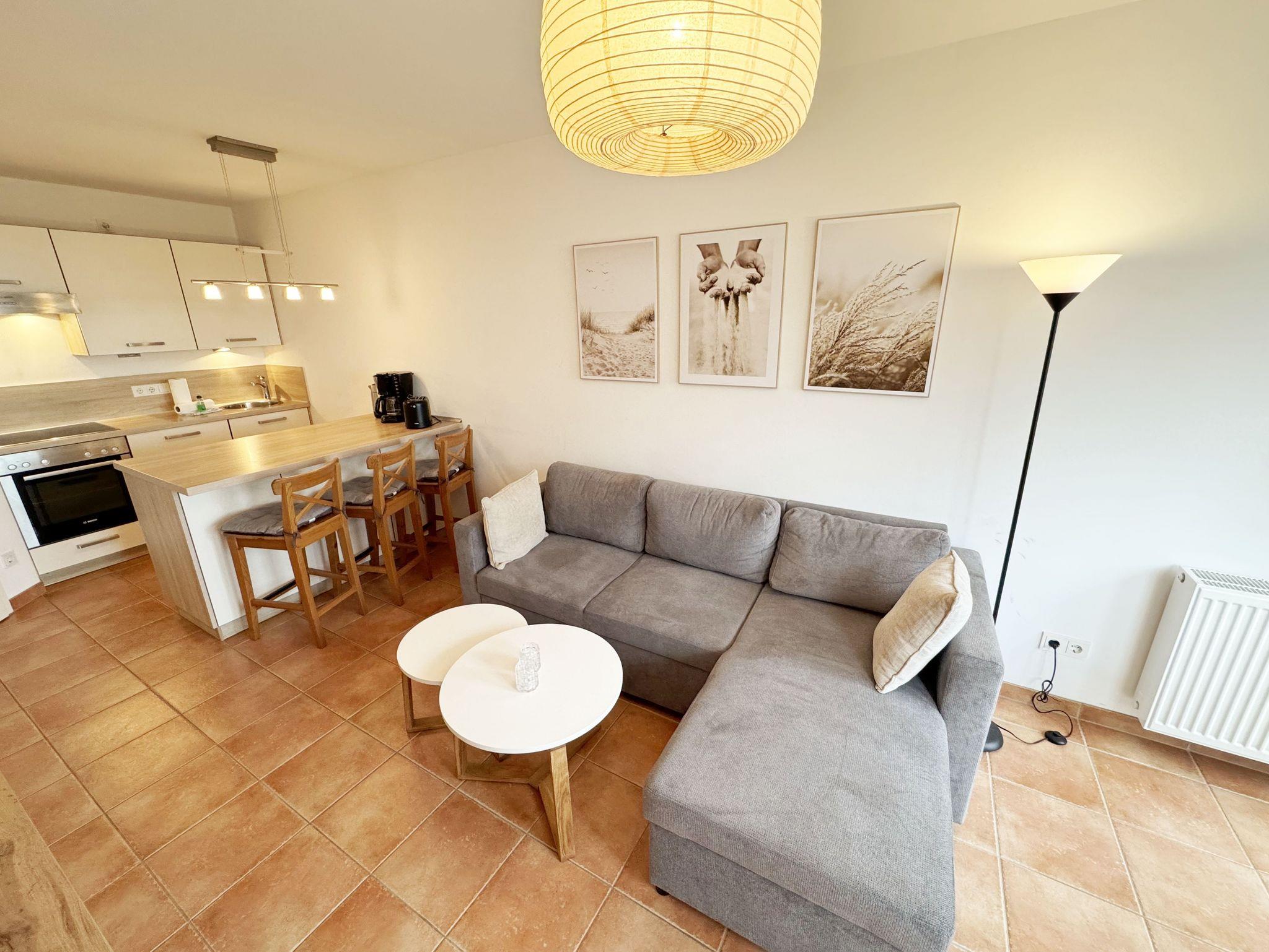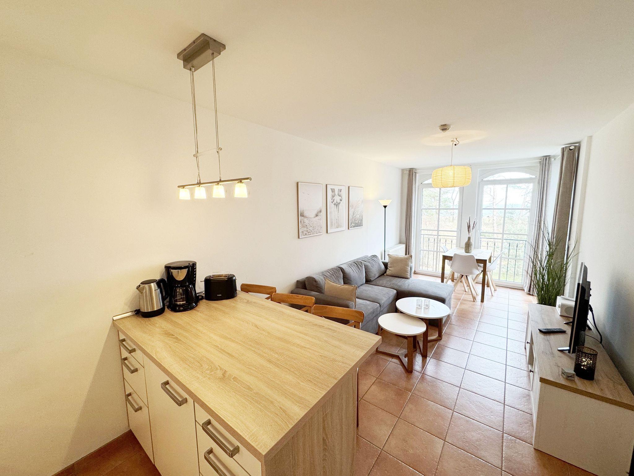 Die Nichtraucherferienwohnung „Ostseewelle“ (A 1.18) befindet sich in der Meeresblickanlage in der 1. Etage und bietet Ihnen ausreichend Platz für 2- 3 Personen. Mit Ihren ca. 42 qm wird alles abgedeckt was Sie für Ihren Urlaub und Ihre Erholung brauchen. Der helle Wohnbereich mit Zugang auf den bestuhlten Balkon, mit Blickrichtung zur Ostsee ist freundlich eingerichtet. Die integrierte Küchenzeile verfügt über einen Geschirrspüler, Backofen mit 4 Zonen-Ceranfeld, Kühlschrank mit 3-Sterne Eisfach, Kaffeemaschine, Toaster, Wasserkocher sowie diverse Küchenutensilien. Angrenzend haben Sie hier Ihren Essbereich mit 3 dazugehörigen Barhockern, die Ihnen ein gemütliches Ambiente bieten. Die Eckcouch mit Schlaffunktion für die 3. Person (1,20m x 1,95m) passt sich mit dem Sideboard dem Smart-TV + DVD-Player und der Mini-Stereo-Anlage mit DAB-Radio perfekt an. Das Schlafzimmer mit massiven Holzmöbeln vom Doppelbett (1,80 m x 2,00 m), Kleiderschrank bis hin zu Nachtischkonsolen bietet Ihnen einen angenehmen Schlaf und Wohlbefinden. Das geflieste Bad mit Dusche, Waschtisch, Kosmetikspiegel, Fön und WC runden den Raum ab. Auf einen Internetanschluss WLAN müssen Sie im Urlaub nicht verzichten. Dieser ist für Sie inklusive. Ein eigener PKW-Stellplatz (Nr.43, Einfahrtshöhe 2,00m) befindet sich in der Tiefgarage des Hauses. Im Keller des Hauses haben Sie die Möglichkeit eine Waschmaschine/Trockner gegen Gebühr zu nutzen. Mit dem Fahrstuhl des Hauses A gelangen sie in das Untergeschoss der Meeresblickanlage, wo Sie ein großzügiger und heller Wellnessbereich erwartet. Hier können sie in einem Pool kleine Bahnen schwimmen, in 2 Saunen Ihren Kreislauf in Schwung bringen, in einem dazugehörigen Ruheraum Ihren Körper wieder beruhigen, in einer Schneckendusche sowie weiteren Duschen das kühle Nass genießen und auf einer Außenterrasse mit Außendusche die frische Luft einatmen. Die Erstausstattung eines Wäschepaketes (komplette Bettwäsche, 1 Duschhandtuch, 2 kleine Handtücher) können Sie bis 14 Tage vor Anreise gegen einen Aufpreis dazu buchen oder durch eigene ergänzen. Ab 2 gebuchten Paketen erhalten Sie einmalig 1 Geschirrhandtuch und 1 Duschvorleger hinzu.