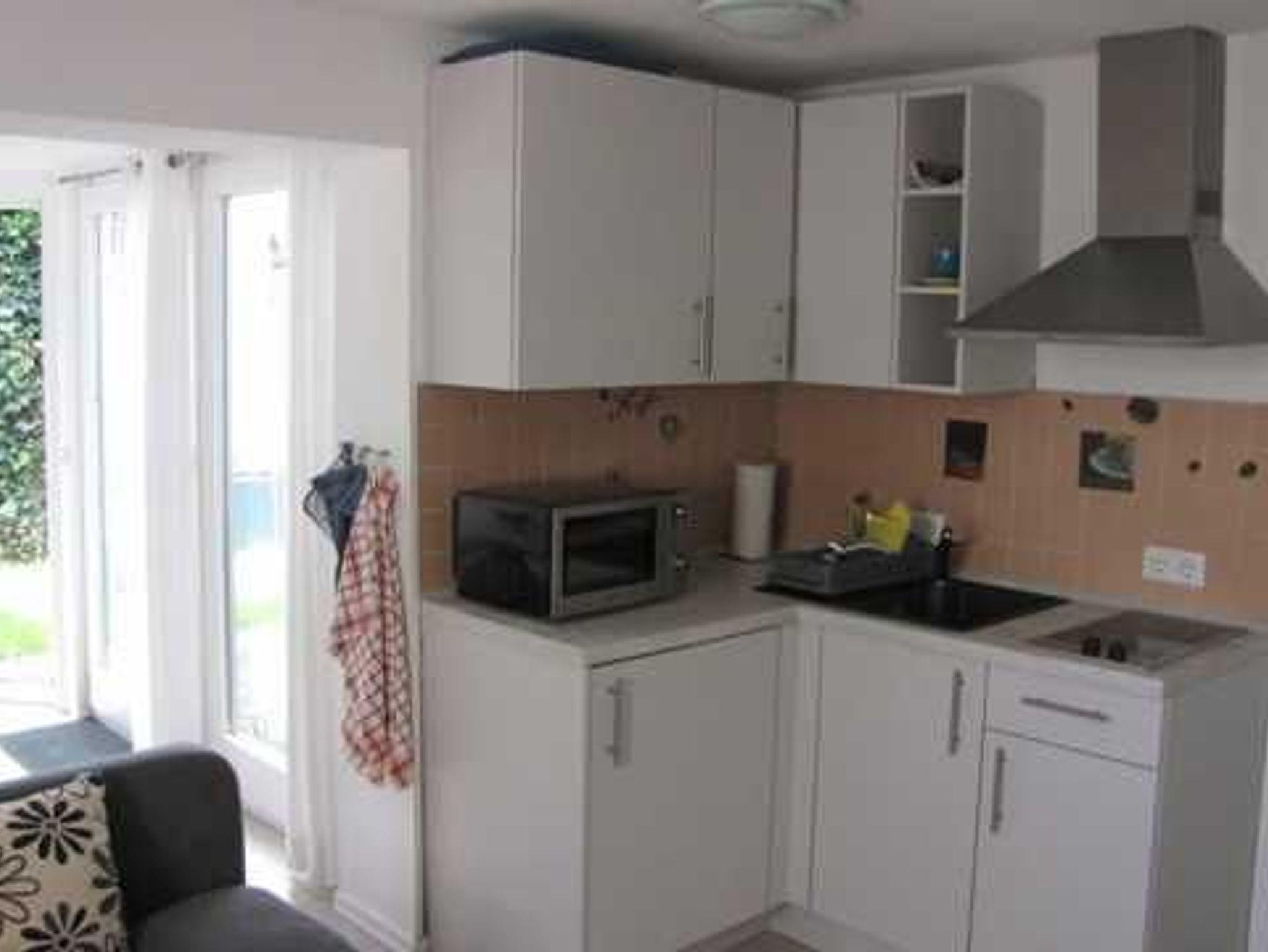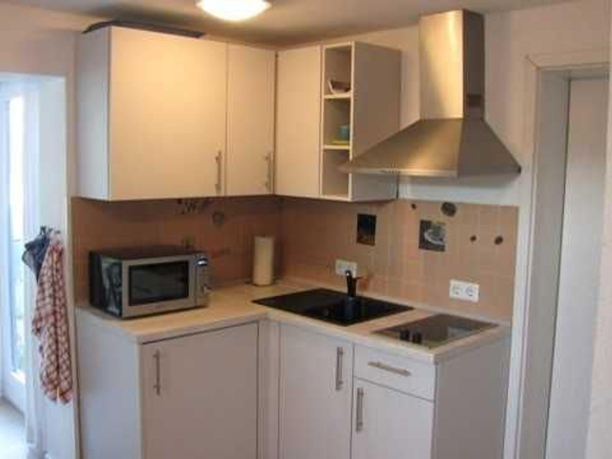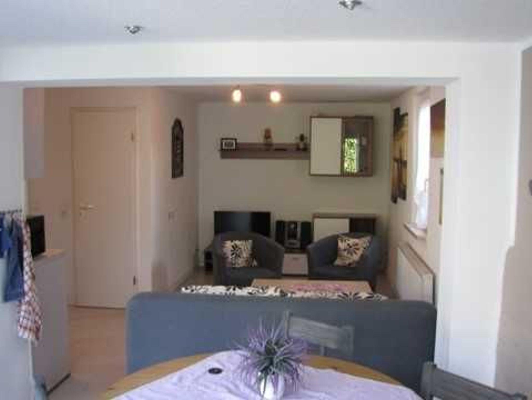 • Wohnzimmer mit Sitzmöglichkeit, TV und einer integrierten Pantryküche mit zwei Herdplatten, Kühlschrank, Kaffeemaschine, Toaster, Mikrowelle, Wasserkocher und diverse Küchenutensilien