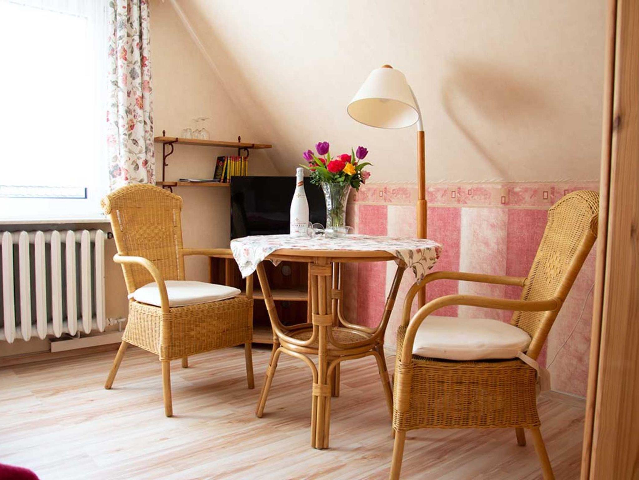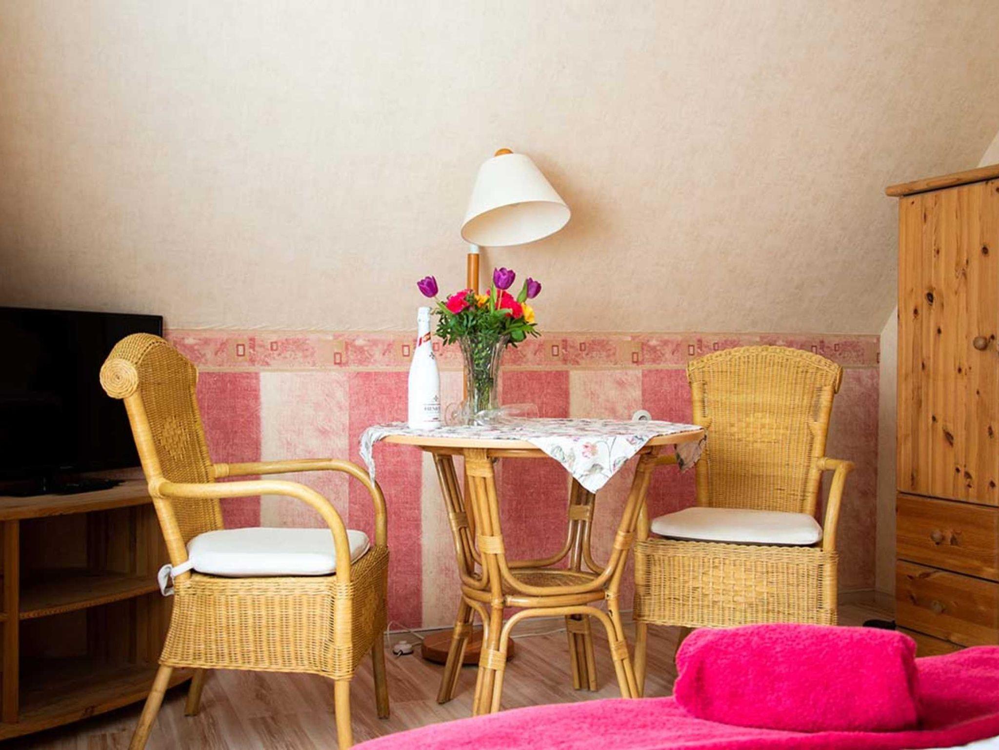 Das helle ein Zimmerappartement liegt im ersten Stock und bietet Ihnen einen Flachbild-TV, eine Sitzecke mit Tisch und zwei Stühlen, separate Küche und ein eigenes Badezimmer.