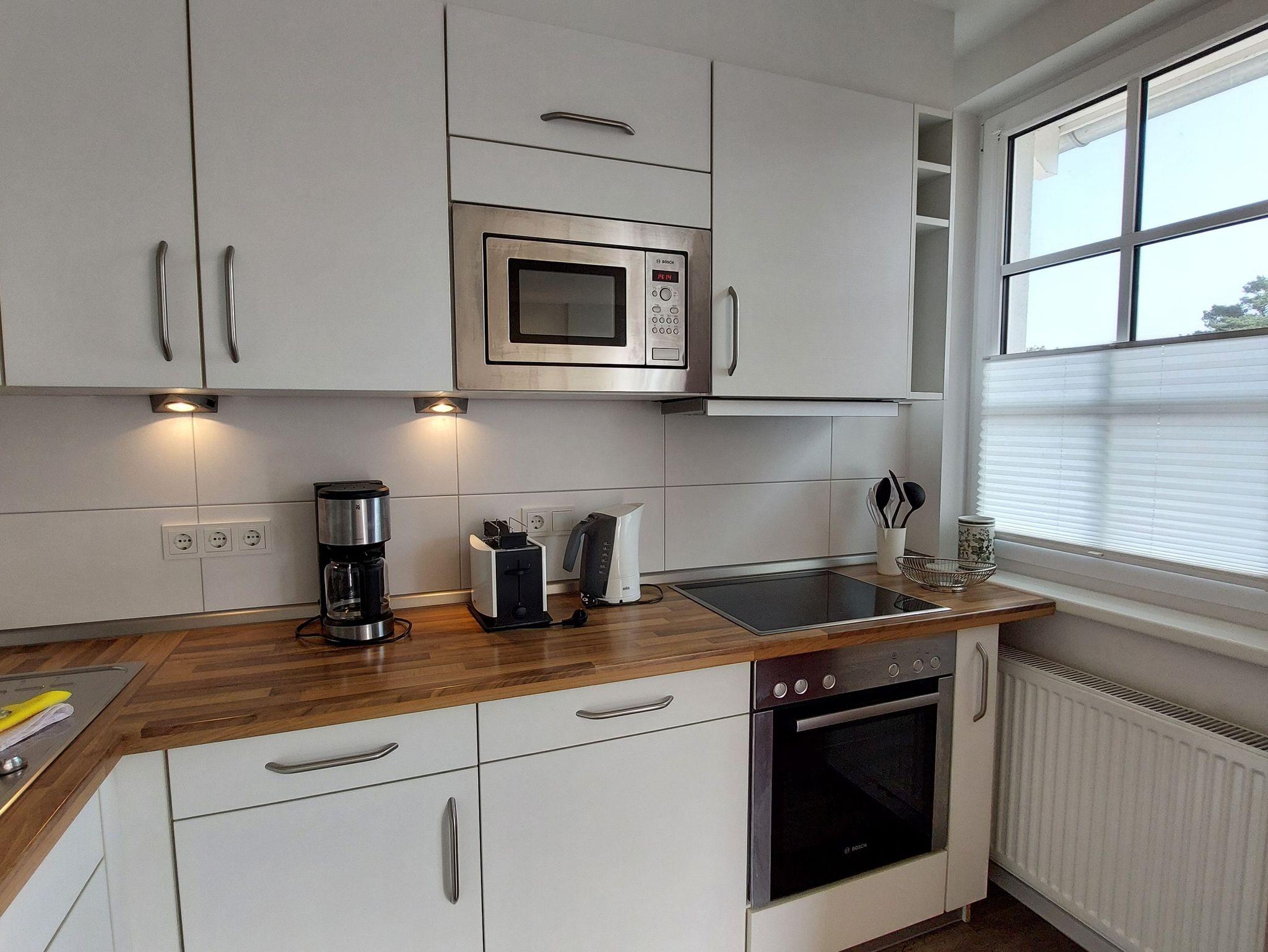 Großzügig geschnitten und ausgestattet ist die Küchenzeile mit einem 4-Plattenherd inklusive Backofen, einem Kühlschrank mit Gefrierfach, einem Geschirrspüler, Mikrowelle, Toaster und Kaffeemaschine.