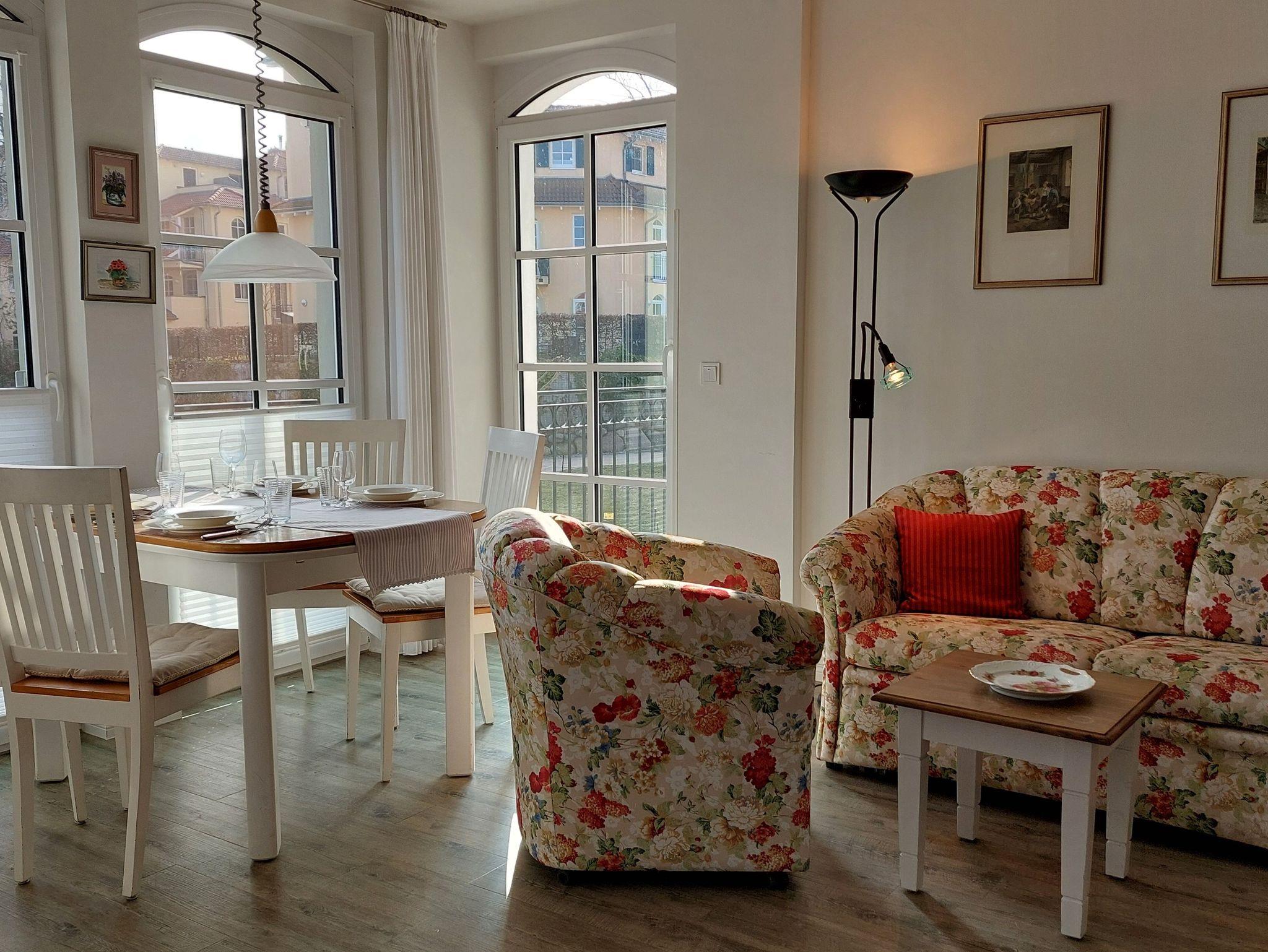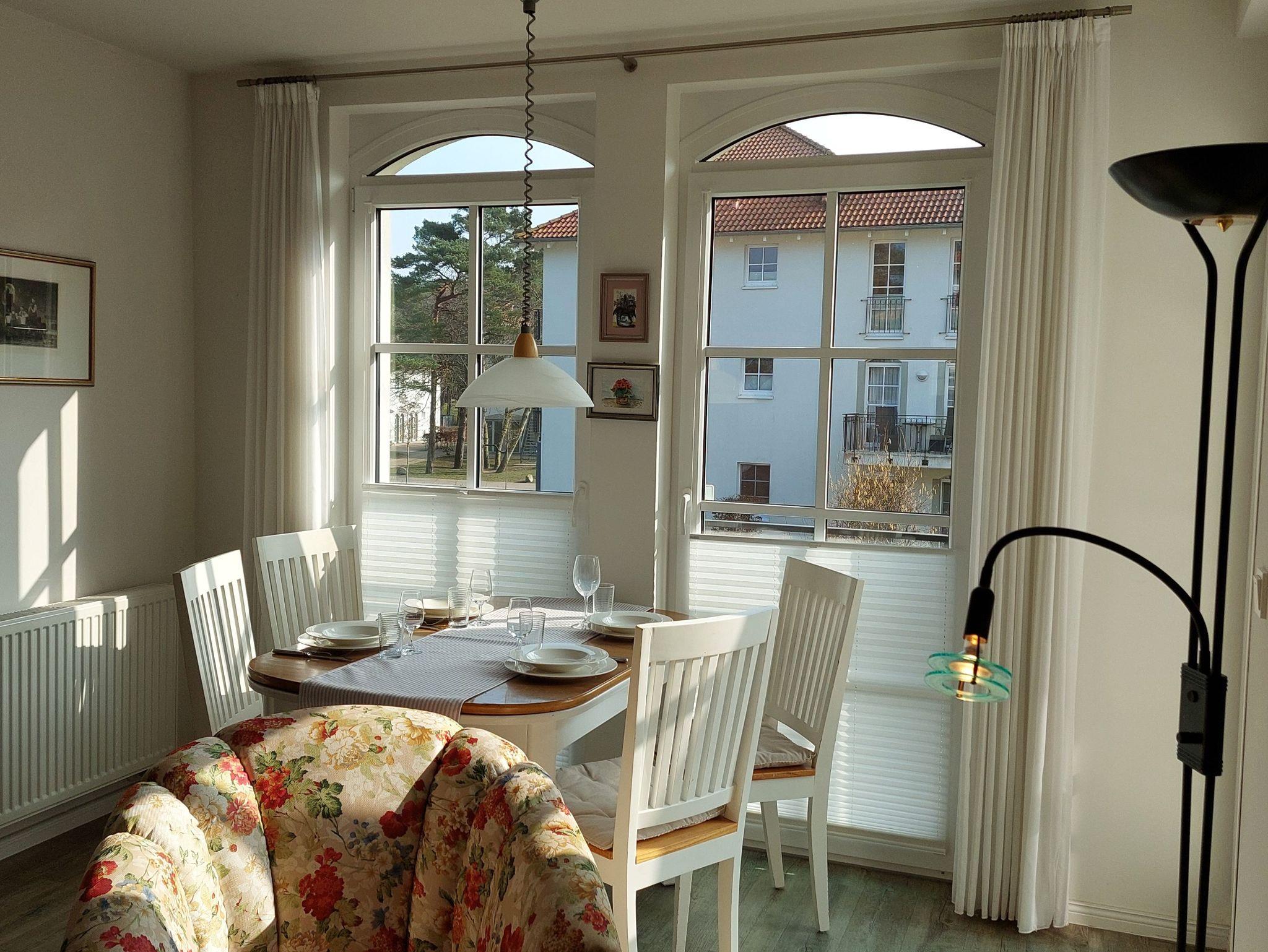 Sonnige Ferienwohnung für 2 - 3 Personen mit 2 Schlafzimmern und schönen möbliertem Balkon mit Blick zum Kurpark, WLAN vorhanden. Die Ferienwohnung liegt in der 1. Etage des Hauses. Das erst 2013 neu eröffnete Haus Meeresblick mit Schwimmbad, Massage- und Saunabereich liegt direkt am Strand von Baabe.