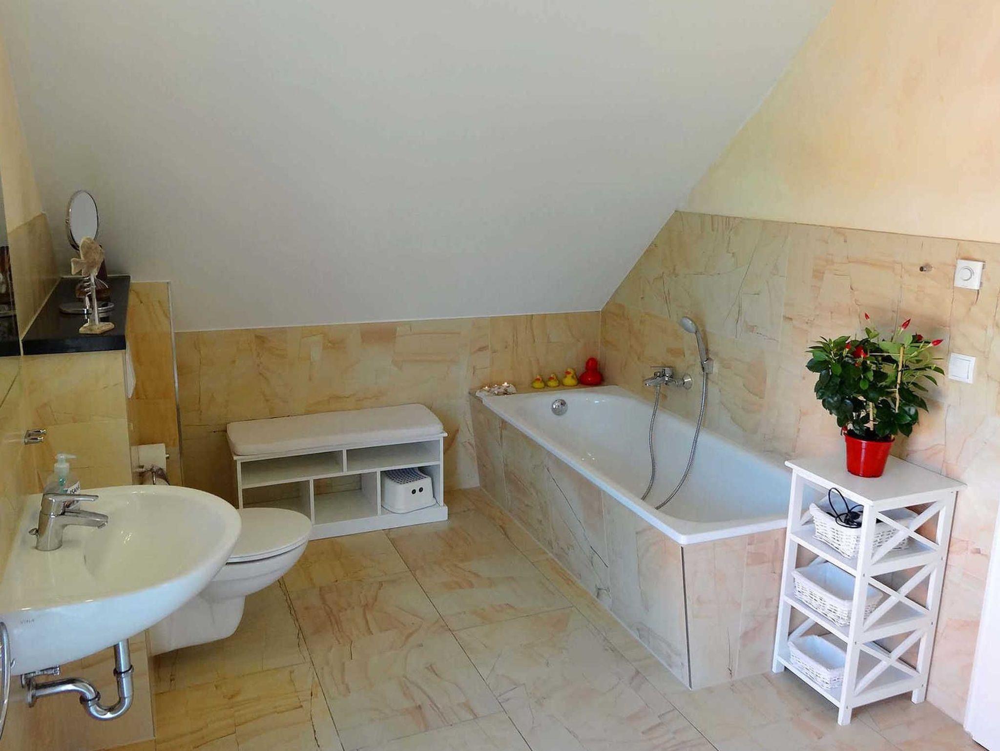 Über 2 Etagen verteilen sich 3 Schlafzimmer, 2 Bäder, ein großer Wohnraum mit amerikanischer Küche sowie ein separater Essplatz (hauseigene Kinderstühle vorhanden). Alle Räume sind mit Fußbodenheizung, Insektenschutzgittern und elektr. Rollläden ausgestattet. Im Erdgeschoss befindet sich der gemütliche Wohnraum mit großem Relax-Sofa (inkl. Schlaffunktion), Smart TV (50 und HD+), DVD-Player, Musikanlage(CD + USB + Bluetooth), kostenfreier WLAN-Zugang und Kamin (inkl. Holz). Die Küche ist komplett mit Backofen, Ceranfeld, Mikrowelle, Kühl-/Gefrierkombination, Geschirrspüler, Toaster, Kaffeemaschine, Wasserkocher und anderen diversen Küchenhelfern ausgestattet. Im Erdgeschoss befindet sich ein Badezimmer mit Dusche, WC und Waschtisch. Das große Badezimmer im Obergeschoss ist zusätzlich zur Dusche, Fön, WC und Waschtisch mit einer gemütlichen Badewanne ausgestattet. Zwei geräumige Schlafzimmer sind mit einem Doppelbett (1,9 x 2,0m) und großem Kleiderschrank, Radiowecker, Flachbild-TV (32) sowie Kinderbett (0,7 x 1,4m) bzw. einer Schlafcouch ausgestattet. Das 3. Schlafzimmer ist als Kinderzimmer eingerichtet mit 2 Einzelbetten (1,0 x 1.9m). Zusätzliche Ausstattungsmerkmale: Waschmaschine, Bügelbrett, Bügeleisen, Buggy, Babyphone, Bollerwagen, Roller, Spieletisch (Billard, Hockey, Kicker, Tischtennis, Brettspiele).[nbsp] Garten Highlights: Hängematte, Sonnenliegen, Strandkorb, Holzkohlegrill sowie das hauseigene Saunahaus (gegen Gebühr) und Spieleturm mit Rutsche + Schaukeln. Es gibt für Sie kostenfreie Park- [&] Fahrradabstellmöglichkeiten (1x Carport, 1x vor Gartenhaus).