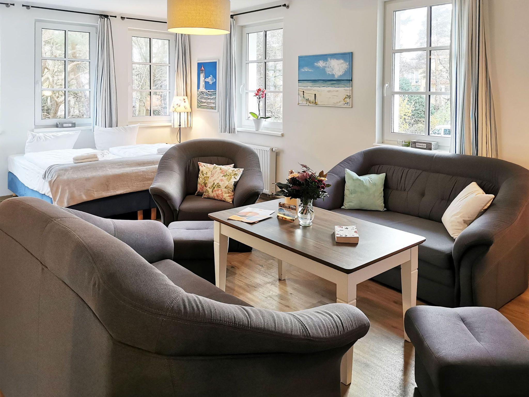 Herrliche große Ferienwohnung für bis zu 6 Personen inkl. Meerblick und Meeresrauschen direkt am Strand von Baabe. Auf 90 qm befinden sich 2 geräumige Schlafzimmer mit je einem Dopplebett, ein Bad und ein großes Wohnzimmer mit einem hochwertigen Doppelbett in der Nische. In den Wohnbereich integriert ist zudem eine gut ausgestattete Küche mit Geschirrspülmaschine. Wie alle Wohnungen im Inselparadies ist auch diese Ferienwohnung mit hellen freundlichen geweißten Holzmöbeln eingerichtet. Genießen Sie das Meeresrauschen und den Blick auf Ihren schönem Balkon. WLAN vorhanden.