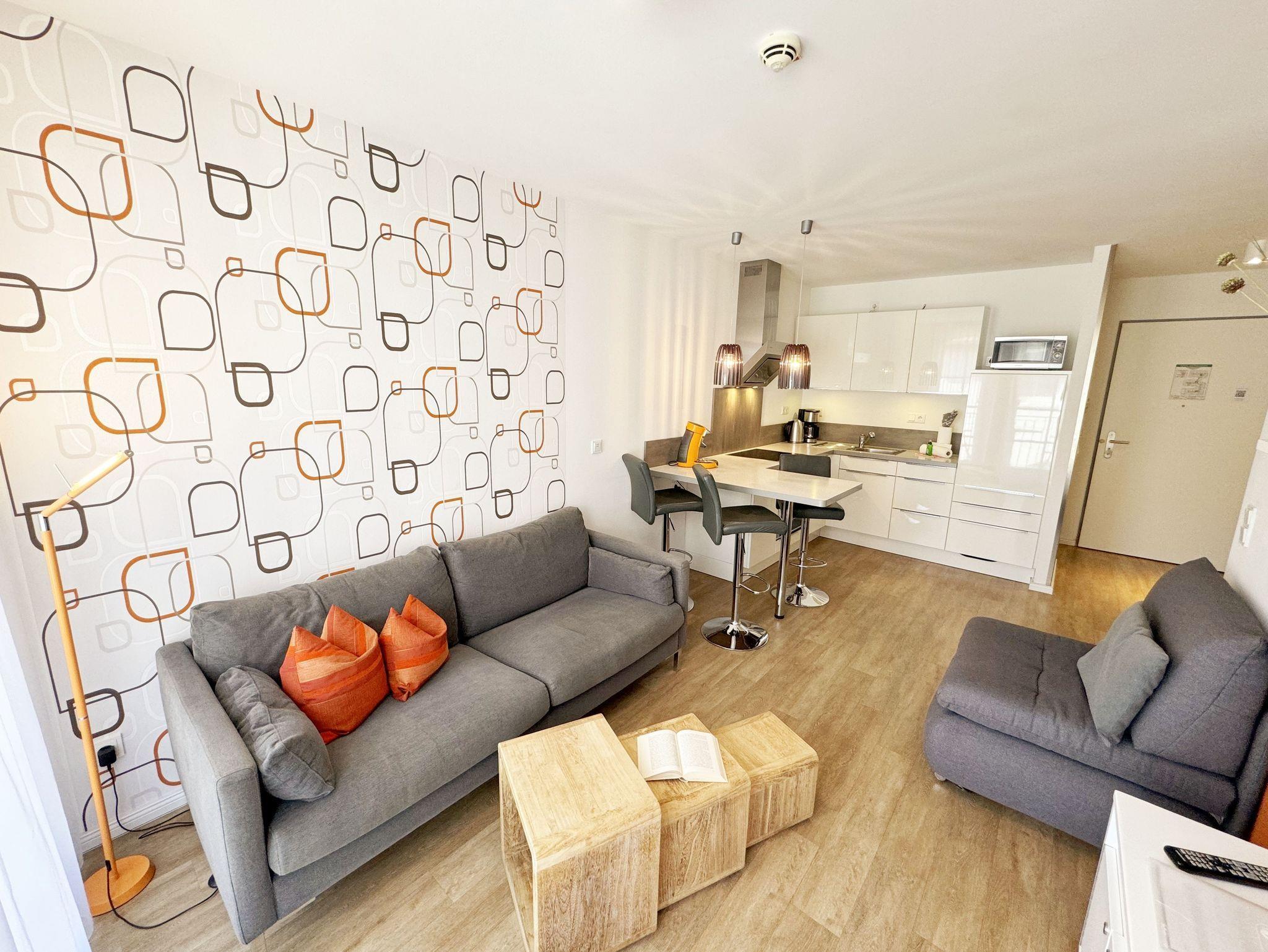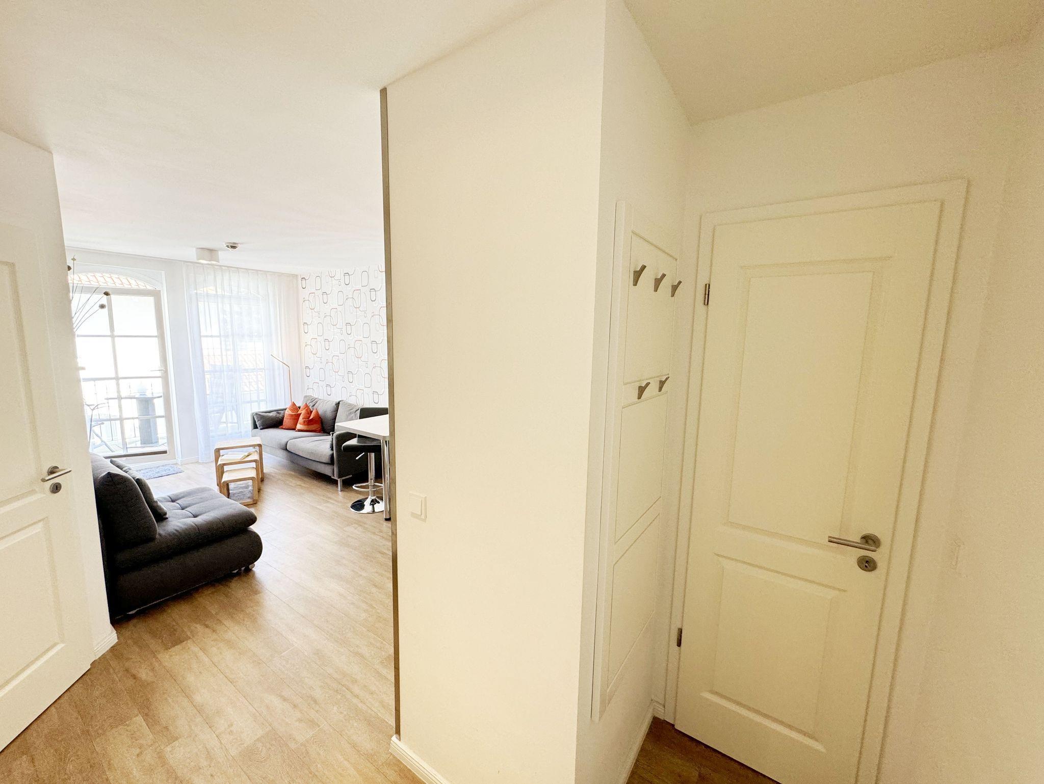 Ihre Nichtraucher/Ferienwohnung ist mit viel Liebe zum Detail ausgestattet und eingerichtet. Sie wohnen in einer ca. 40 m² 2-Zimmerwohnung, die ideal für 2 Personen ist. Die Wohnung A 2.05 befindet sich in der 2. Etage und ist per Fahrstuhl bequem zu erreichen. In der Wohnung finden Sie einen kombinierten Wohn-/Koch- und Essbereich. Die integrierte Küchenzeile lässt mit Mikrowelle, Backofen, Ceranfeld, Spülmaschine, Kühlschrank mit Gefrierfach, Kaffeemaschine, Toaster, Wasserkocher und anderen praktischen Helfern keine Wünsche offen. Im Wohnbereich ist weiterhin eine Essecke sowie eine gemütliche Couch mit LED-TV und DVD-Player. Auch auf einen Internetanschluss (WLAN/LAN) müssen Sie nicht verzichten! Dieser ist für Sie inklusive. Der Balkon ist vom Wohn-/Essbereich begehbar und komplett möbliert. Von hier aus haben Sie einen Blick in Richtung Inselparadies und teilweise Meerblick. Das Schlafzimmer ist mit einem Boxspringbett (1,80 m x 2,00 m), Nachttischkonsolen, einem Kleiderschrank und LED-TV ausgestattet. Das Bad verfügt über eine ebenerdige Dusche, Waschbecken, Fön, WC und Handtuchheizkörper. Im kleinen Abstellraum befinden sich unteranderem Reinigungsutensilien sowie ein Wäscheständer. Ein eigener PKW-Stellplatz Nr. 71 (Einfahrtshöhe 2,00m) befindet sich in der Tiefgarage des Hauses. Im Keller des Hauses haben Sie die Möglichkeit eine Waschmaschine/Trockner gegen Gebühr zu nutzen. Ein Haustier ist gegen eine Gebühr ein gern gesehener Gast, dazu stehen ein Hundenapf sowie ein Schlafplatz zur Verfügung. Mit dem Fahrstuhl des Hauses A gelangen sie in das Untergeschoss der Meeresblickanlage, wo Sie ein großzügiger und heller Wellnessbereich erwartet. Hier können sie in einem Pool kleine Bahnen schwimmen, in 2 Saunen Ihren Kreislauf in Schwung bringen, in einem dazugehörigen Ruheraum Ihren Körper wieder beruhigen, in einer Schneckendusche sowie weiteren Duschen das kühle Nass genießen und auf einer Außenterrasse mit Außendusche die frische Luft einatmen. Die Erstausstattung eines Wäschepaketes (komplette Bettwäsche, 1 Duschhandtuch, 2 kleine Handtücher) können Sie bis 14 Tage vor Anreise gegen einen Aufpreis dazu buchen oder durch eigene ergänzen. Ab 2 gebuchten Paketen erhalten Sie einmalig 1 Geschirrhandtuch und 1 Duschvorleger hinzu.