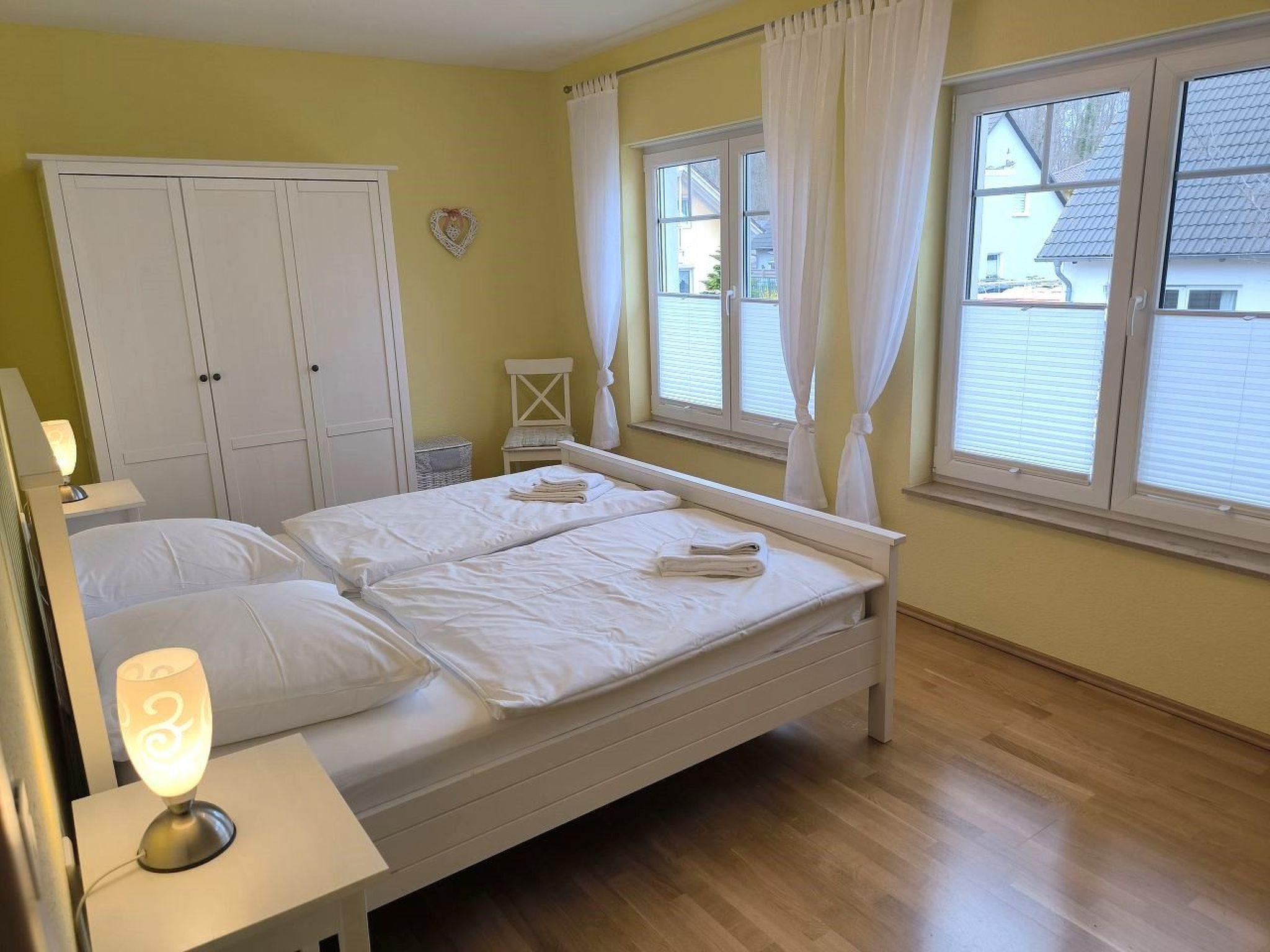 The Haus Ostseeblick, newly built in 2012, is located on a hillside with a sea view over the south beach at the entrance to Göhren in Feldstraße 1a and 1b. The fine sandy north beach with the amber promenade and the natural beach (south beach) can be easily reached in about 10 minutes on foot. The town centre is just a few minutes' walk away. The generously proportioned 3-room flat is modern and furnished to a high standard and has a balcony with a wonderful view of Göhren's south beach. Bicycles can be stored outside the house in a bicycle shed. One free parking space per flat is available for each guest directly at the house. Free W-LAN available in the flat. Living space: 82 m² 3-room flat Large entrance area with cloakroom, shoe cupboard and safe. Spacious living area with leather suite and coffee table, sideboard with large flat-screen TV, CD radio system and dining table with 4 chairs. Fitted kitchen integrated into the living room, equipped with: 4-ring ceramic hob, large oven, extractor bonnet, microwave, large fridge with freezer compartment, dishwasher, toaster, coffee machine, kettle and high-quality kitchen utensils. 2 bedrooms, each with a double bed (180 x 200 cm) and large wardrobe. One bedroom with flat-screen TV. 1 bathroom with large walk-in shower, washbasin, WC and hairdryer. Balcony with garden furniture. Iron and ironing board available. The entire flat is equipped with underfloor heating. Non-smoking! (But you are welcome to smoke on the balcony).
