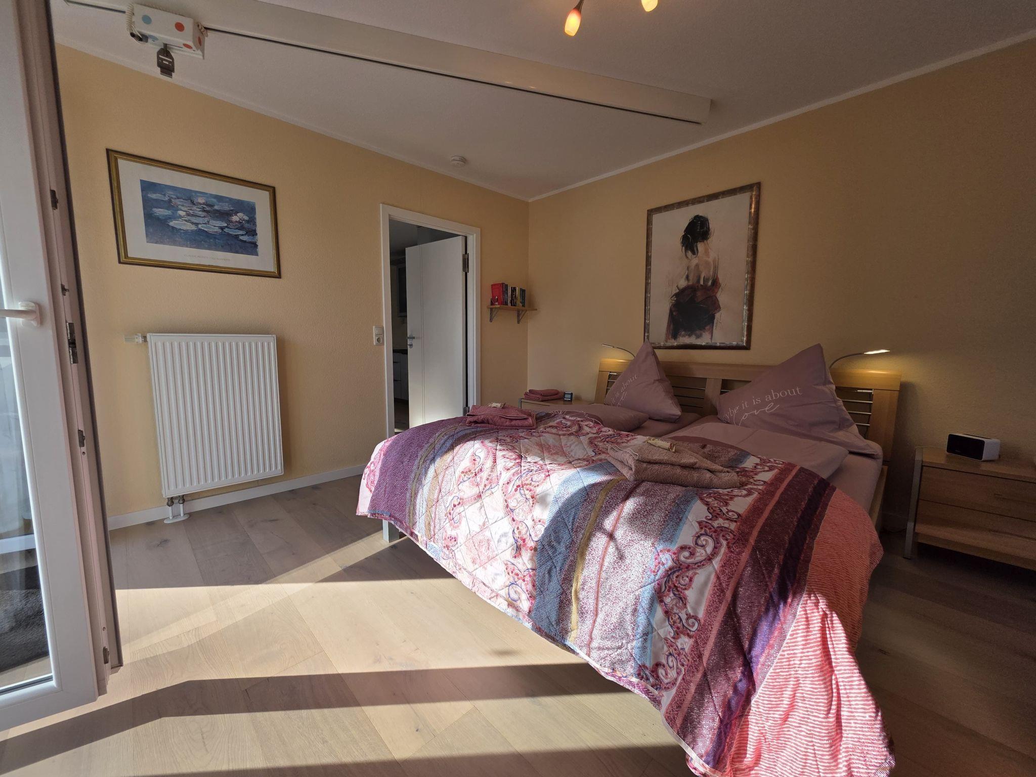 The large living area has a fitted kitchen with electric cooker, dishwasher, kettle, toaster, coffee machine, egg cooker, pots, crockery and cutlery (for 12 people). There is also a music system, cable TV and a DVD player. The dining area is furnished with a modern table, 4 comfortable chairs and a sideboard. WLAN is available. The cosy seating area with glass table, uplighter and large sofa invites you to relax. The light-flooded bedroom has a comfortable double bed, a large wardrobe with folding doors, a bookshelf and 2 large windows with access to the two terraces. The bright and cosy bathroom has a round shower with glass doors, WC, washbasin, glass shelf and a side cabinet with plenty of space for your bathroom utensils. A hairdryer is also available. All windows have electric shutters.