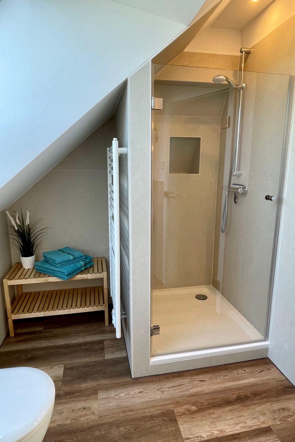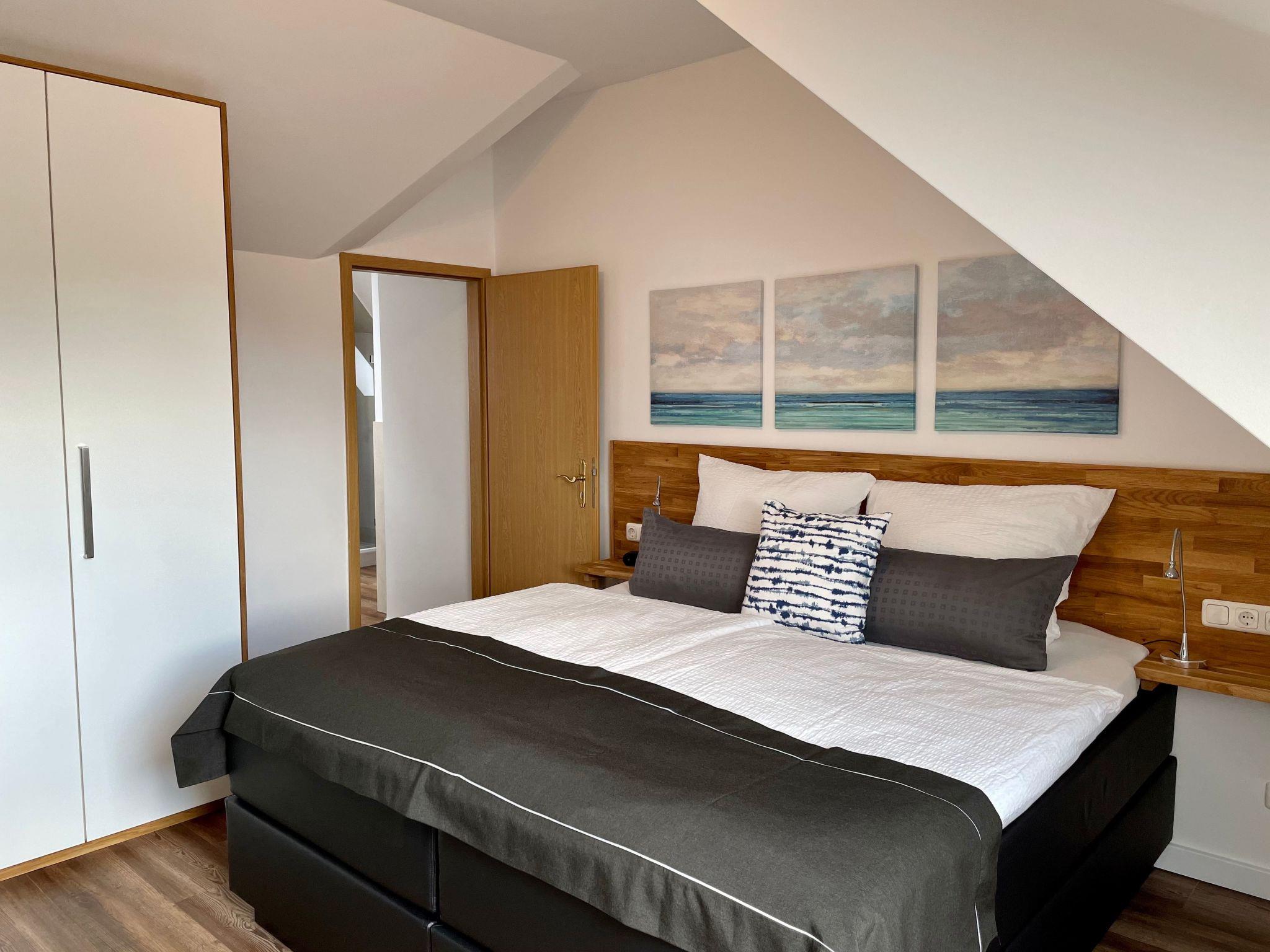 The 3-room maisonette flat has two bedrooms with king-size box-spring beds (1.80 m x 2.00 m), a living room with sofa set (sofa bed 1.40 m x 2.00 m), an integrated fitted kitchen, a dining area and two shower rooms. The fully equipped kitchen with dining area is integrated into the large living room. From here you have access to the balcony with a wonderful view of the natural surroundings.