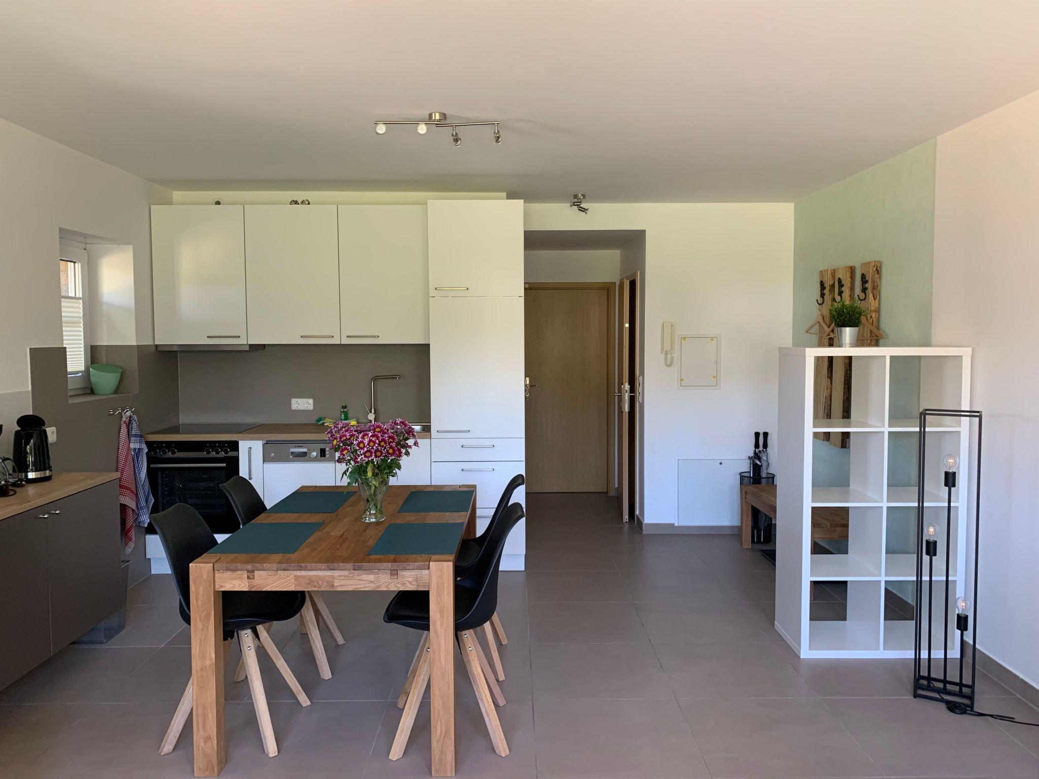 The 2-room flats have a bedroom with box-spring bed, a living room with sofa bed, an integrated fitted kitchen, a dining area, a bathroom with shower and a furnished terrace in the garden. All flats have smart TVs in the living room and bedrooms. Wi-Fi in the flats is free of charge. The fully equipped kitchen is integrated into the large living room. From here you have direct access to the sun terrace with garden furniture and a view of the salt marshes.