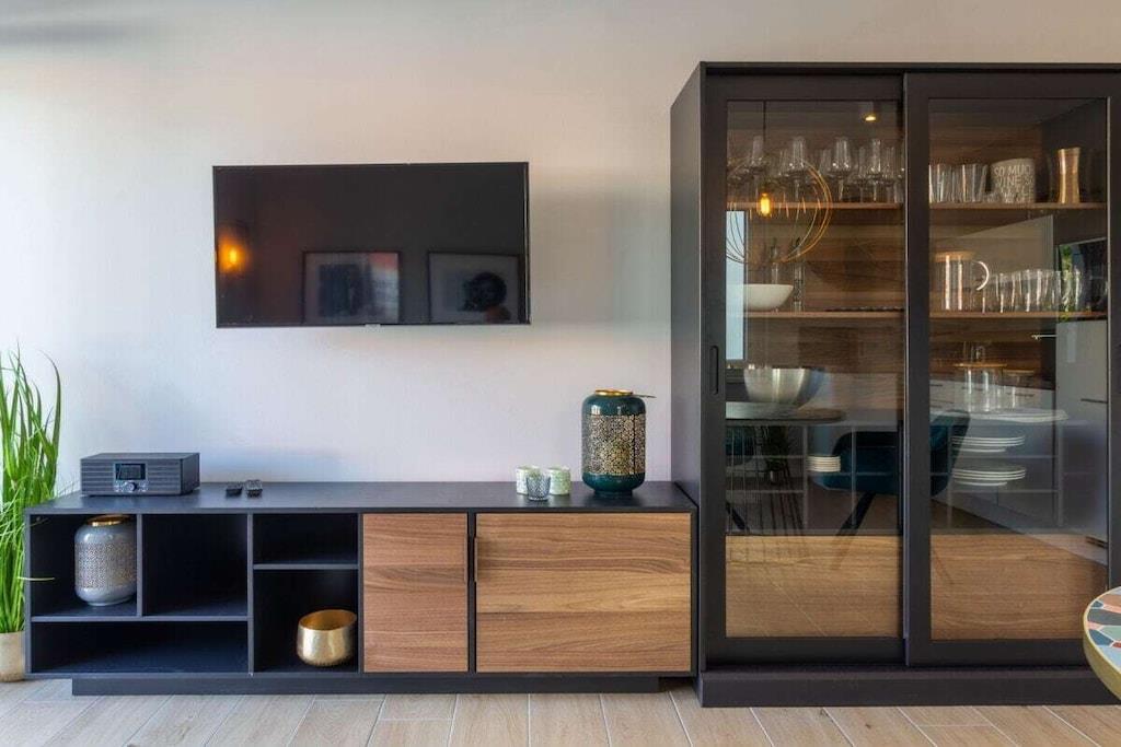Første etasje: (åpent kjøkken(TV, komfyr, stekovn, kjøleskap, oppvarming), soveværelse(, , dobbeltseng, TV, oppvarming), bad(, WC, dusj, håndvask, oppvarming), oppbevaringsrom(, strykebrett, strykejern, tørkeskap)) , , , , , garasje, Internett-tilgang, Internett-tilgang, tørketrommel, vaskemaskin, oppvarming, hage(Strand, hagemøbler), parkering, strykebrett, strykejern, tørkeskap, Ladestolpe for el-biler