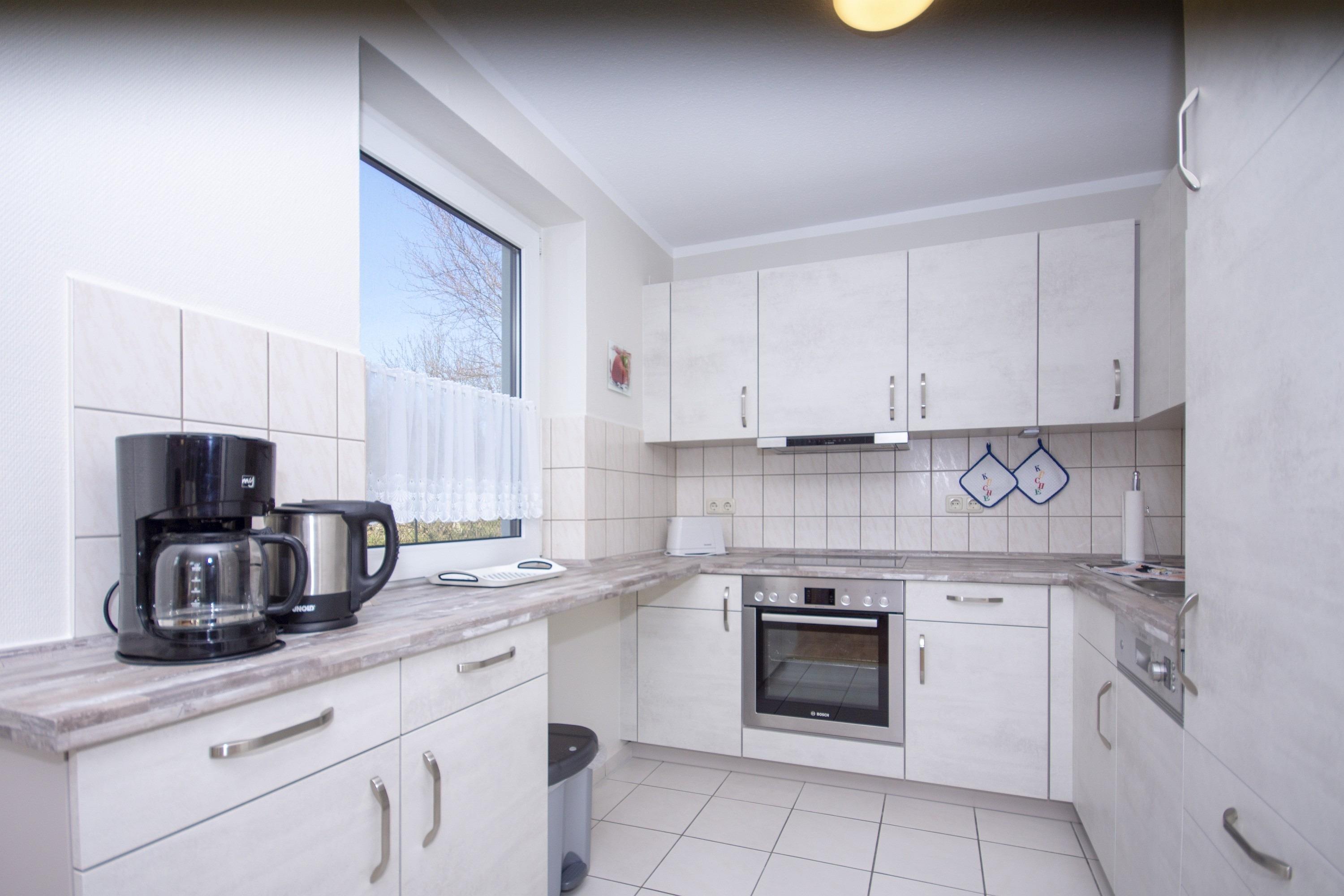 In der Wohnung befindet sich eine offene, voll ausgestattete Küche mit Spülmaschine, Herd, Cerankochfeld und Mikrowelle. Zahlreiche Küchenutensilien eröffnen Ihnen die Möglichkeit, einen kulinarischen Kochabend zu verleben.