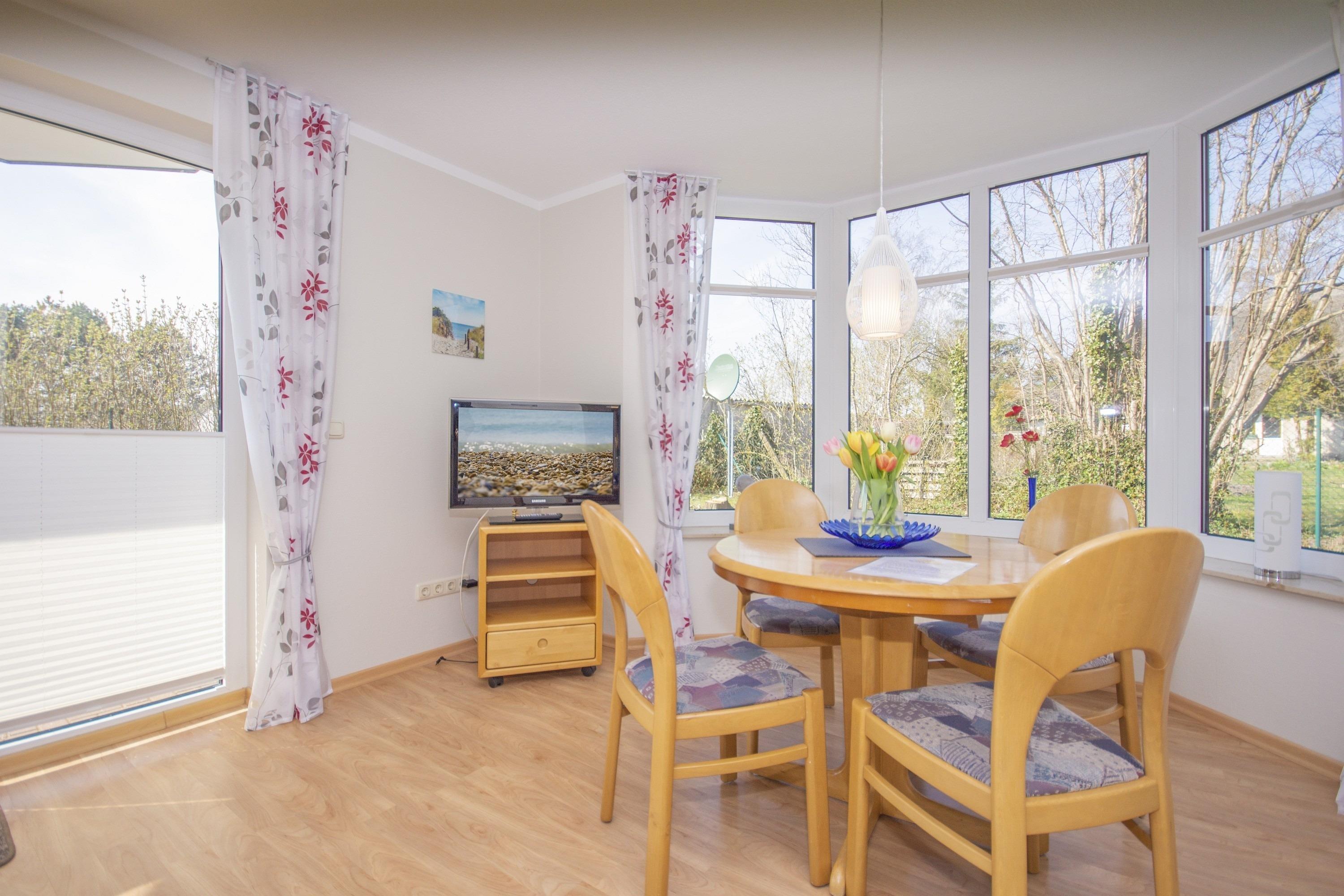 Der freundliche Wohnbereich bietet einen gemütlichen Ort zum Ausklingen der erlebnisreichen Tage auf Rügen. Hier befindet sich neben einem modernen Flachbild-TV auch eine außerordentlich komfortable Couchgarnitur, die eine optionale Aufbettung für bis zu 2 weitere Personen darstellt. Von diesem Zimmer erhalten Sie einen direkten Zugang auf die eigene Terrasse, welche mit komfortablen Gartenmöbeln ausgestattet ist. Hier können Sie nach einem erlebnisreichen Strandtag in Baabe einfach mal die Seele baumeln lassen.