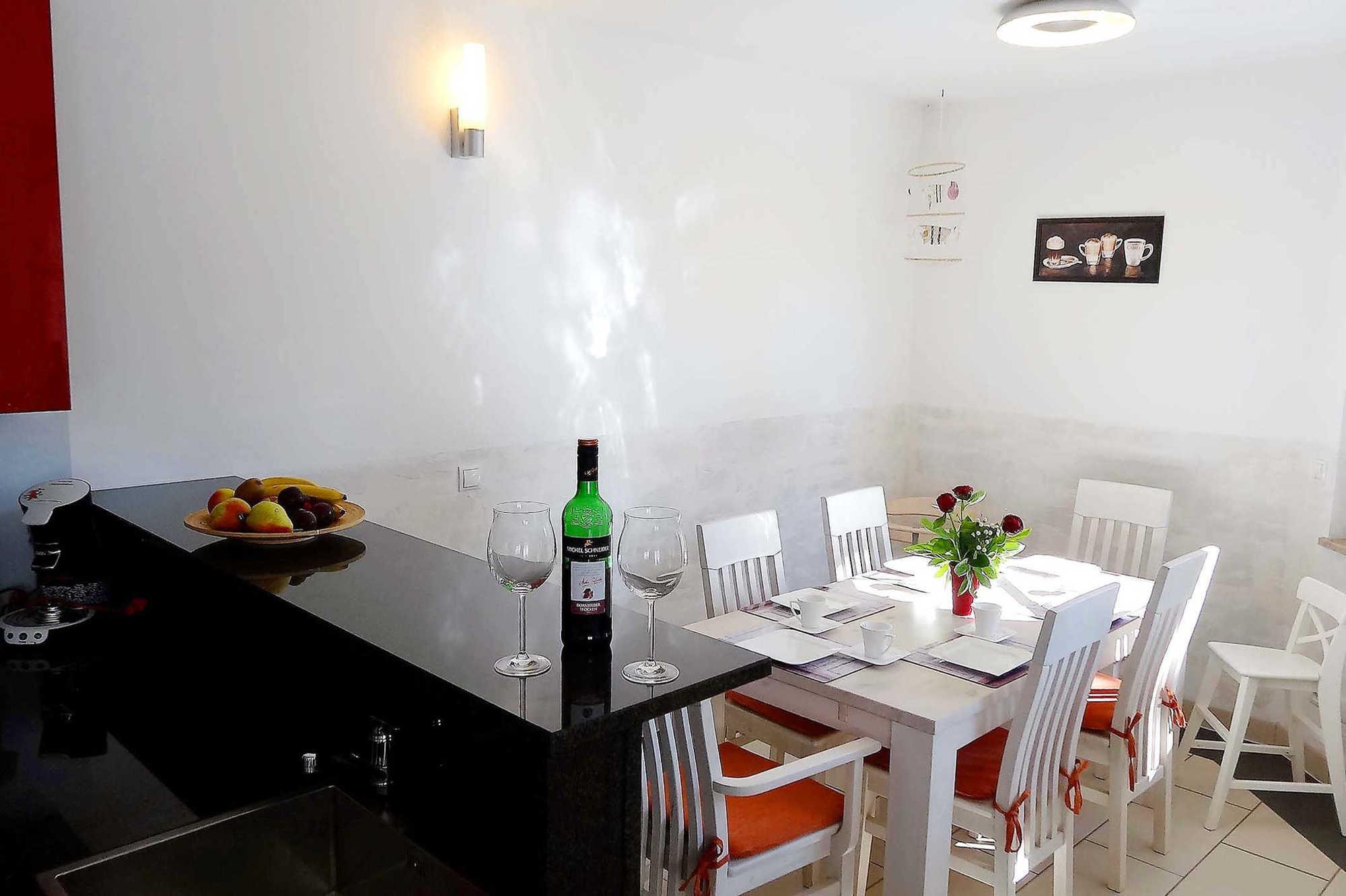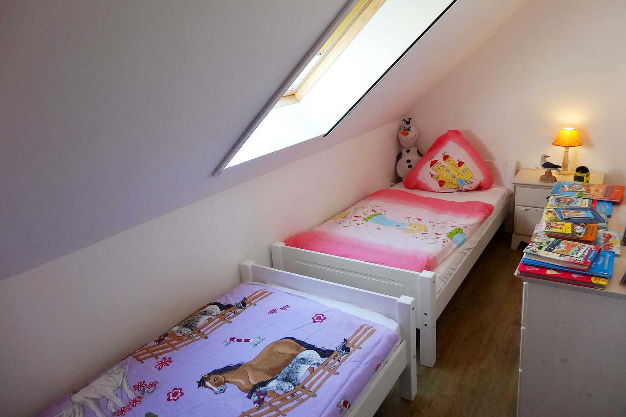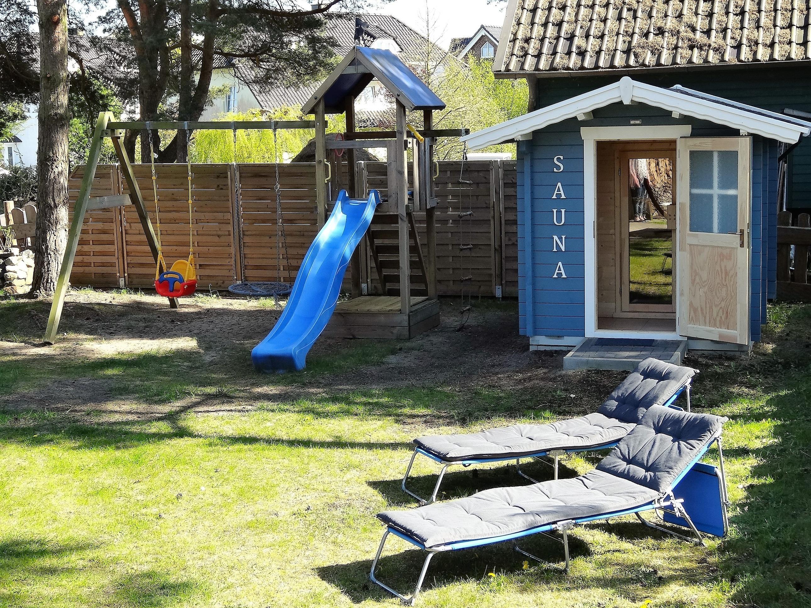 Über 2 Etagen verteilen sich 3 Schlafzimmer, 2 Bäder, ein großer Wohnraum mit amerikanischer Küche sowie ein separater Essplatz (hauseigene Kinderstühle vorhanden). Alle Räume sind mit Fußbodenheizung, Insektenschutzgittern und elektr. Rollläden ausgestattet. Im Erdgeschoss befindet sich der gemütliche Wohnraum mit großem Relax-Sofa (inkl. Schlaffunktion), Smart TV (50“ und HD+), DVD-Player, Musikanlage(CD + USB + Bluetooth), kostenfreier WLAN-Zugang und Kamin (inkl. Holz). Die Küche ist komplett mit Backofen, Ceranfeld, Mikrowelle, Kühl-/Gefrierkombination, Geschirrspüler, Toaster, Kaffeemaschine, Wasserkocher und anderen diversen Küchenhelfern ausgestattet. Im Erdgeschoss befindet sich ein Badezimmer mit Dusche, WC und Waschtisch. Das große Badezimmer im Obergeschoss ist zusätzlich zur Dusche, Fön, WC und Waschtisch mit einer gemütlichen Badewanne ausgestattet. Zwei geräumige Schlafzimmer sind mit einem Doppelbett (1,9 x 2,0m) und großem Kleiderschrank, Radiowecker, Flachbild-TV (32“) sowie Kinderbett (0,7 x 1,4m) bzw. einer Schlafcouch ausgestattet. Das 3. Schlafzimmer ist als Kinderzimmer eingerichtet mit 2 Einzelbetten (1,0 x 1.9m). Zusätzliche Ausstattungsmerkmale: Waschmaschine, Bügelbrett, Bügeleisen, Buggy, Babyphone, Bollerwagen, Roller, Spieletisch (Billard, Hockey, Kicker, Tischtennis, Brettspiele).[nbsp] Garten Highlights: Hängematte, Sonnenliegen, Strandkorb, Holzkohlegrill sowie das hauseigene Saunahaus (gegen Gebühr) und Spieleturm mit Rutsche + Schaukeln. Es gibt für Sie kostenfreie Park- [&] Fahrradabstellmöglichkeiten (1x Carport, 1x vor Gartenhaus).