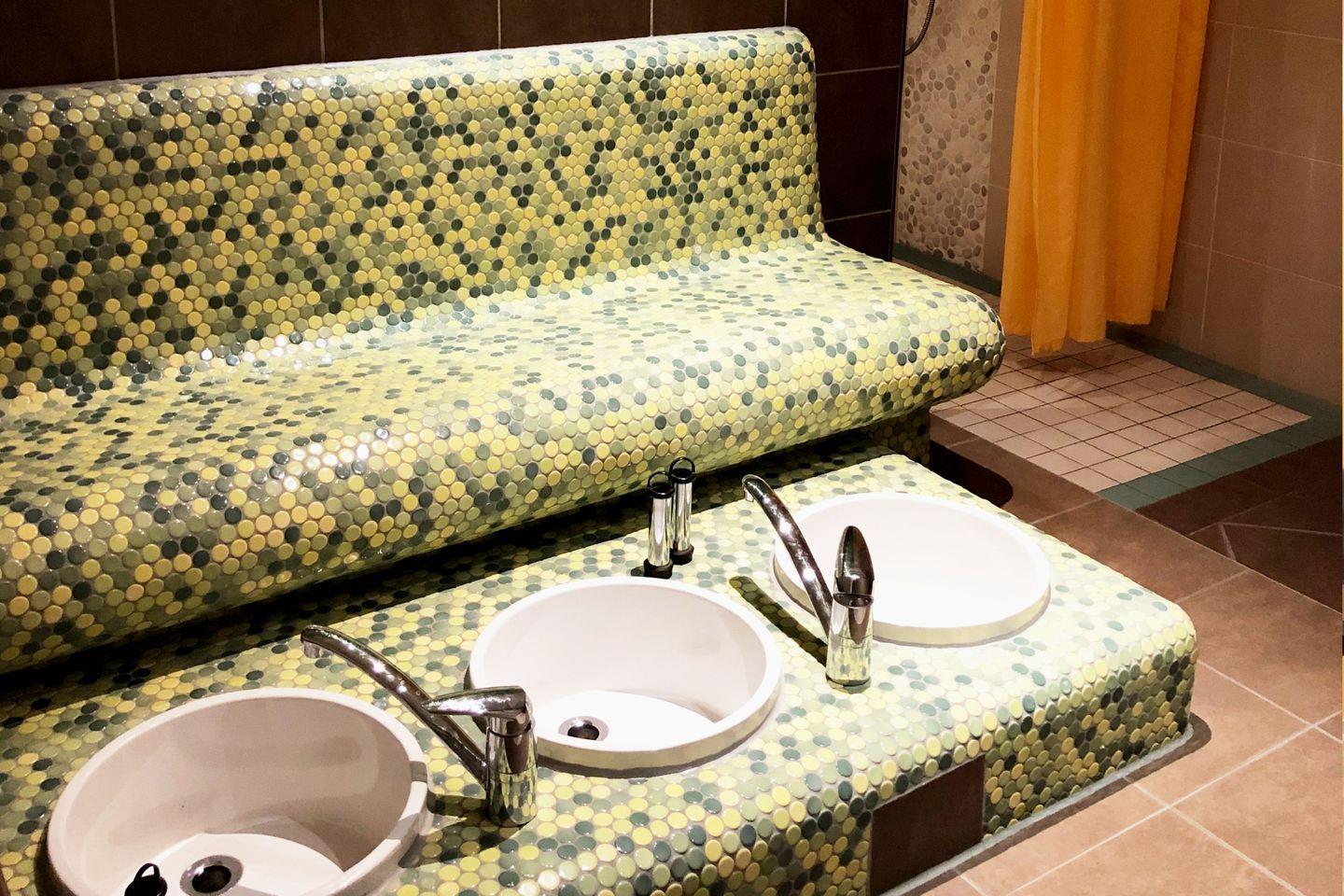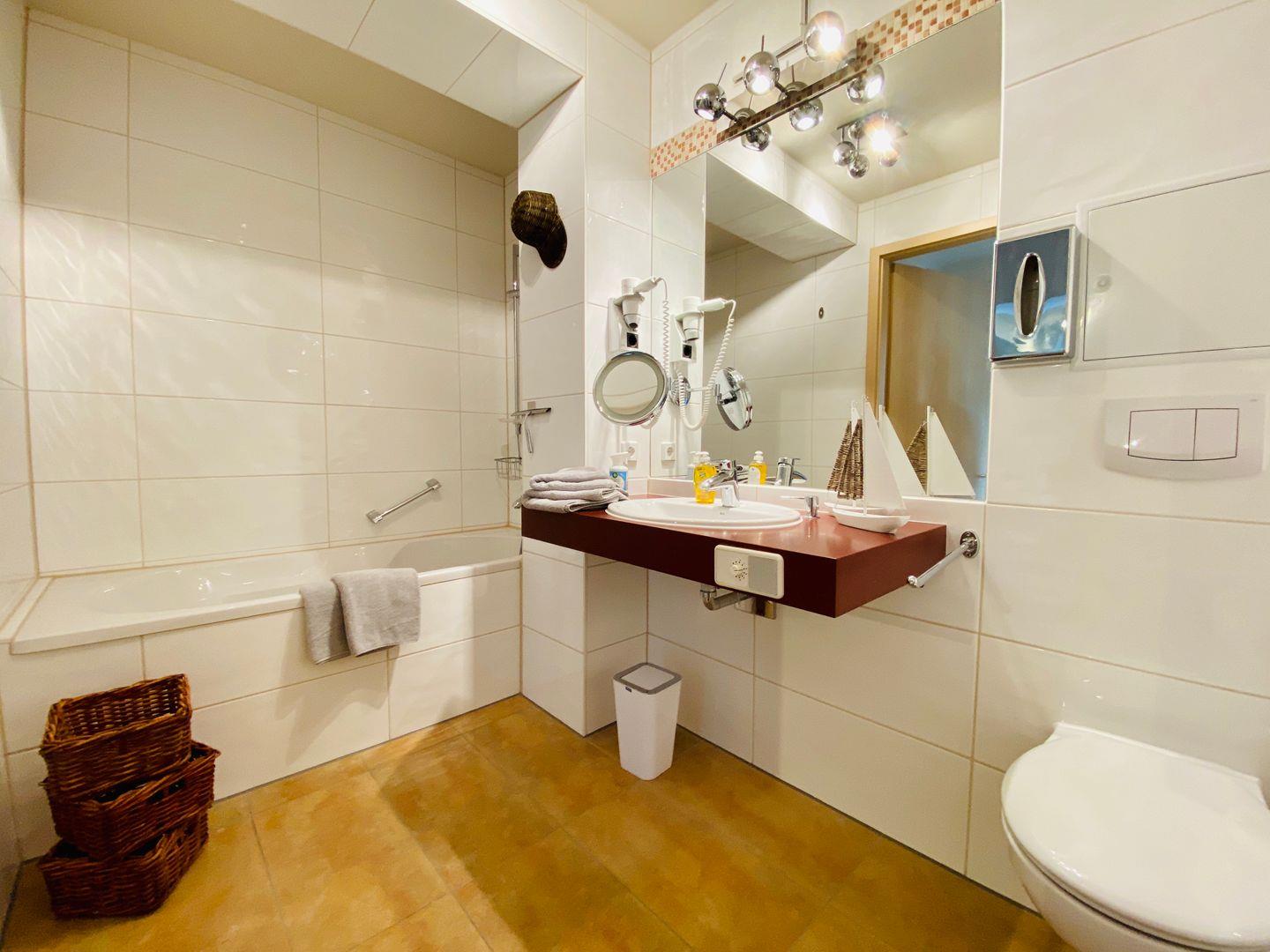 Das Badezimmer hat eine Badewanne mit inkludierter Duschbrause, einen Waschtisch, einen großen Handtuchwärmer, genügend Ablagefläche für die mitgebrachten Kosmetikartikel und ein WC. Fön, Kosmetikspiegel und Seifenspender gehören ebenso zur Ausstattung.