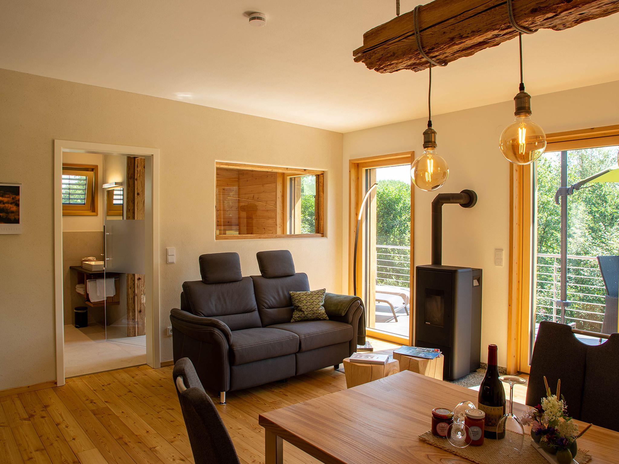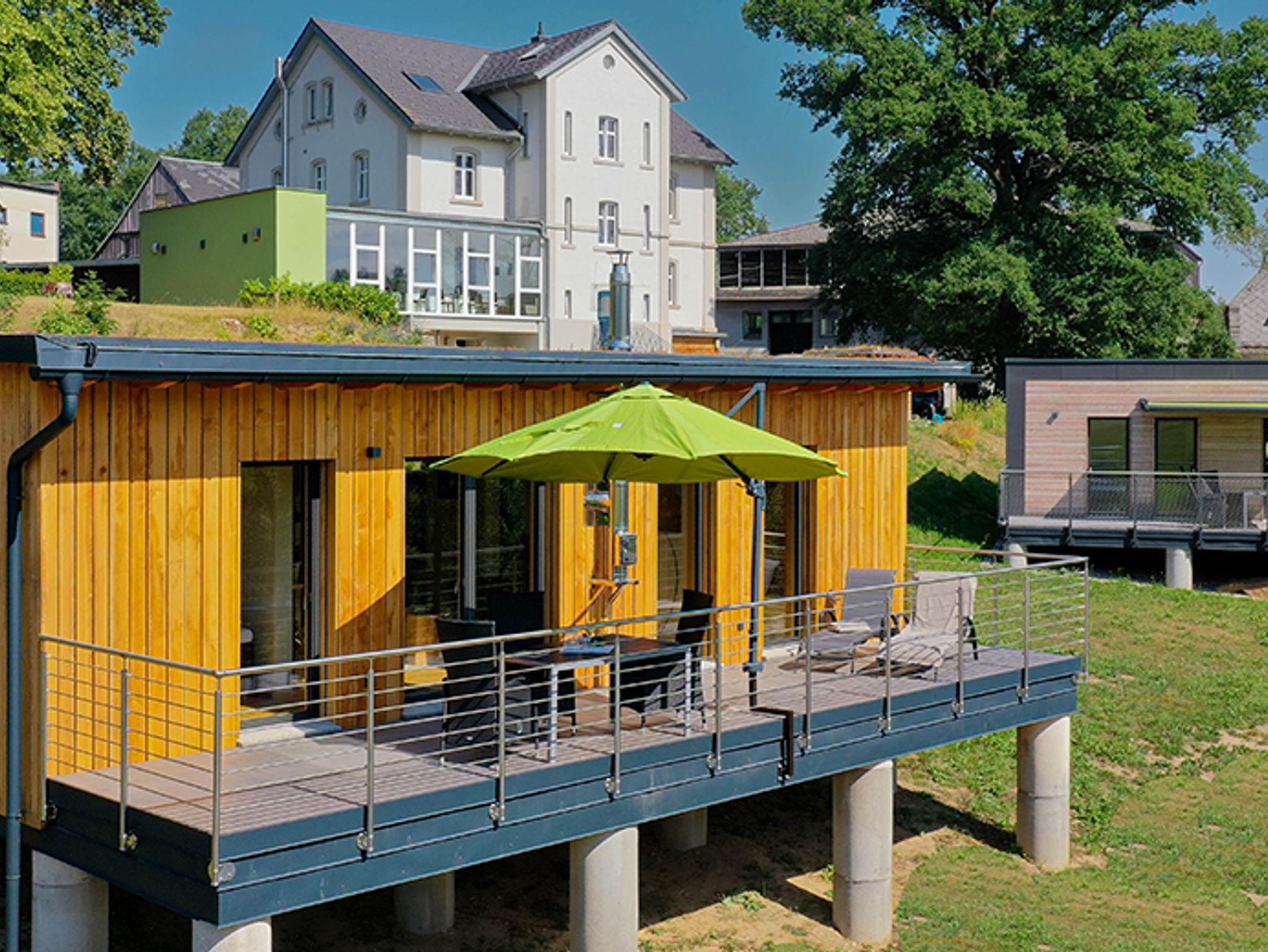 Was dürfen die Gäste im Ferienhaus im Fichtelgebirge erwarten? Das Haus bietet eine ausgesprochen hochwertige Ausstattung. Auf 59qm Wohnfläche und einer 25qm Sonnenterrasse mit einem professionellen in alle Richtungen verstellbaren Sonnenschirm lässt sich der Urlaub im Fichtelgebirge sehr angenehm gestalten. Zur Verfügung steht ein Schlafzimmer mit Boxspringbetten, eine hochwertige, vollausgestattete Küche sowie ein Bad mit großer Dusche (1,40 x 0,90 m) und eine geräumige Sauna (2,10 x 2,50m) für zwei Personen direkt im Ferienhaus zur alleinigen Nutzung.