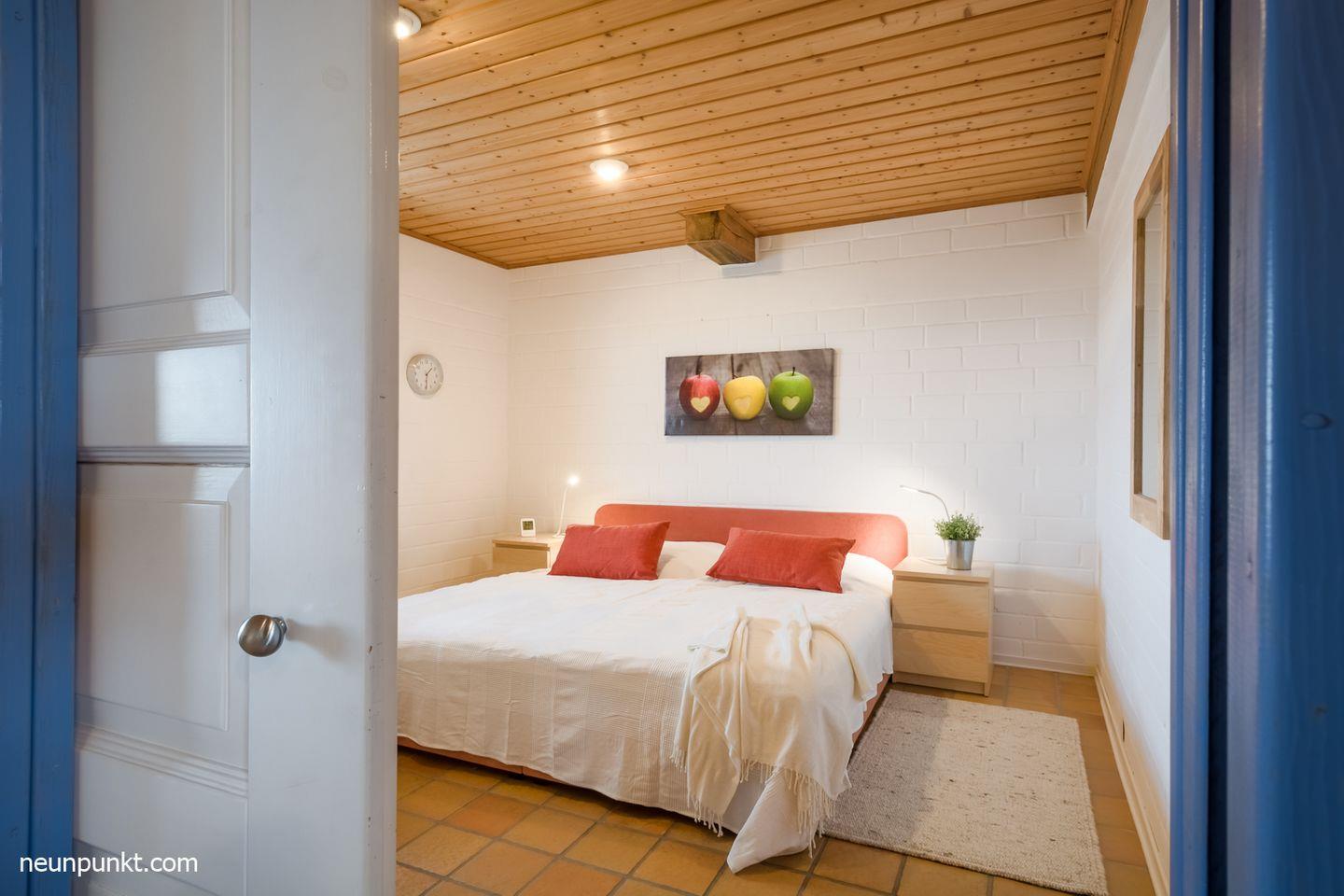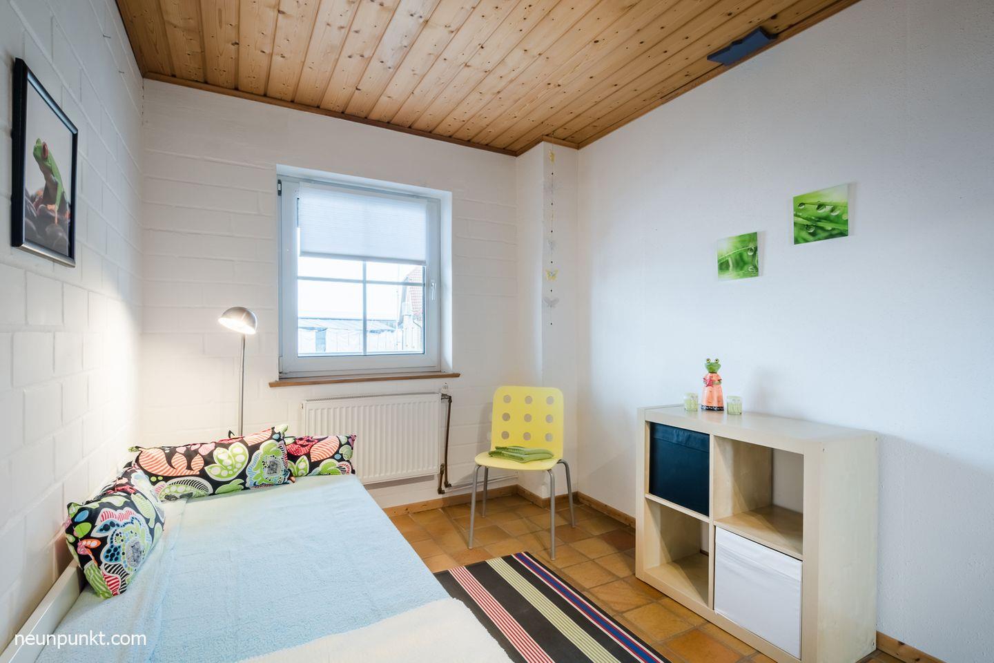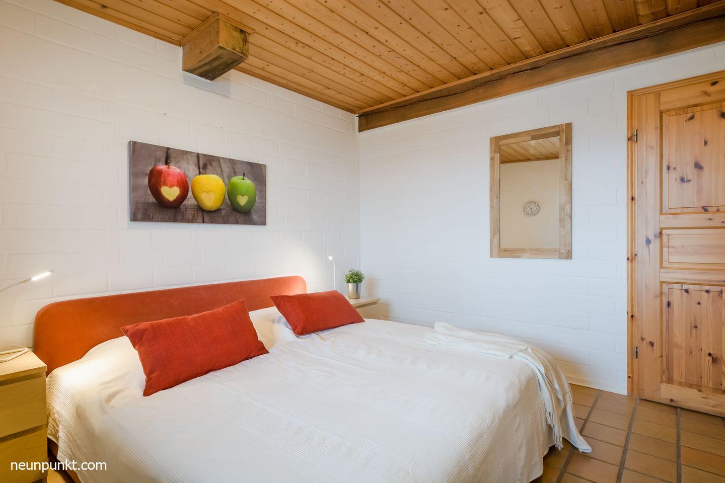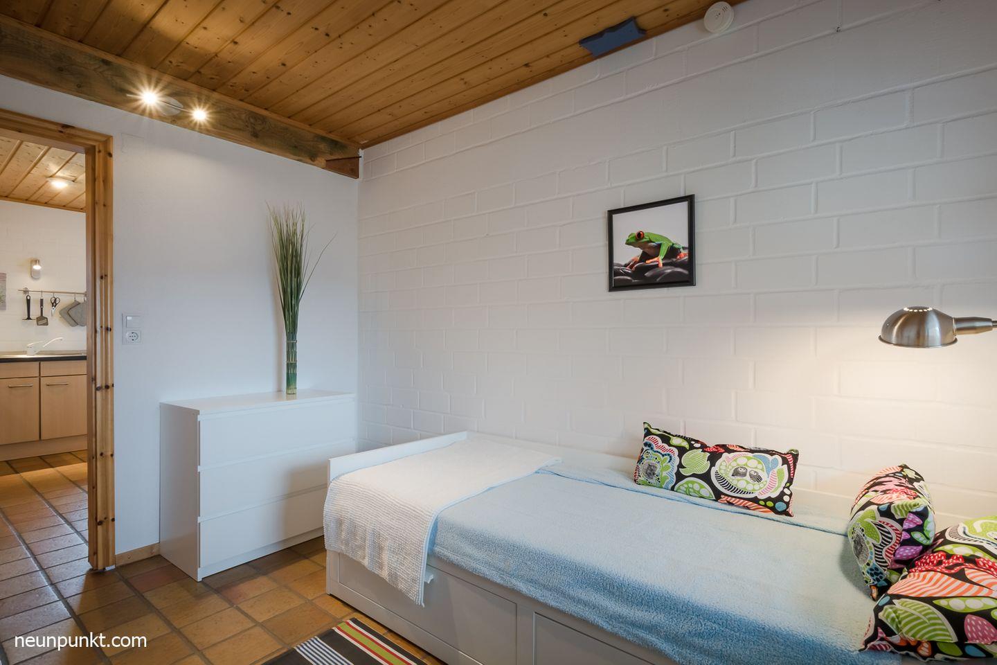 Die Ferienwohnung teilt sich auf in einen Wohnraum mit Kaminofen, einen Essplatz am Fenster, Küchenzeile mit Induktionskochfeld, Geschirrspüler (sehr leise Spülvorgänge), Kühl-/ Gefrierkombination, ein Schlafzimmer mit Doppelbett (2x 90x200cm), ein Durchgangszimmer mit einem Einzelbett (80x200cm) und einem Duschbad mit Dusche, WC und Fußbodenheizung.