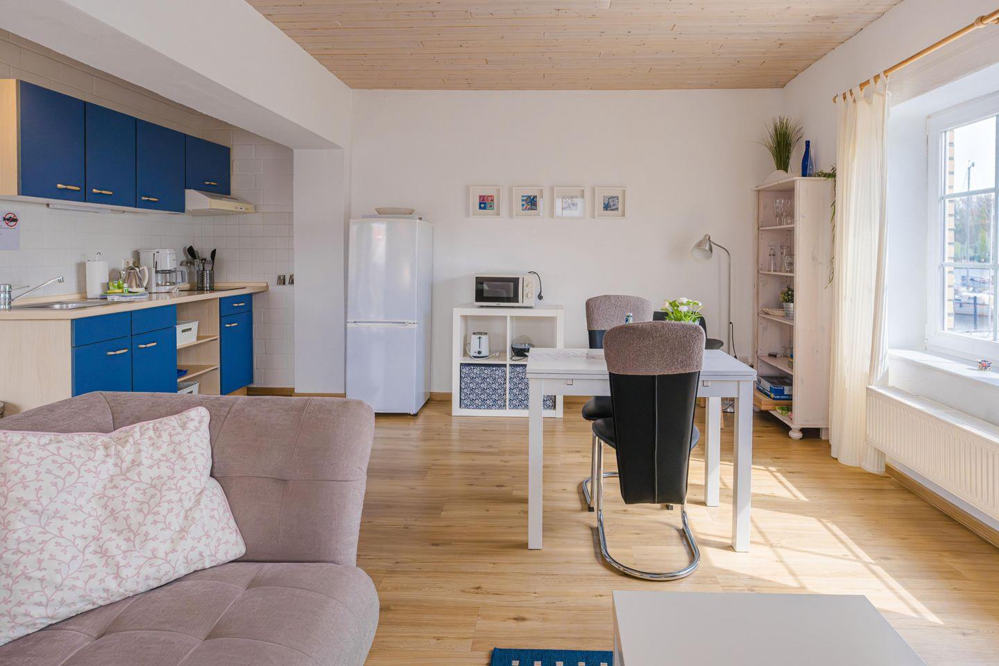 In dieser Ferienwohnung gibt es einen gemütlichen Wohn-/ Essraum mit offener Küche, ein überdachter Balkon, eine Küchenzeile Kühl-/ Gefrierkombination, 1 Schlafzimmer mit Doppelbett (2x 90x200cm) und ein Badezimmer mit Dusche. Auf dem großen Balkon können Sie die Werft und die Schlei beobachten und sonnige Stunden verbringen.