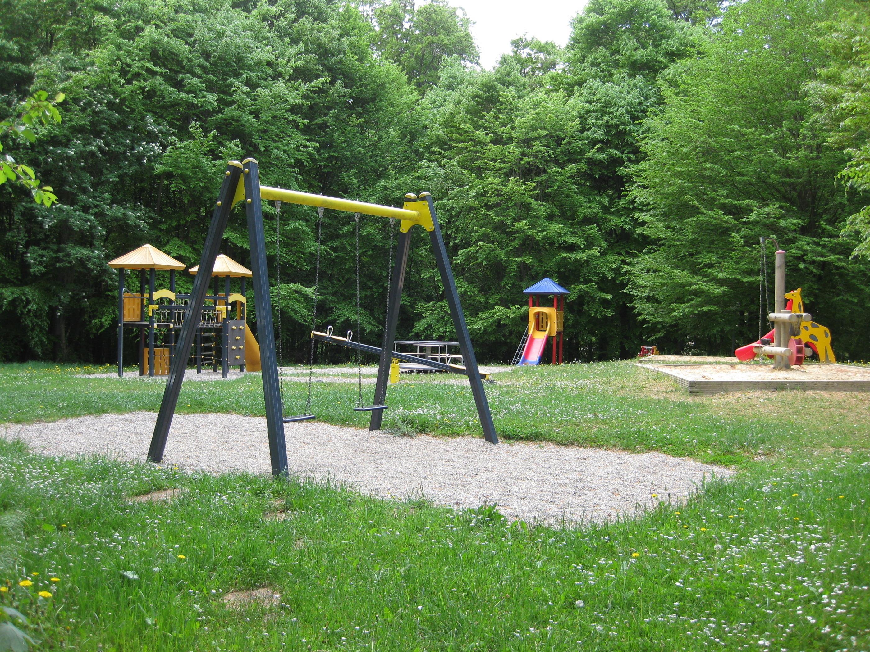 Spielplatz mit Klettergerüst, Rutsche und Schaukel