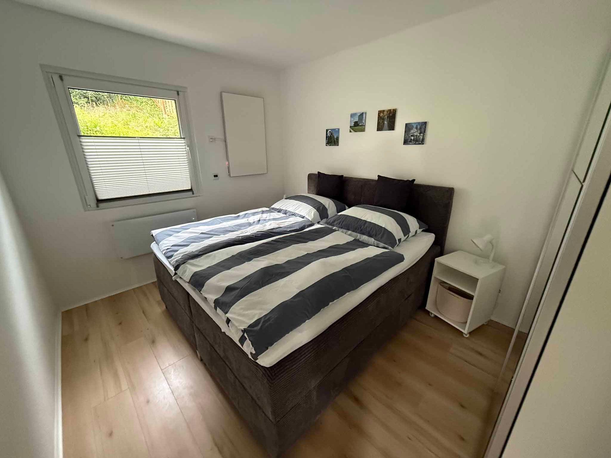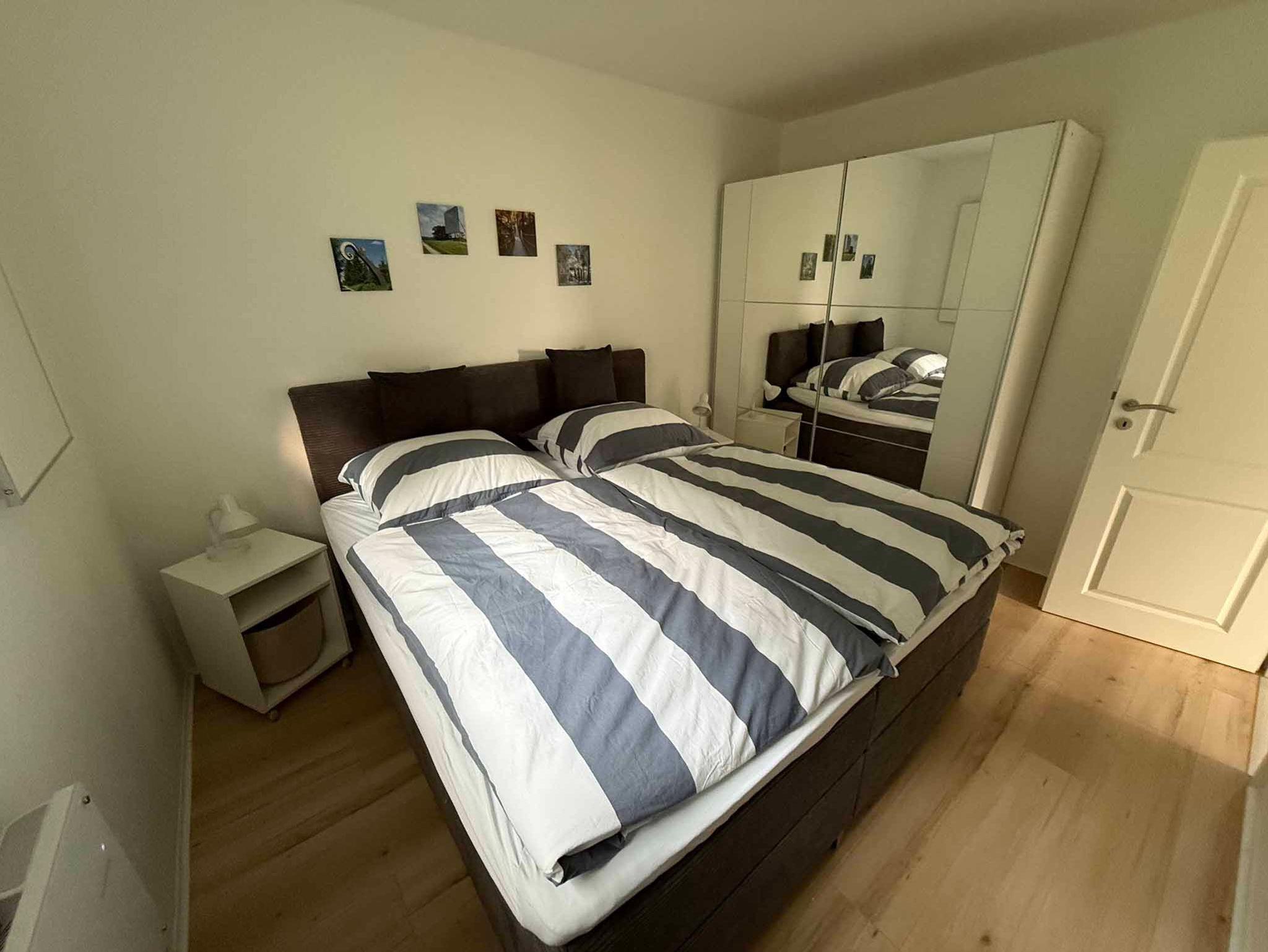 Ein Schlafzimmer ist mit einem hochwertigen Boxspringbett und einem geräumigen Kleiderschrank ausgestattet,