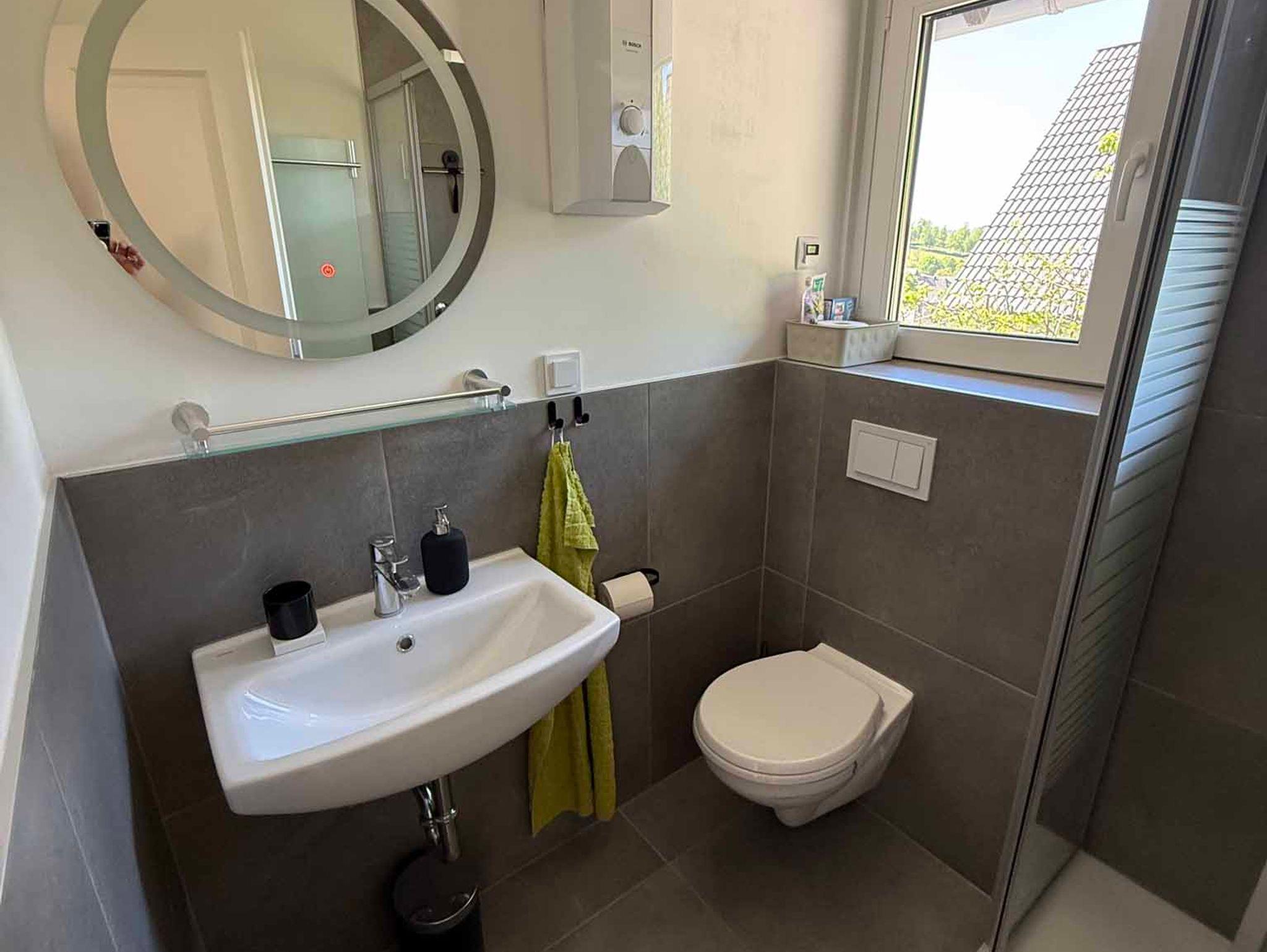 Außerdem befindet sich auf dieser Etage ein kleines Badezimmer mit Dusche, WC und Waschbecken.