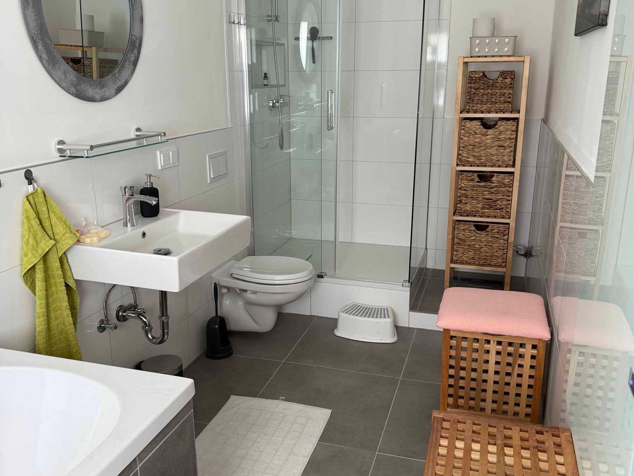 Das zweite große Badezimmer verfügt über Dusche, WC, Badewanne, Waschbecken, Wäscheständer und Waschmaschine.