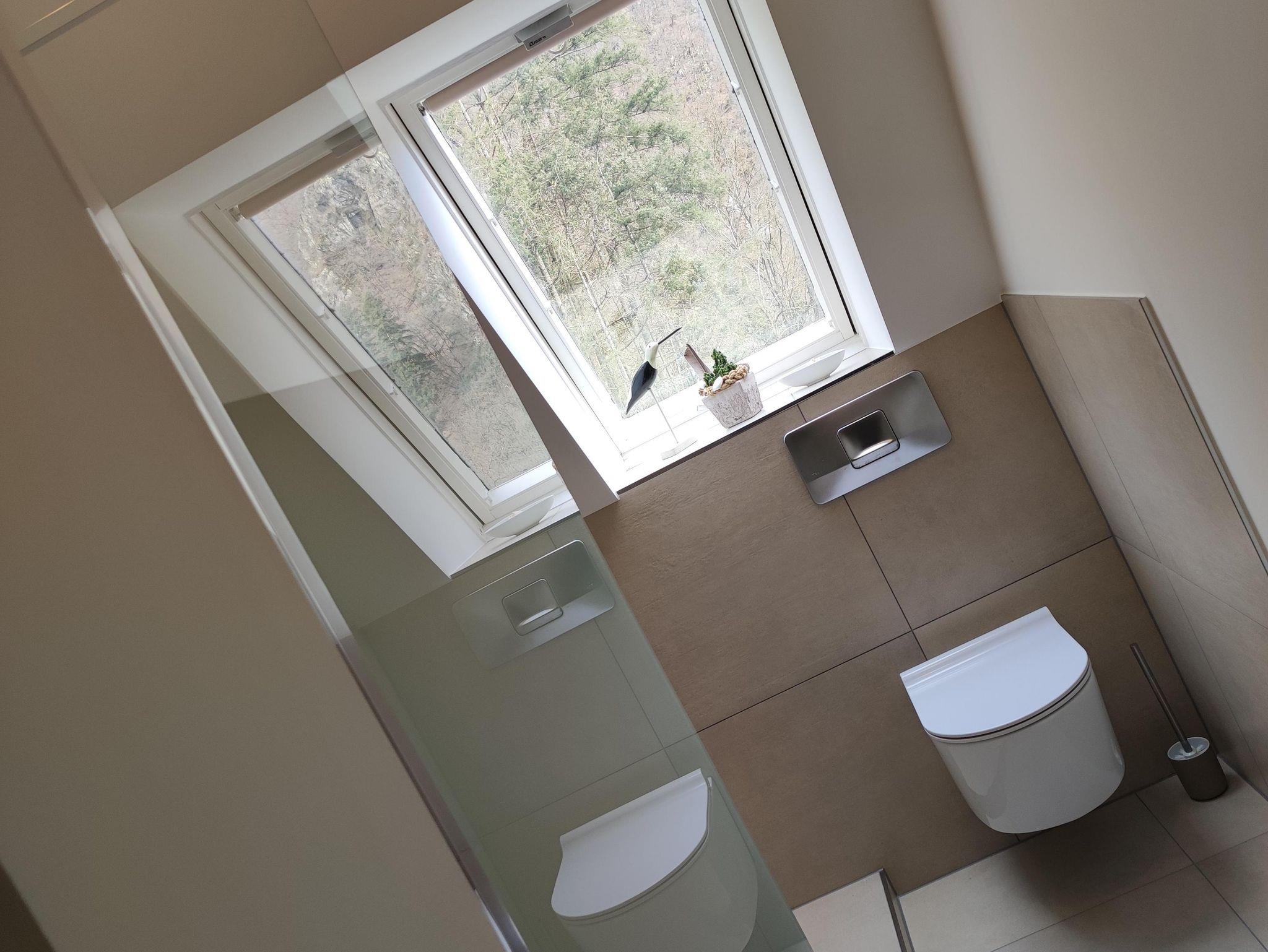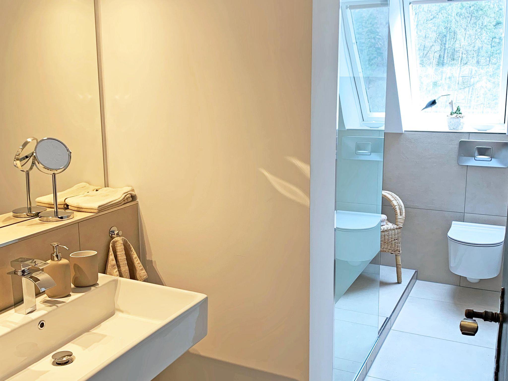 • Badezimmer mit Dusche, WC, Waschbecken, Haarfön, Kosmetikspiegel und Seife
