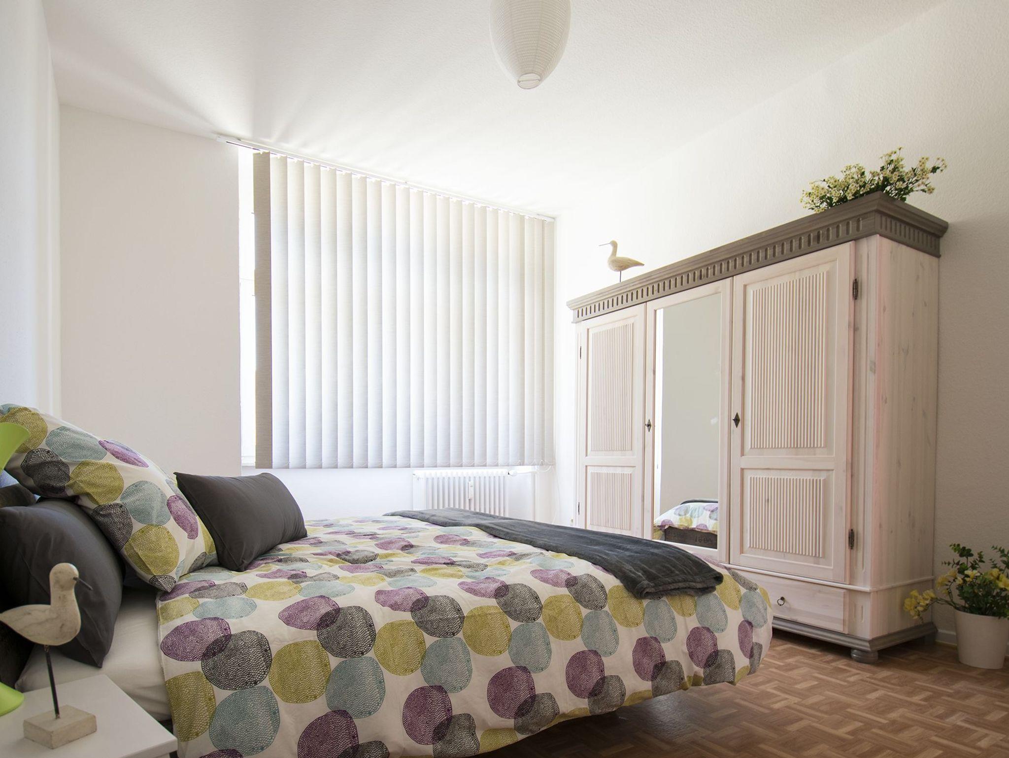 Schlafzimmer Alleegarten: Schlafraum nach Norden mit geräumigem, skandinavischen Kleiderschrank mit integriertem Spiegel, Sitzbank, Korbsessel und 180×200 Doppelbett mit Leselampen