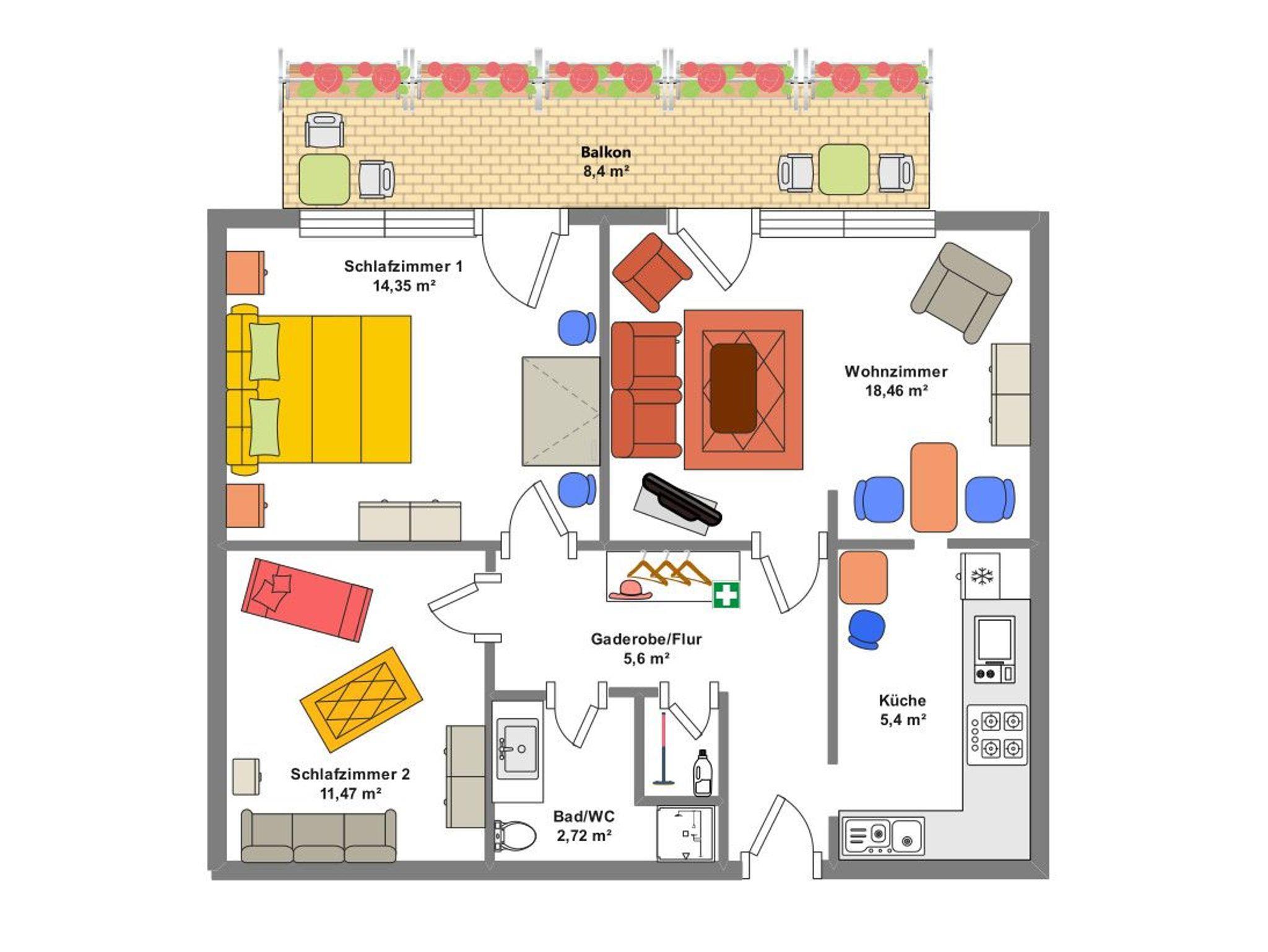 • 3-Zimmer-Wohnung im 3. OG mit Südbalkon (60 qm) für bis zu 3. Personen;