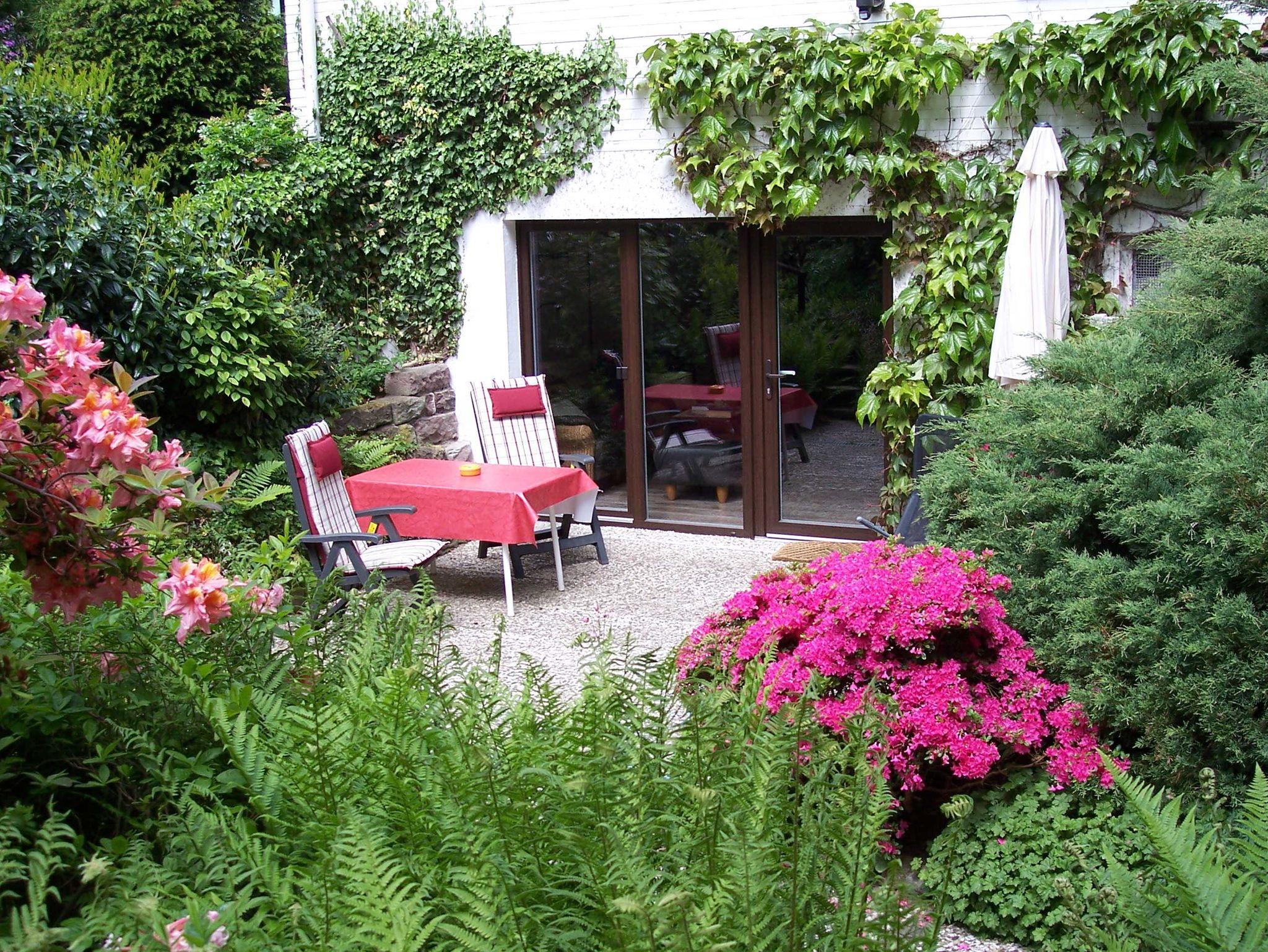 • Ausblick auf die Terrrasse, geschützt von üppigen Pflanzen.
