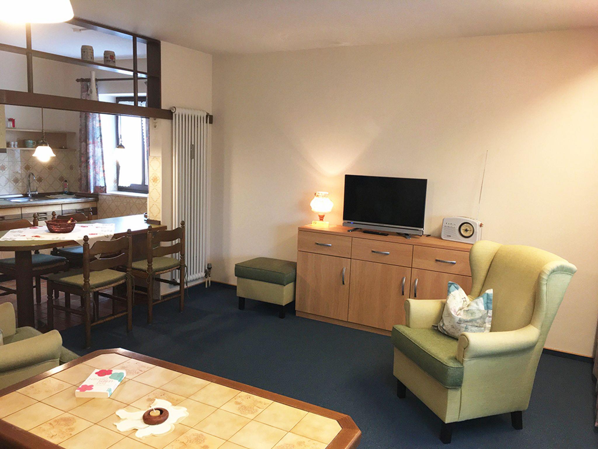 Das Appartement mit 60qm ist bestens geeignet für bis zu 3 Personen. Der Schlafbereich besteht aus einem Doppelbett und der Wohnbereich aus einer Schlafcouch mit TV. Die Küchenzeile ist voll ausgestattet mit Kühlschrank, Kaffeemaschine, Backofen, Toaster. Das Badezimmer mit Fenster verfügt über Badewanne, WC und Föhn. Bettwäsche, Handtücher, Tisch- und Küchenwäsche sind vorhanden. Parkplätze und WLAN stehen kostenfrei zur Verfügung.