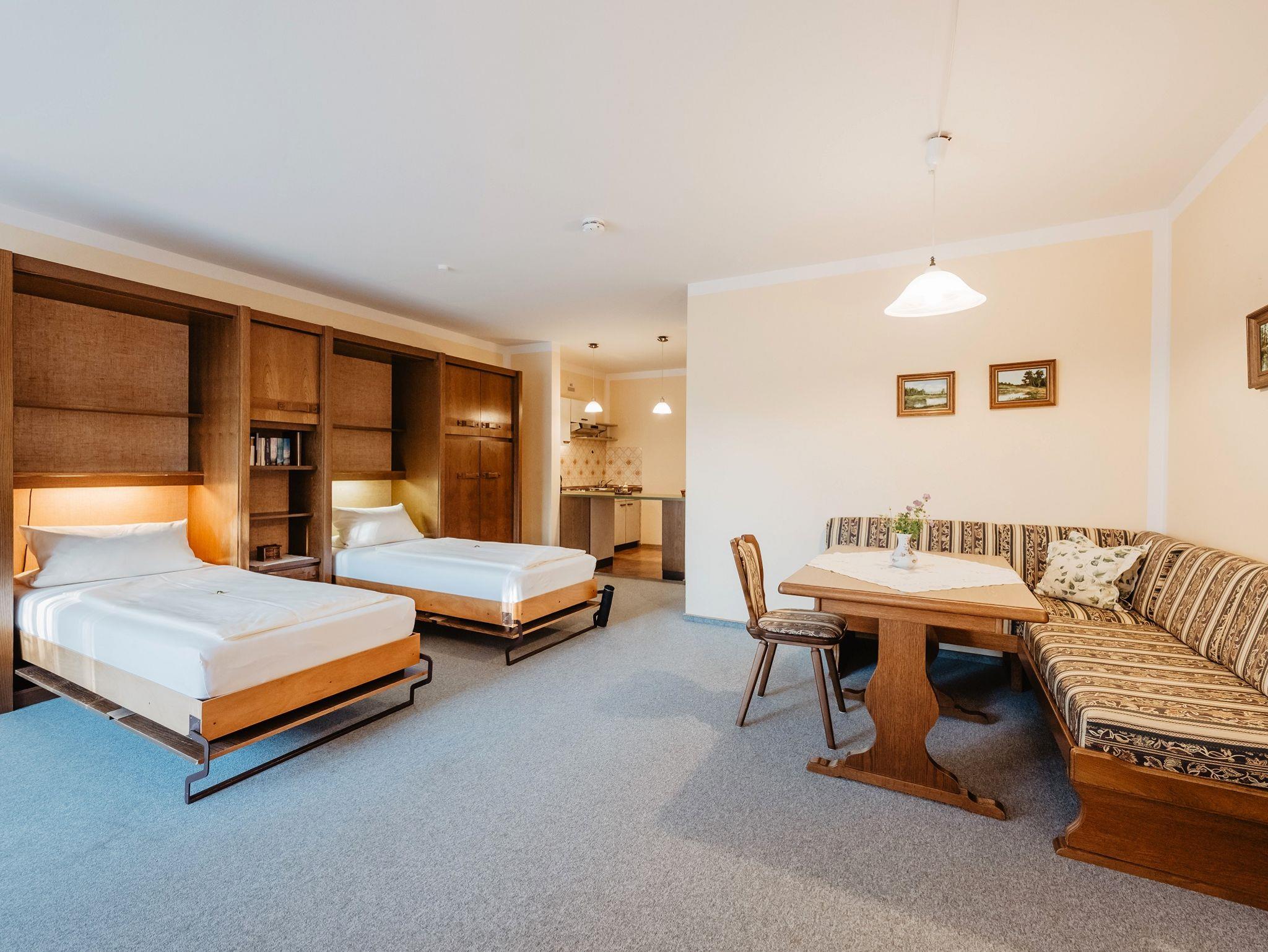 Das Appartement mit 58qm ist bestens geeignet für bis zu 2 Personen. Der Wohn- und Schlafbereich besteht aus zwei Einzelbetten, TV und einer voll ausgestatteten Küchenzeile mit Kühlschrank, Kaffeemaschine, Backofen, Toaster. Das Badezimmer verfügt über Dusche, WC und Föhn. Bettwäsche, Handtücher, Tisch- und Küchenwäsche sind vorhanden. Parkplätze und WLAN stehen kostenfrei zur Verfügung.