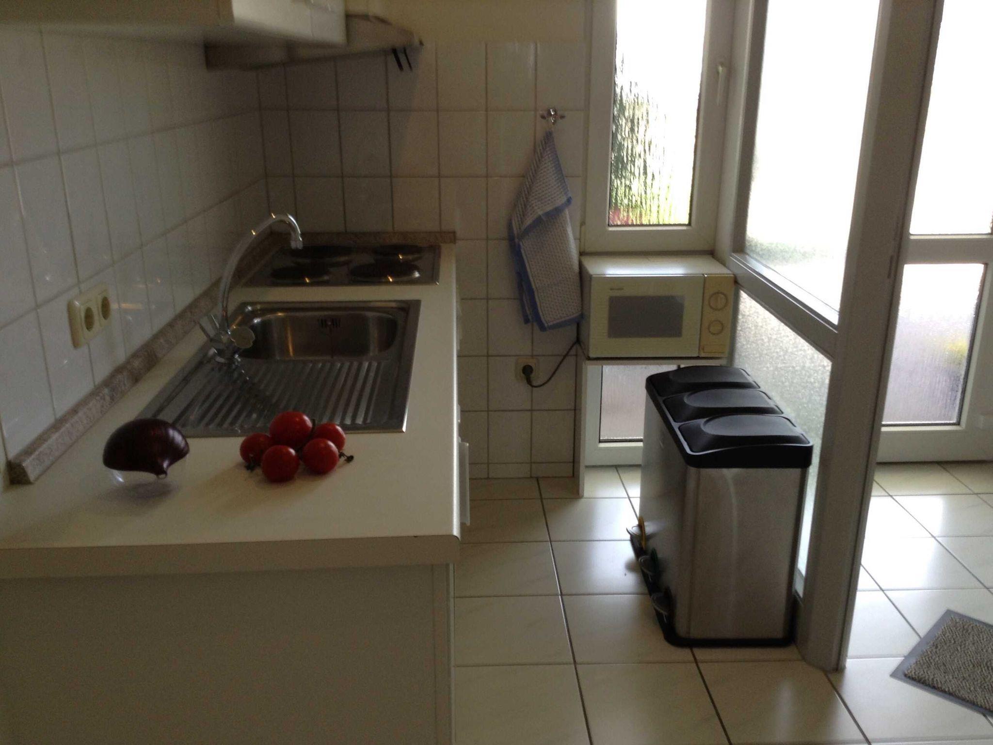 Die Einbau-Küchenzeile ist u. a. mit Backofen, Mikrowelle, Kühlschrank, Dunstabzug, Kaffeemaschine, Toaster und Wasserkocher ausgestattet.