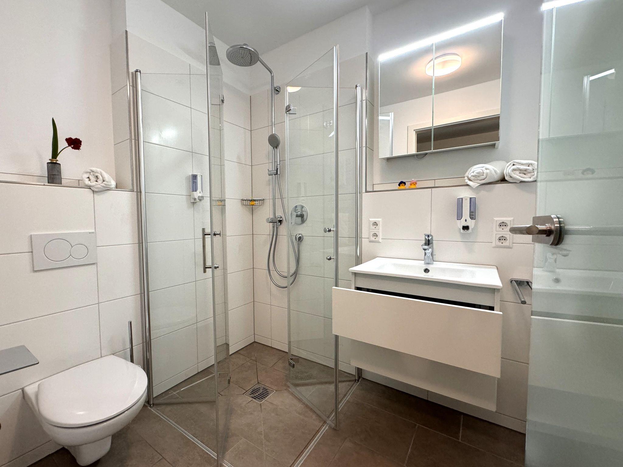 Ihr privates Spa: Das Badezimmer mit bodengleicher Dusche und integrierter Regendusche ist Ihre persönliche Wellnessoase und tut ihr Übriges dazu, sich nach einem produktiven Tag erfrischen und entspannen können.