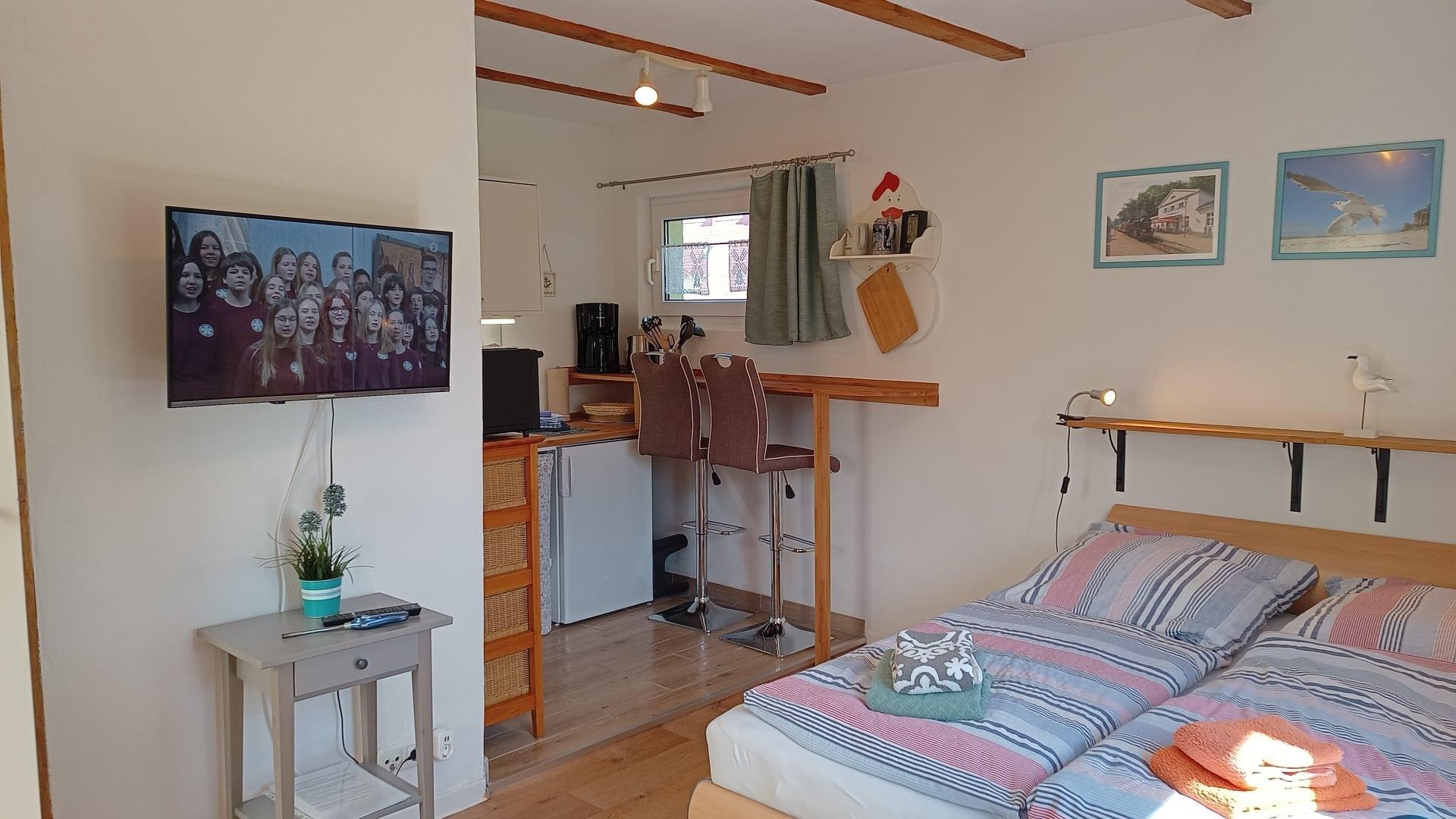 Neben der Küchenzeile ist ein Essplatz für 2 Personen integriert.