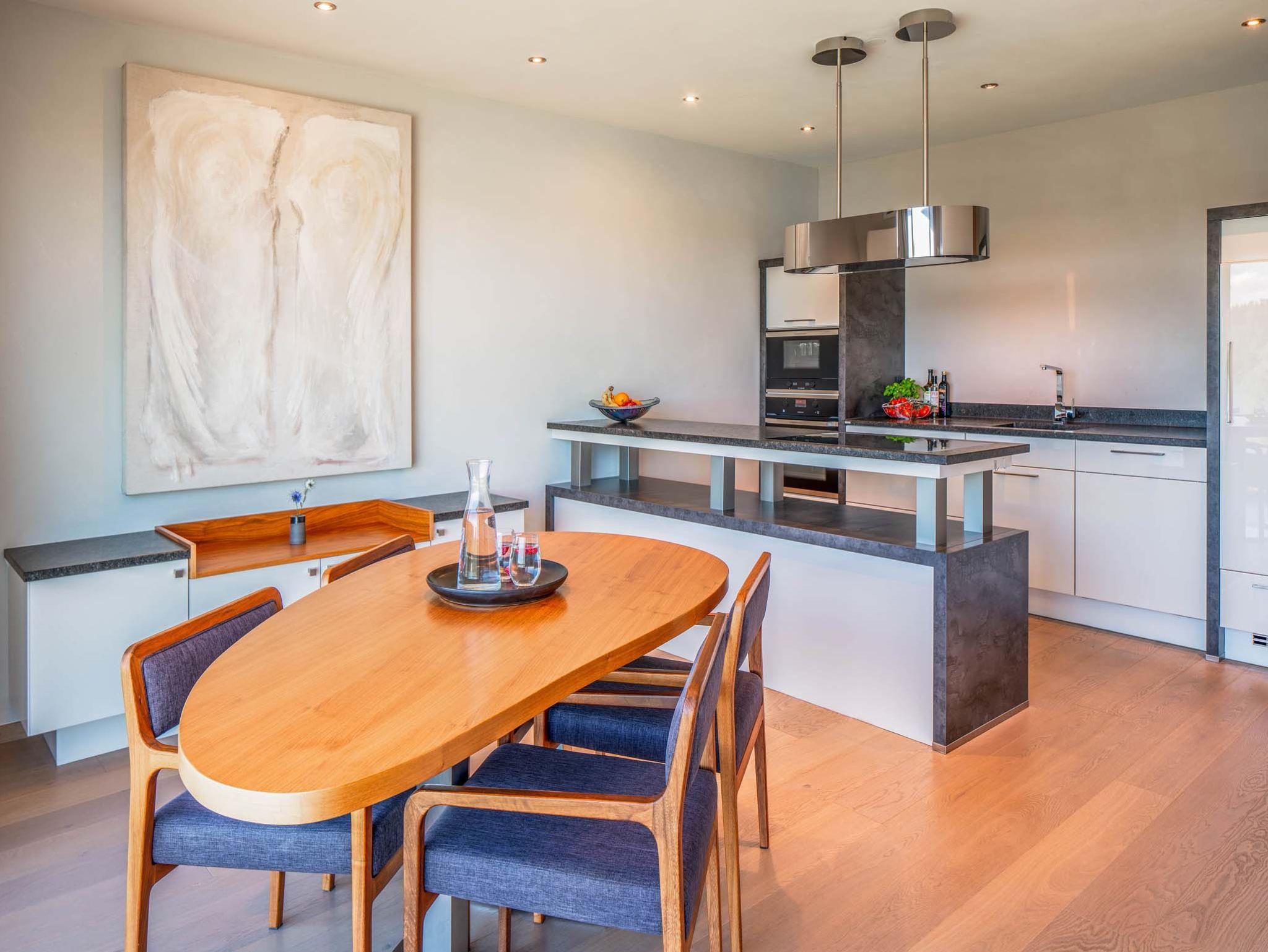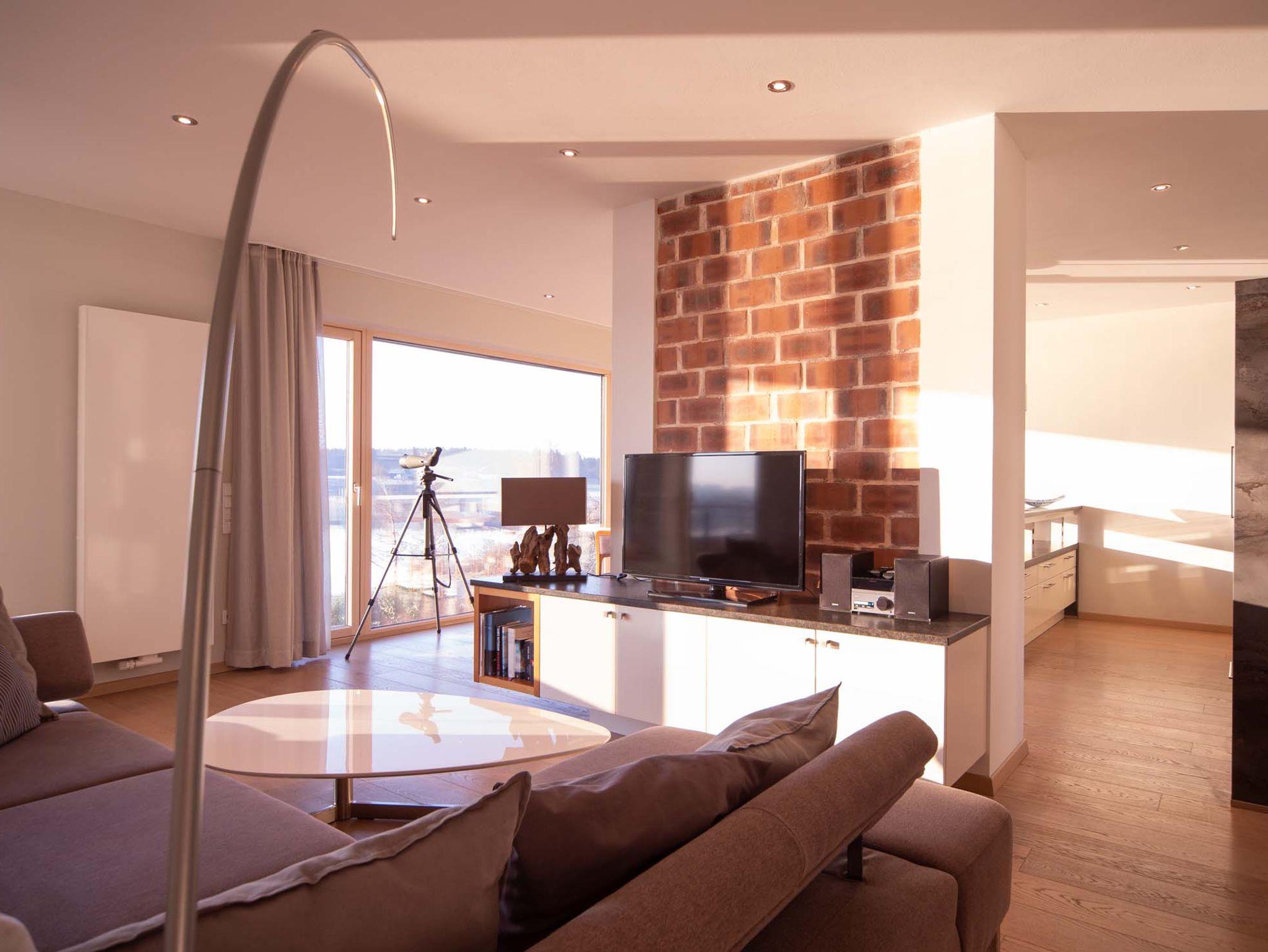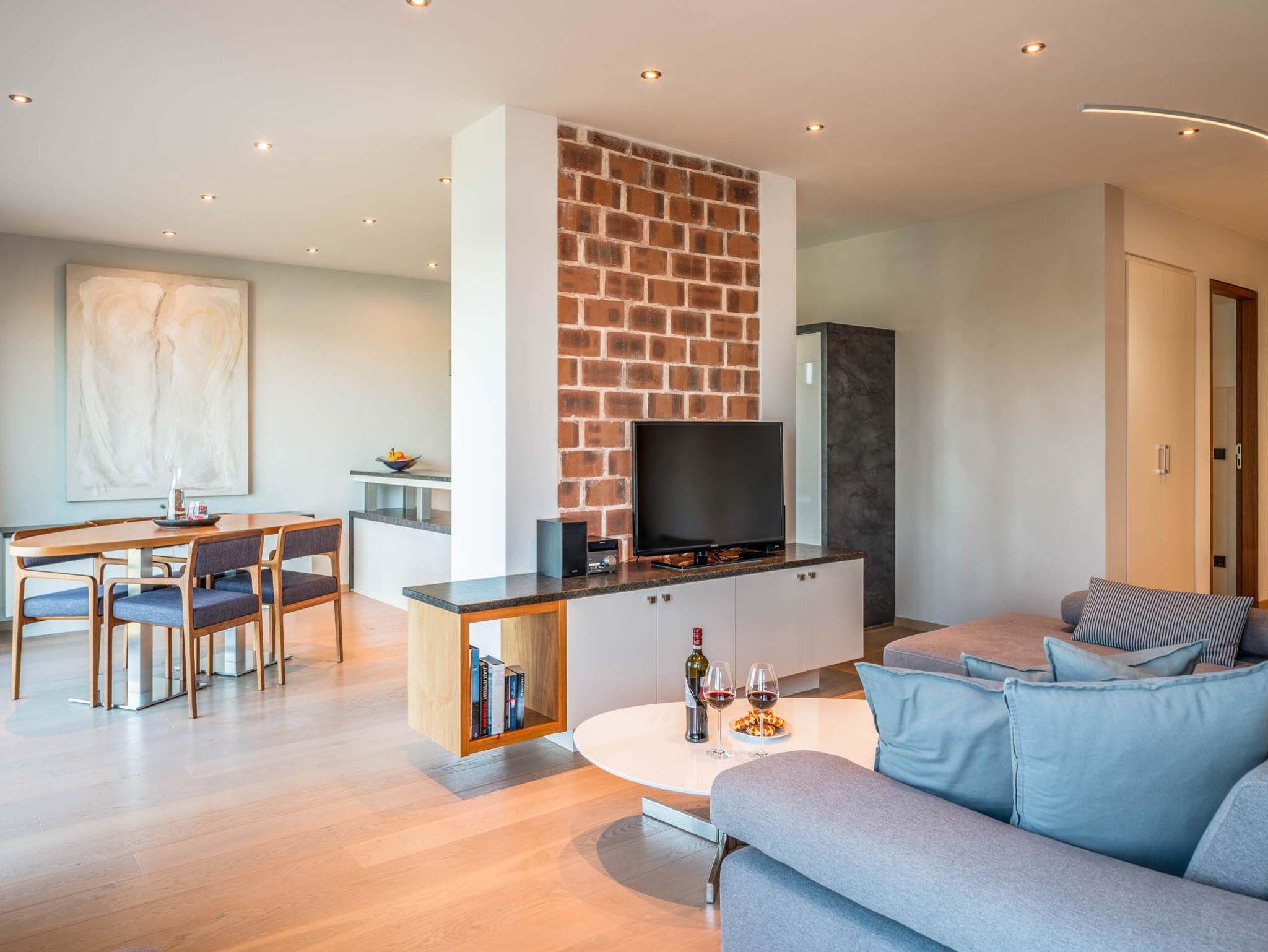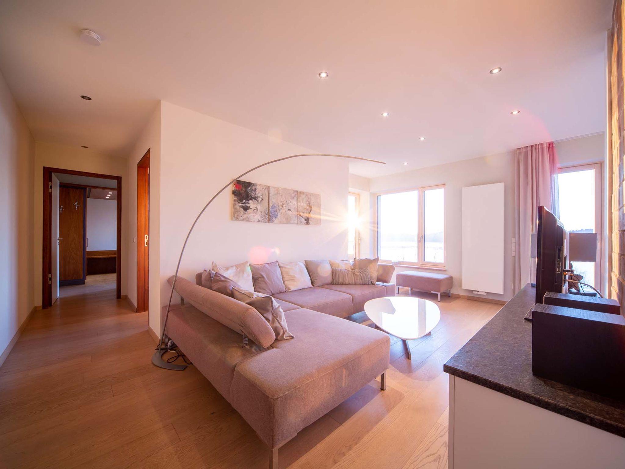 Atmos überzeugt durch Exklusivität, eine klare, sachliche Formensprache und den unvergleichlichen Weitblick durch das große Panoramafenster. Das Appartement verfügt über einen offenen Wohnraum, zwei Schlafzimmern, zwei Bäder und einem Balkon. Eine besondere Raffinesse stellt das Schlafzimmer mit den Flügeltüren dar, dessen Doppelbett sich mühelos nach draußen auf den Balkon rollen lässt, um in lauen Sommernächten direkt unter den Sternen zu träumen. Eine Ferienwohnung zum Verlieben!