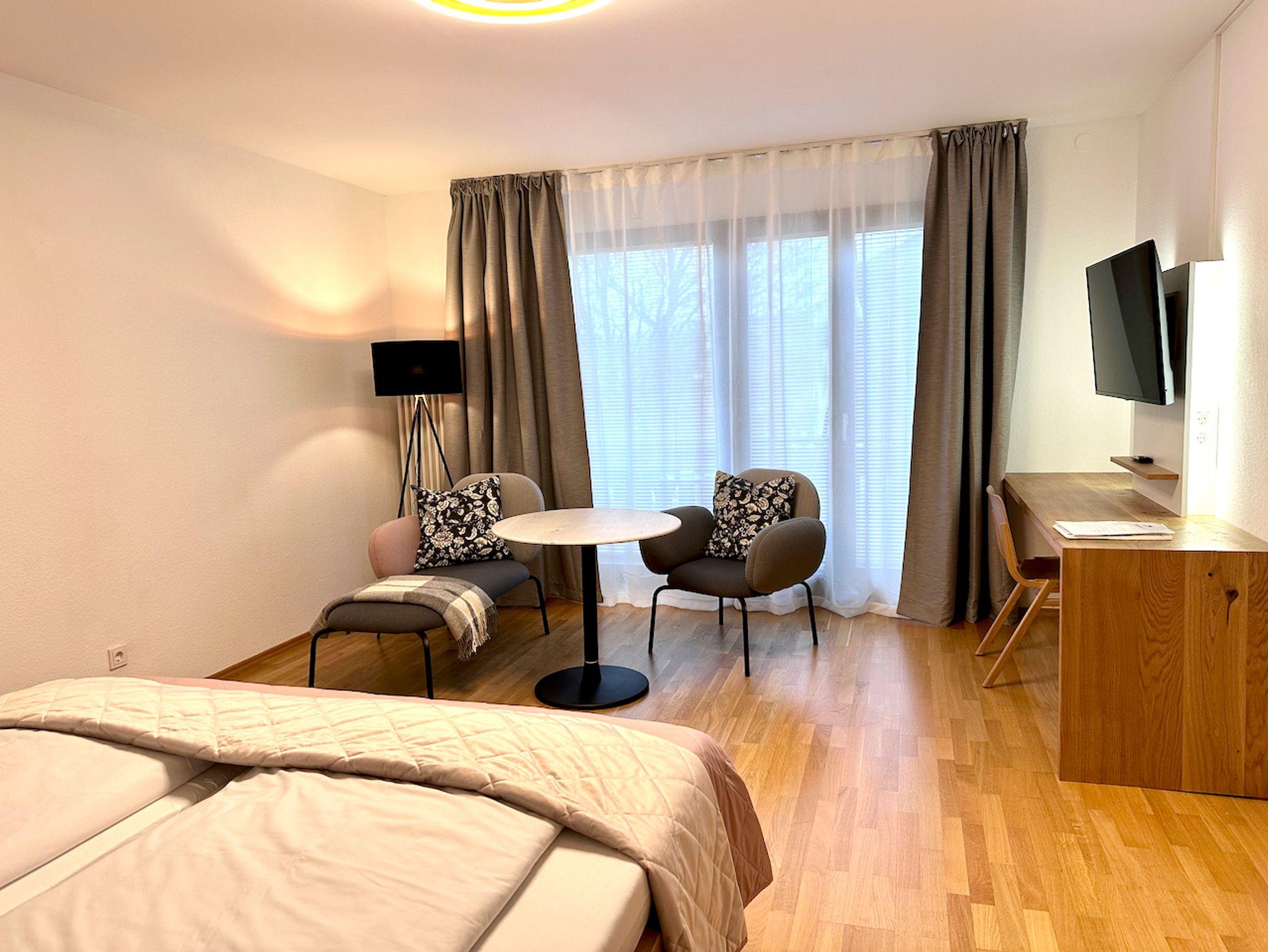 Sie wohnen in einem gemütlichen Apartment mit großem Wohn-/Schlafraum im ersten Stock mit Balkon. Das Apartment ist mit einem Doppelbett ausgestattet. Zudem verfügt es über eine Miniküche ohne Backofen mit Kochfeld im Eingangsbereich, mit der Sie eine Brotzeit oder Pause sehr gut zubereiten können. Im Wohn-/Schlafraum ist eine Sitzgruppe vorhanden. Der Balkon ist geräumig und mit einer Sitzgruppe und einem Sonnenschirm ausgestattet. Ein PKW-Stellplatz ist vorhanden. WLAN ist kostenfrei. Die Chiemgau Thermen sind ca. 200 m entfernt und der Bahnhof in 5 Minuten fußläufig erreichbar.