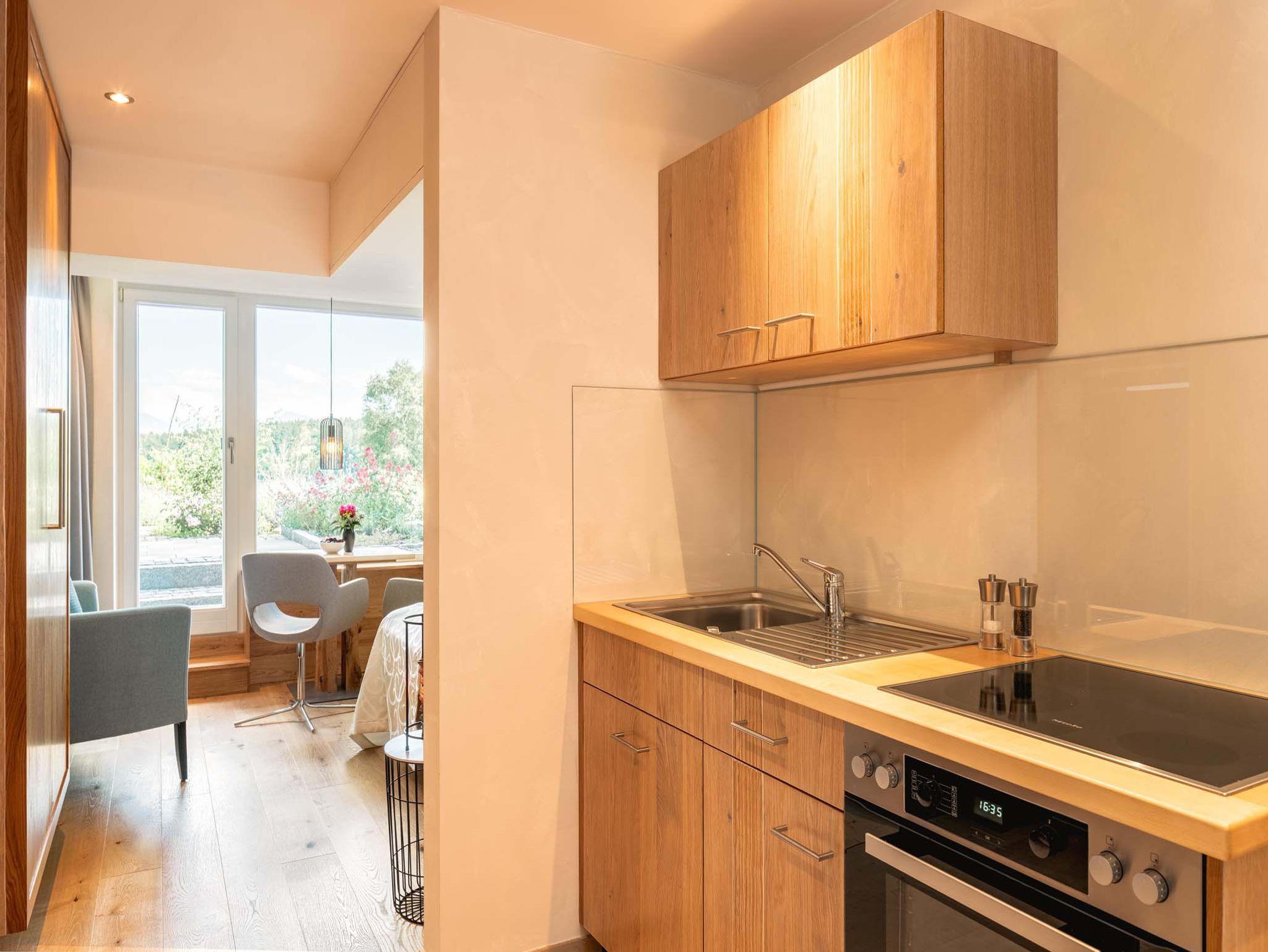 Gartenzimmer - umgeben von Pflanzen und Natur! Dieses helle und gemütliche 1-Zimmer-Appartement hat einen eigenen abgetrennten Terrassenbereich. Wie alle unsere Appartements hat auch das Gartenzimmer einen separaten Wohnungseingang. Das abgeschlossene Badezimmer verfügt über eine Dusche. Der Wohn- und Schlafbereich ist ein einziger Raum, wobei die Küche sich im vorderen Teil befindet, Schlafen und Wohnen im hinteren Teil, von dort aus ist auch der Zugang zur Terrasse.