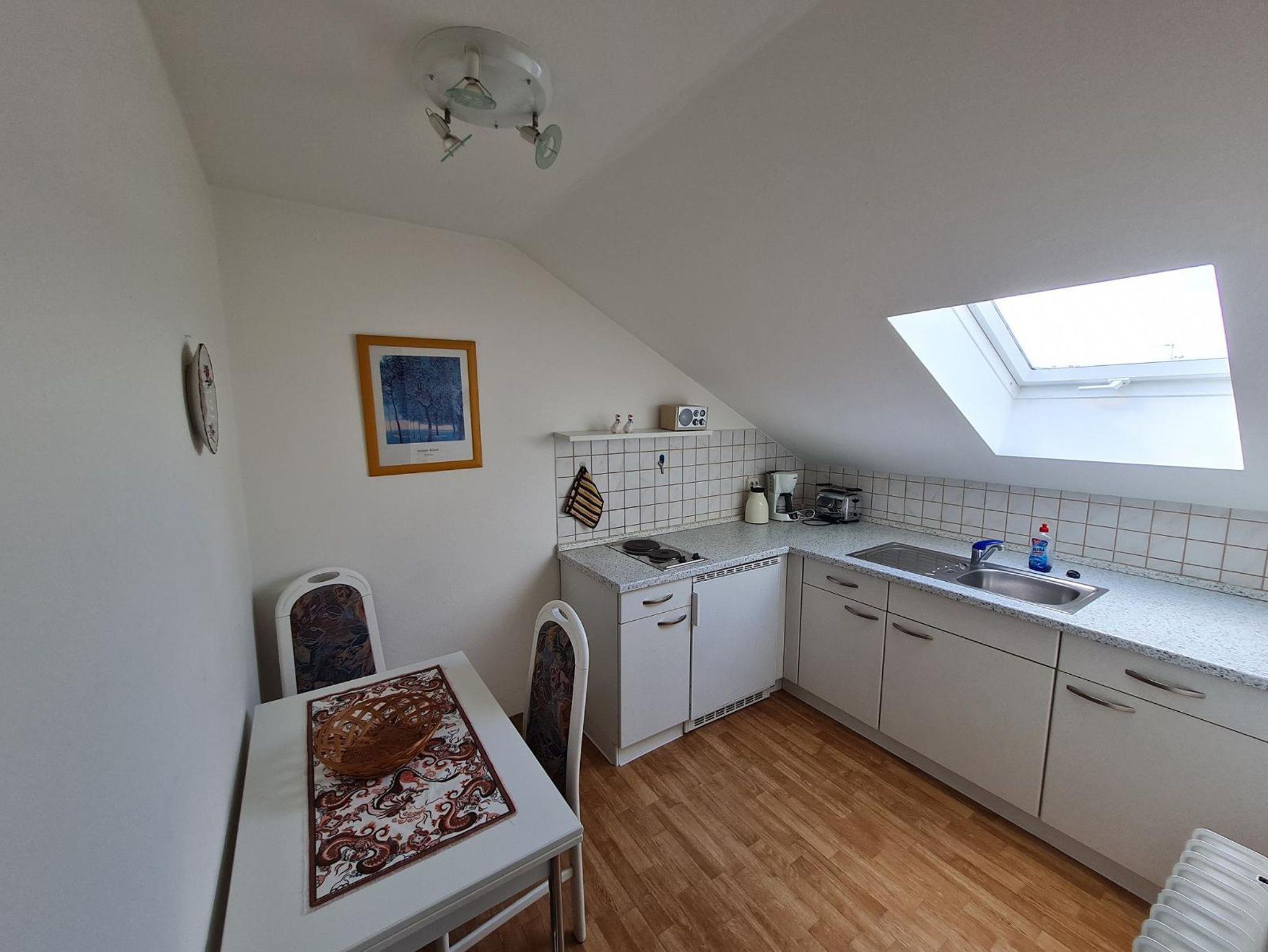 In der großen hellen Küche befindet sich eine Küchenzeile, Kaffeemaschine, Toaster, Wasserkocher, Kühlschrank und 2 Kochplatten, kein Backofen, Mikrowelle und die Essecke mit 3 Sitzplätzen.