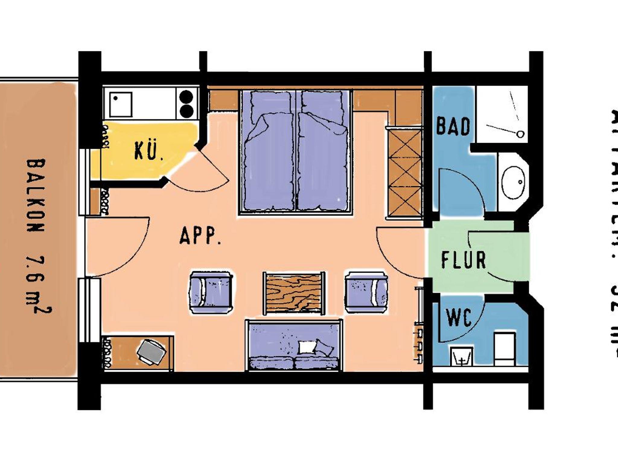 Einzimmerappartement mit 32m² (plus Balkon 7,6m²), mit feststehenden Betten, Massivmöbeln, komplett