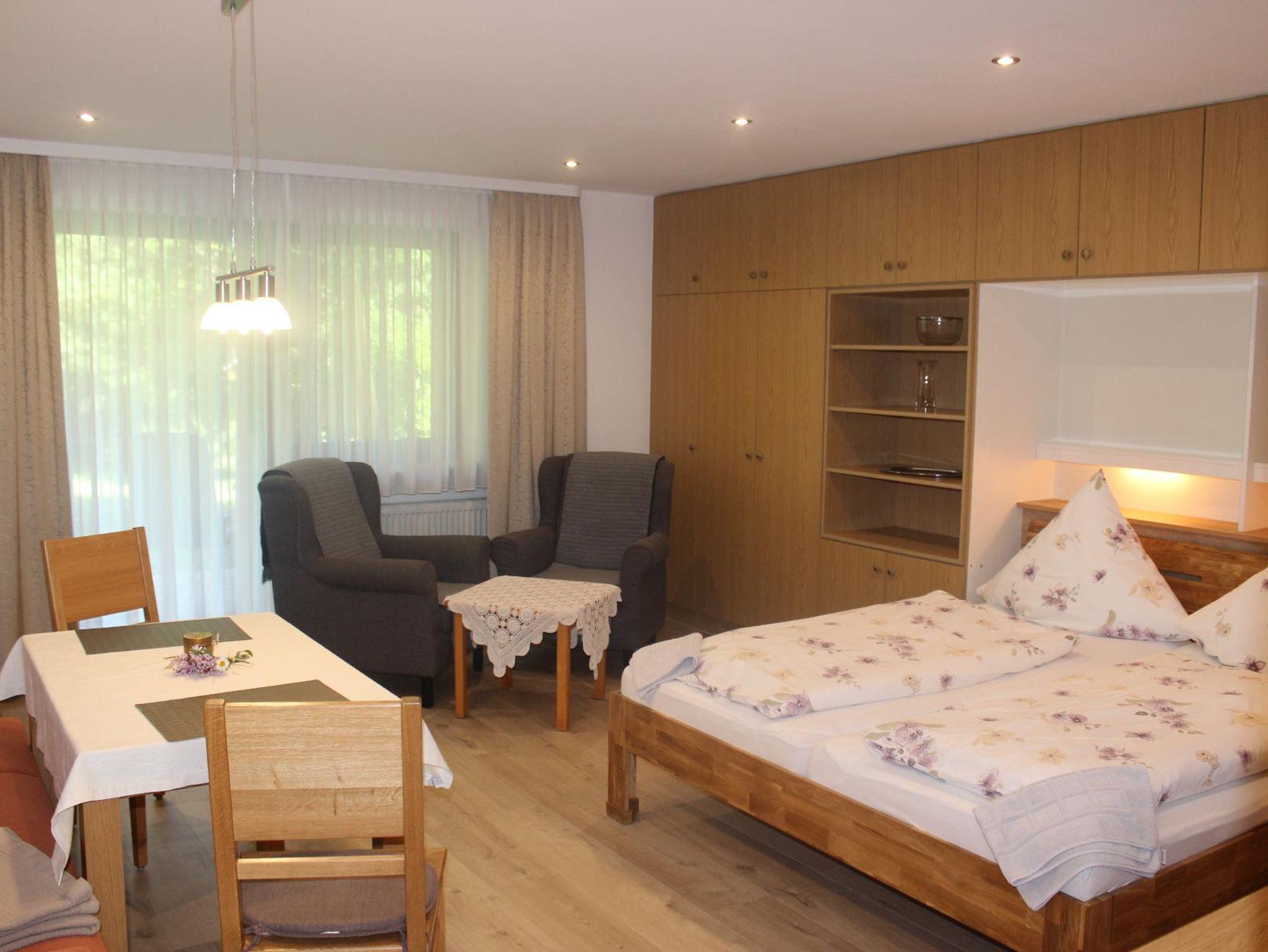 Das wohnliche Appartement im 1. Stock verfügt über einen Balkon mit Sitzmöglichkeit und Aussicht zum schönen Garten mit Bachlauf. Die Einrichtung umfasst neben Dusche/WC eine neue Küchenzeile mit Kühlschrank inkl. Gefrierfach, Koch- und Speisegeschirr, sowie eine Kaffeemaschine, einen Wasserkocher und einen Toaster. Der Wohn-Schlafraum ist mit einem Doppelbett, Einbauschrank, Schlaf-Couch und Esstisch mit Stühlen, SAT Farb-TV, 2 Fernsehsessel, sowie Radio ausgestattet. Bettwäsche, Handtücher und Geschirrtücher sind vorhanden. Es steht ein überdachter Stellplatz im Carport zur Verfügung.
