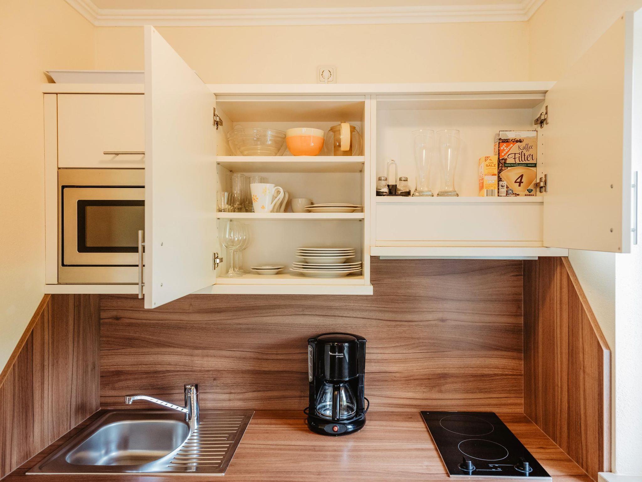 Unser helles 2-Zimmer Premium-Appartement ist etwa 46 qm groß und besteht aus einem Schlafzimmer mit einem bequemen feststehenden Doppelbett, einem Wohnzimmer mit Kleinküche und Essplatz. Freuen Sie sich über den Luxus einer Spülmaschine, Mikrowelle und einer gemütlichen Eckbank. Die Dusche ist flach zugänglich, das WC separat. Genießen Sie am Nachmittag und am Abend die Sonne auf dem großzügigen Balkon. Alle Appartements sind im klassischen Stil hochwertig möbliert und befinden sich in ruhiger Lage in Bad Füssing.