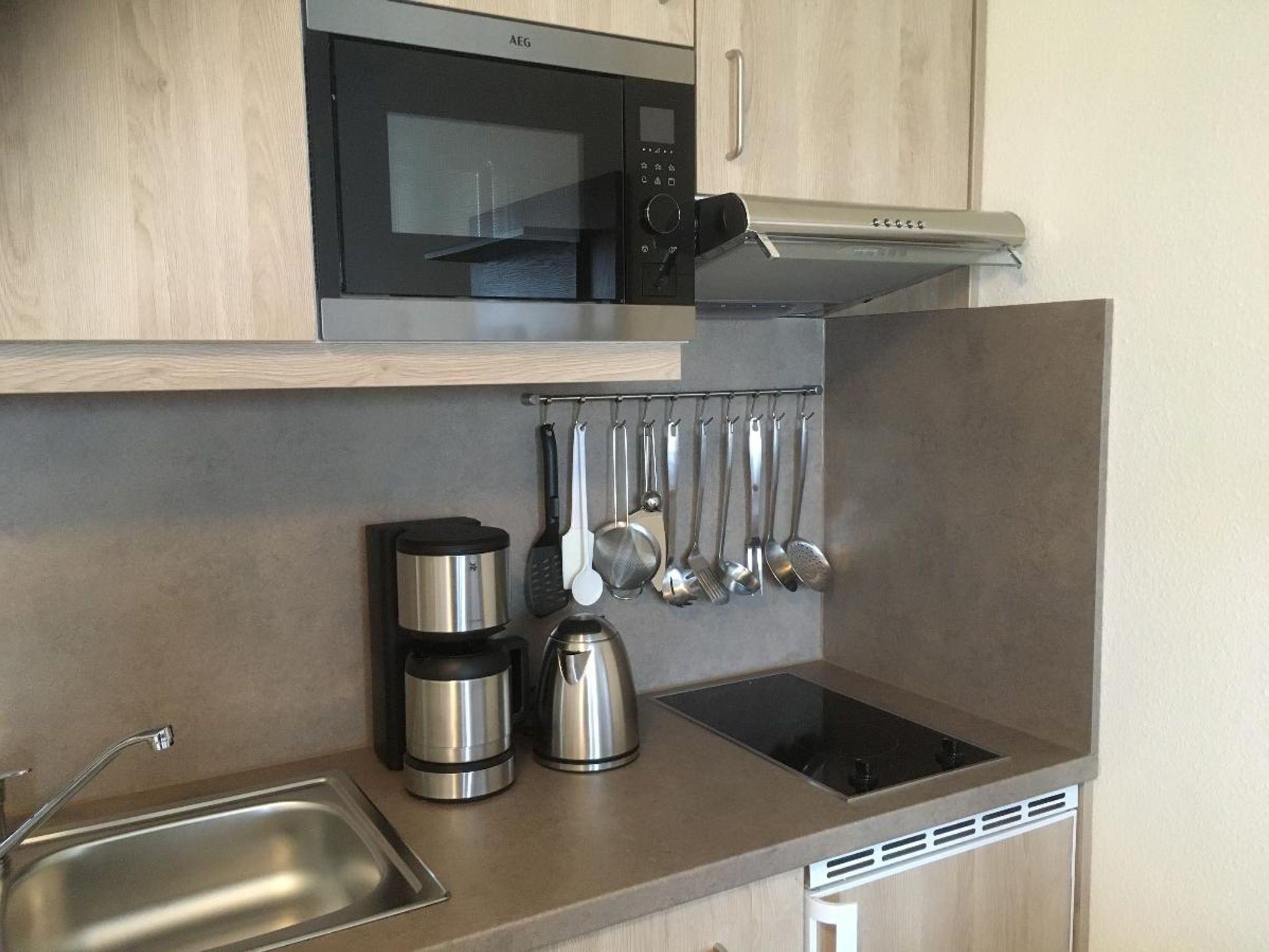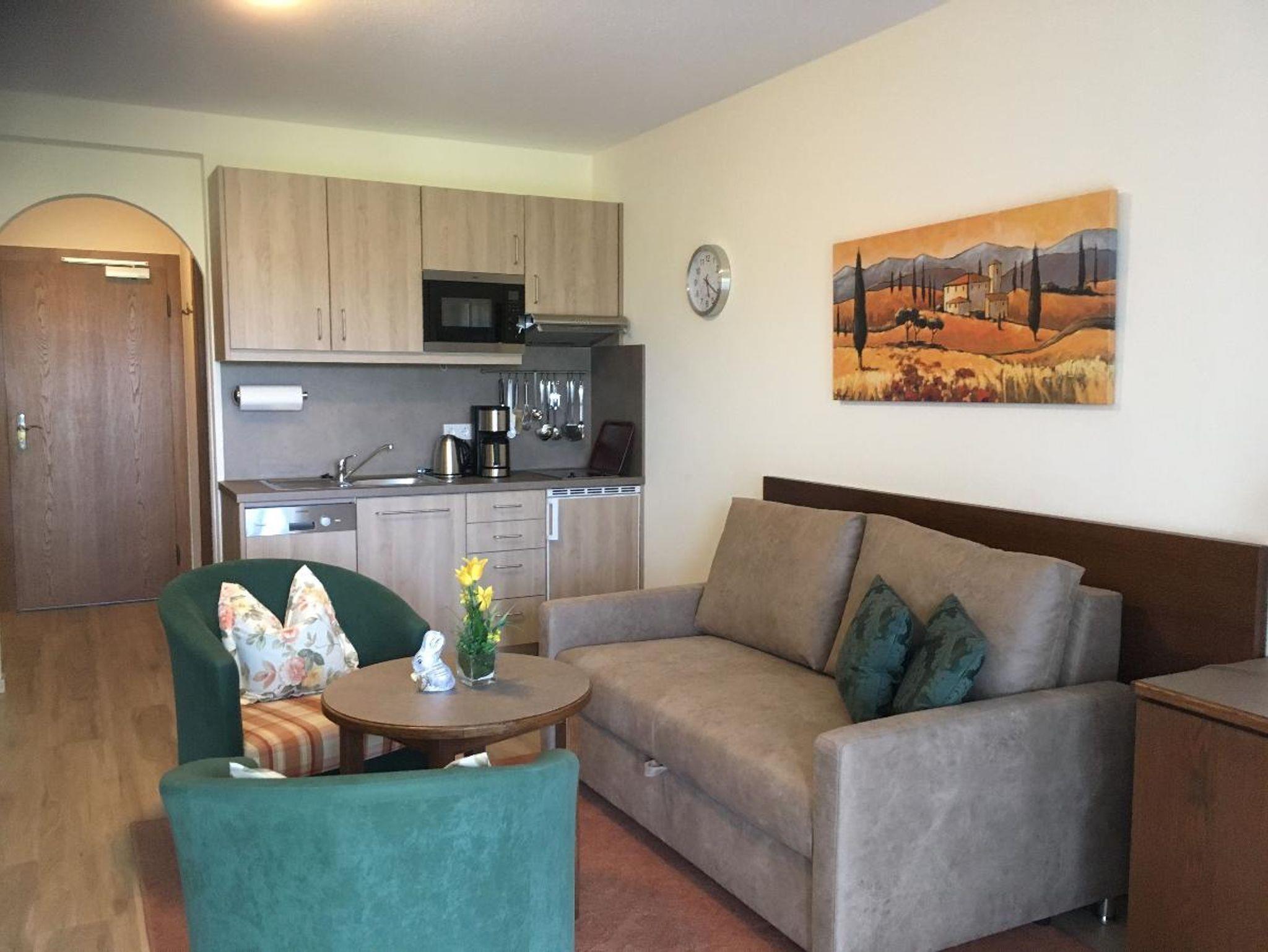 Im 1. OG mit 1 Balkon, Einzelbett, WC mit Dusche, Couchgarnitur, Esstisch und moderner Küchenzeile mit Spülmaschine mit ca. 28 m2 Wohnfläche für 1 Person.