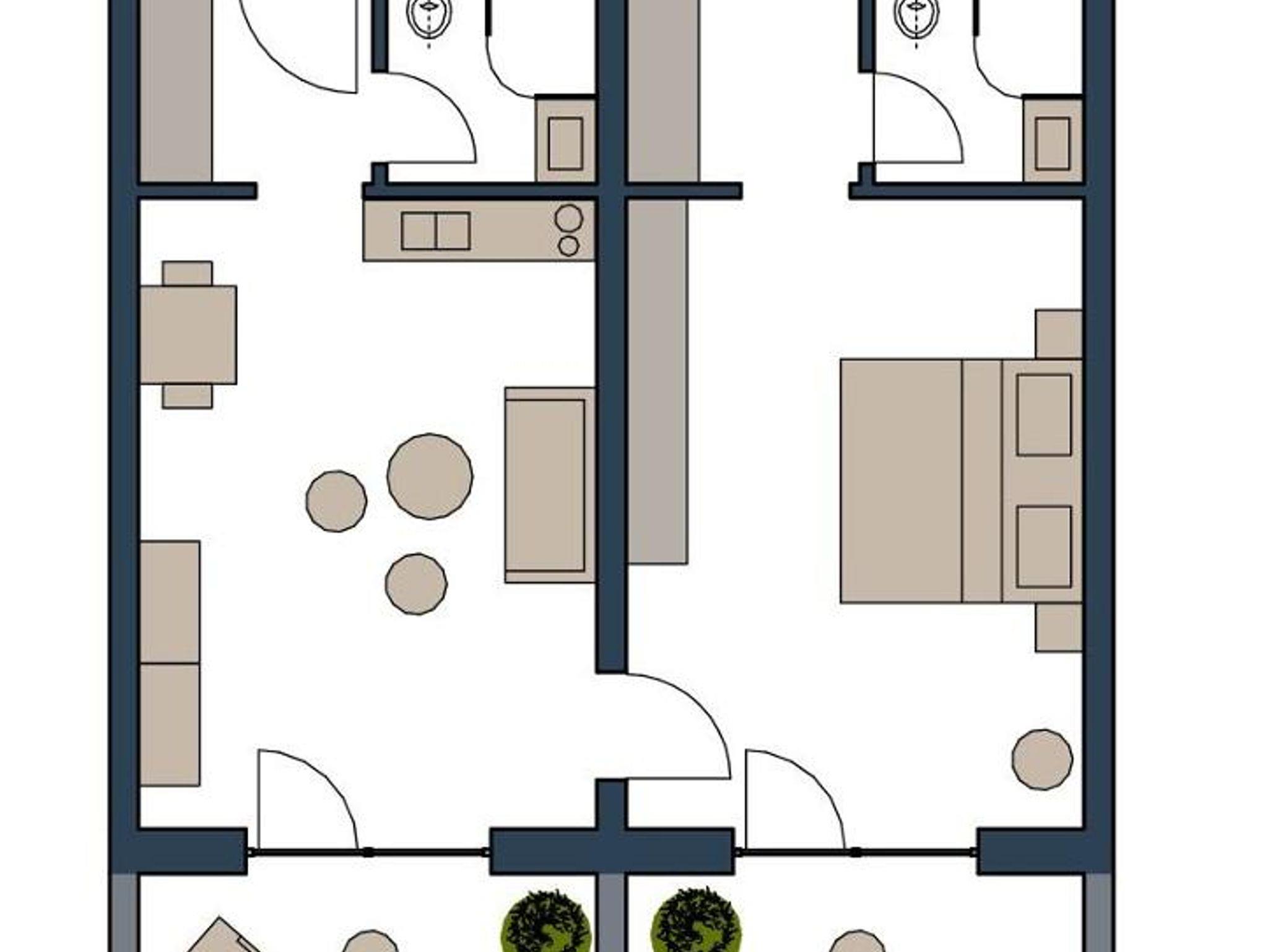 Drei im EG mit großer Terrasse und 2 im 1. OG mit 2 Balkonen, Schlafzimmer mit Doppelbett, 2 WC mit Dusche, Wohnraum mit Couchgarnitur, Esstisch und moderner Küchenzeile mit Spülmaschine mit ca. 55 m2 Wohnfläche für 1-2(3) Personen. Die Couch in allen neuen Appartements ist ausziehbar, 2 Appartements verfügen auch noch über eine ausziehbaren Schlafsessel im Schlafzimmer.
