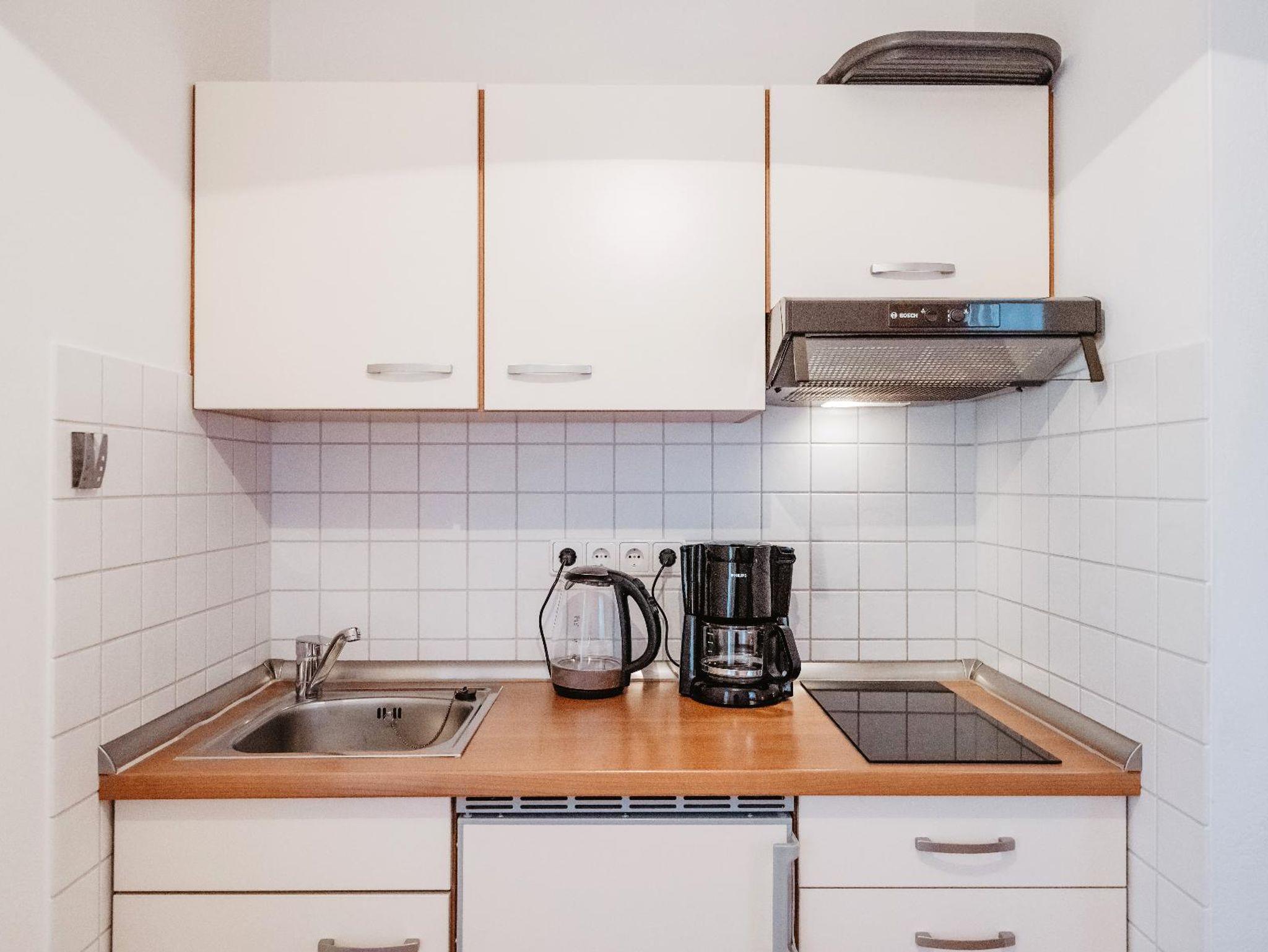 ist mit einer Essecke, einer komplett eingerichteten Küche (Zweiplattenherd, Wasserkocher, Kaffeemaschine, Toaster, Geschirr,