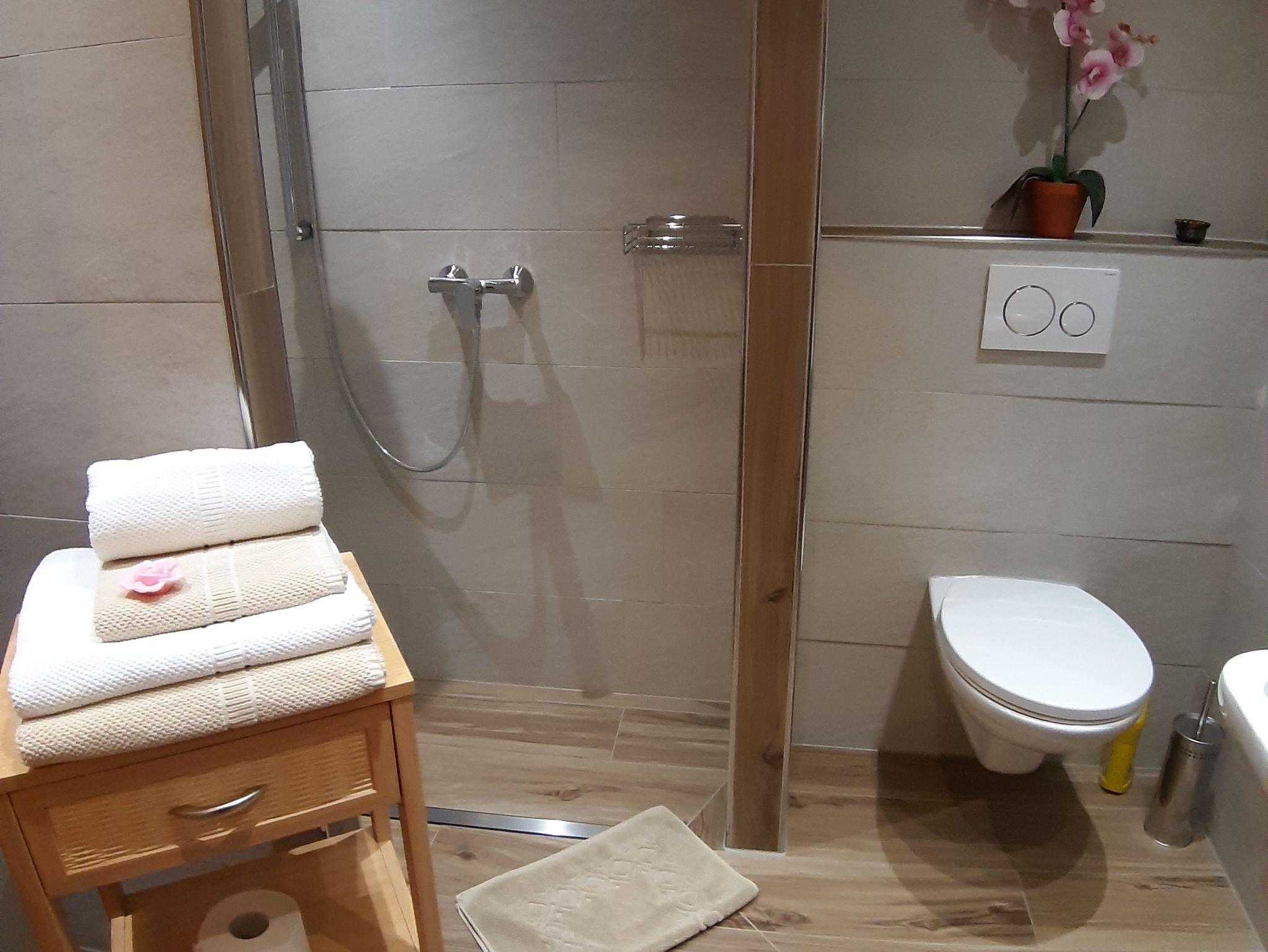 Bad mit Dusche und WC. Gut ausgestattete Küche grenzt direkt an den Wohnbereich mit Essecke.