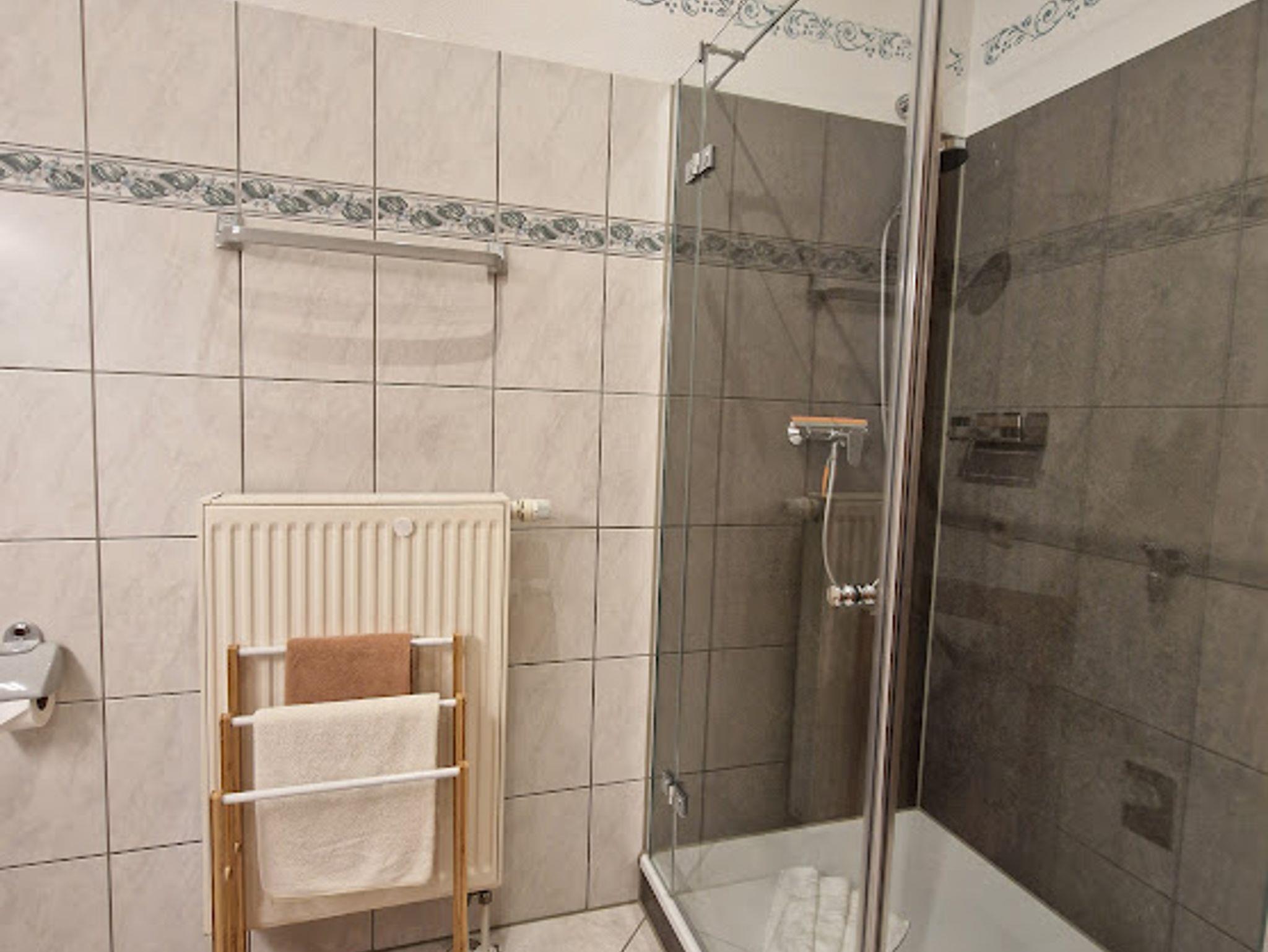 Das Bad ist ausgestattet mit WC, Dusche, Föhn und Handtücher.