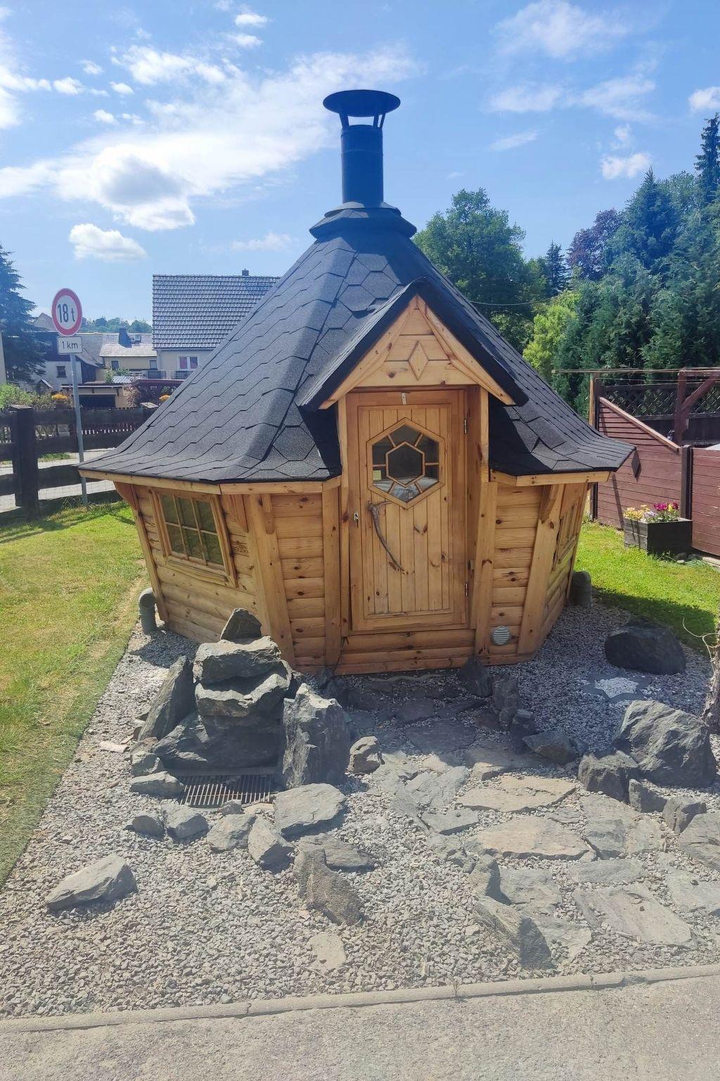 Hiking trails lead directly along the property, inviting you to take long walks. The Saxon Switzerland National Park is 24 km from the holiday home and the Dresden Panometer is 33 km away. The nearest airport is Dresden Airport, approx. 50 km from the farm shop. The visitor mine "Marie-Louise-Stolln" with its underground lake is in the immediate vicinity. Charmingly situated in the Gottleuba Valley on the border between Saxon Switzerland and the Ore Mountains, Bad Gottleuba-Berggießhübel offers a good starting point for hiking excursions in both regions. The town centre with its numerous shopping facilities is approx. 10 minutes away by car. You can reach the border to the Czech Republic in approx. 3 minutes, Saxon Switzerland and the Eastern Ore Mountains in 30 - 60 minutes each. Hikers and mountain bikers get their money's worth in our Ore Mountains region. Tours in the neighbouring Czech Republic also offer unimagined possibilities and wonderful panoramic views of the Elbe Sandstone Mountains. The house is located directly at the bus stop on the village square in Hellendorf.